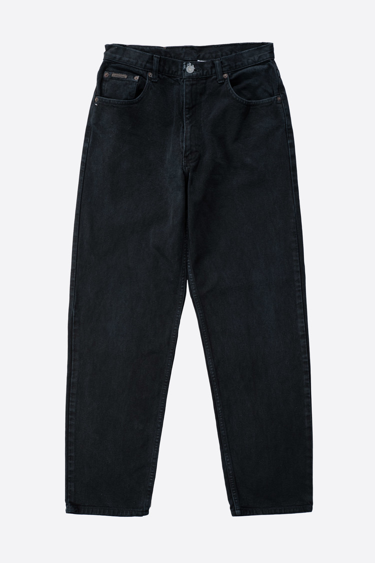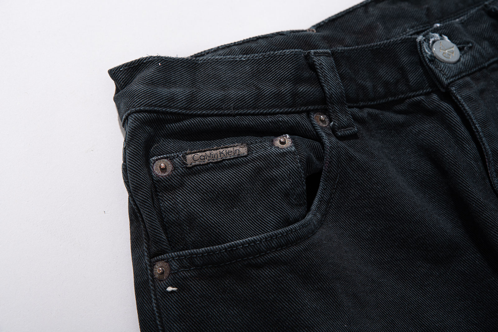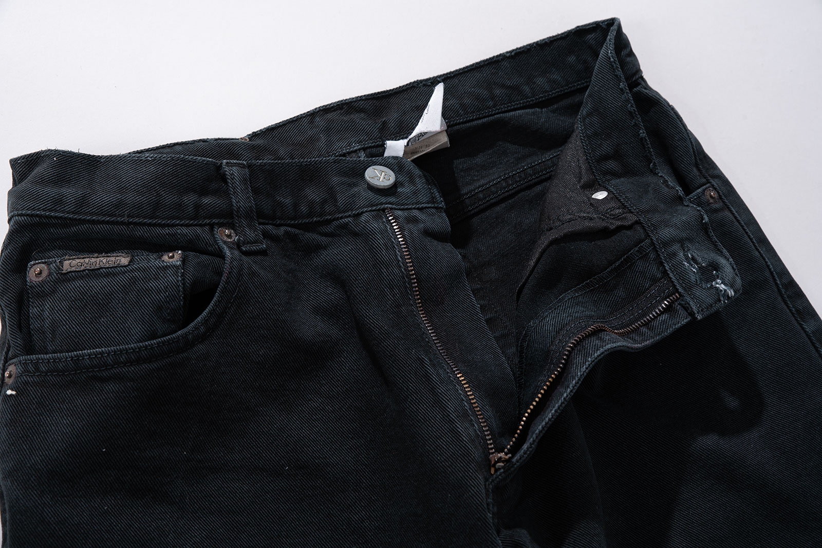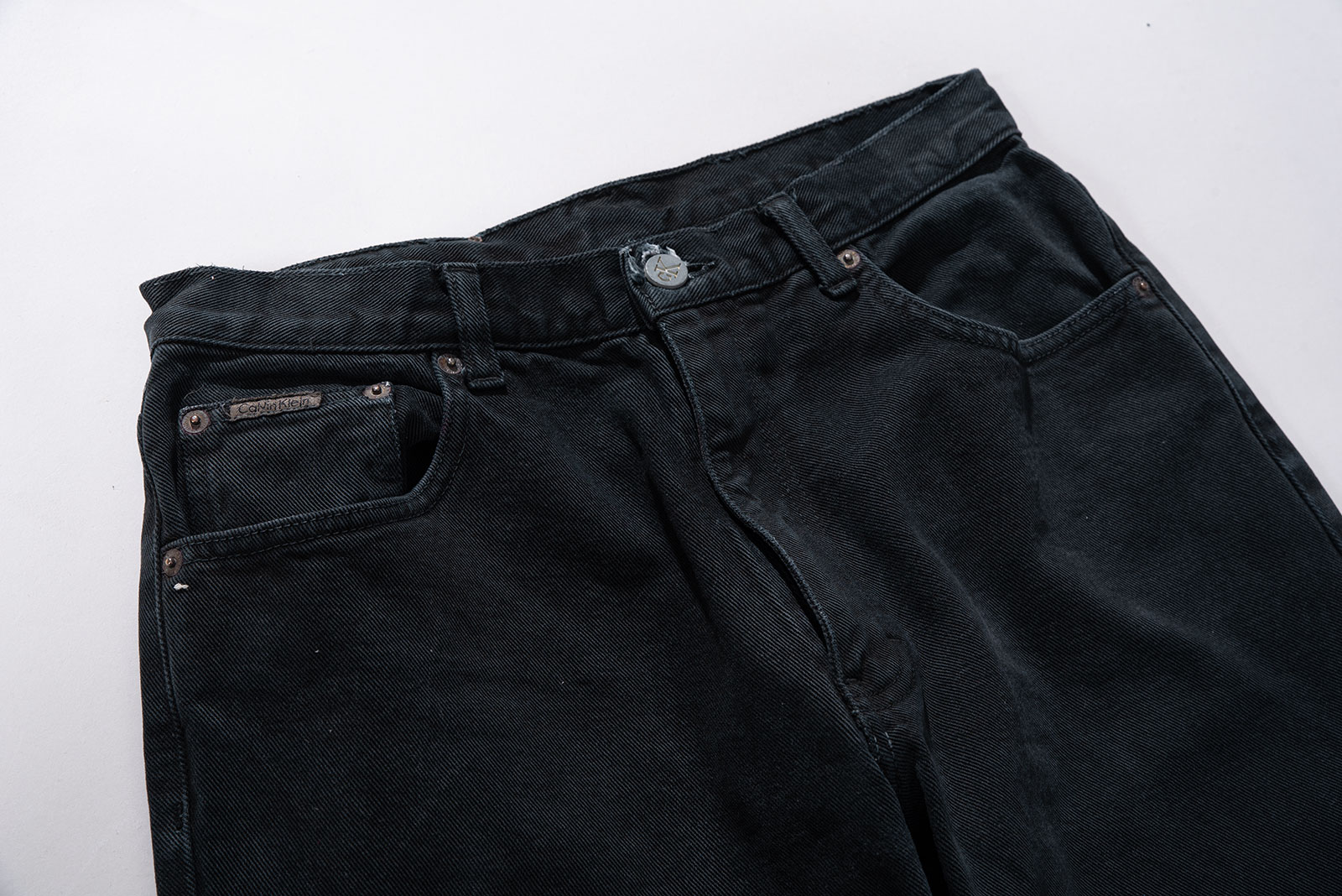 - 도시적인 시크 무드가 가득한 캘빈클라인의 이미지와는 달리, 90 s 캘빈클라인 데님들은 스케이터처럼 투박하고 반항적인 분위기가 있습니다. 소개하는 팬츠 역시 그렇고, 지금까지 다뤄 본 캘빈 90 s 진 들 중에선 가장 짙은 색을 가지고 있지 않나 싶네요.