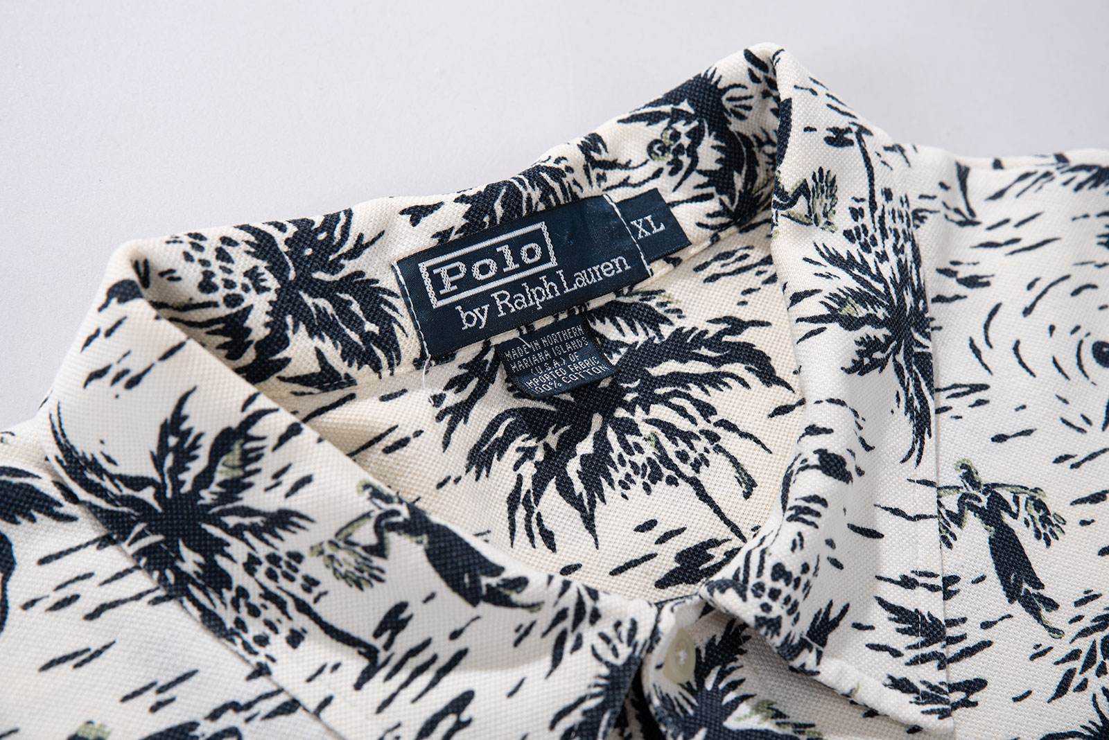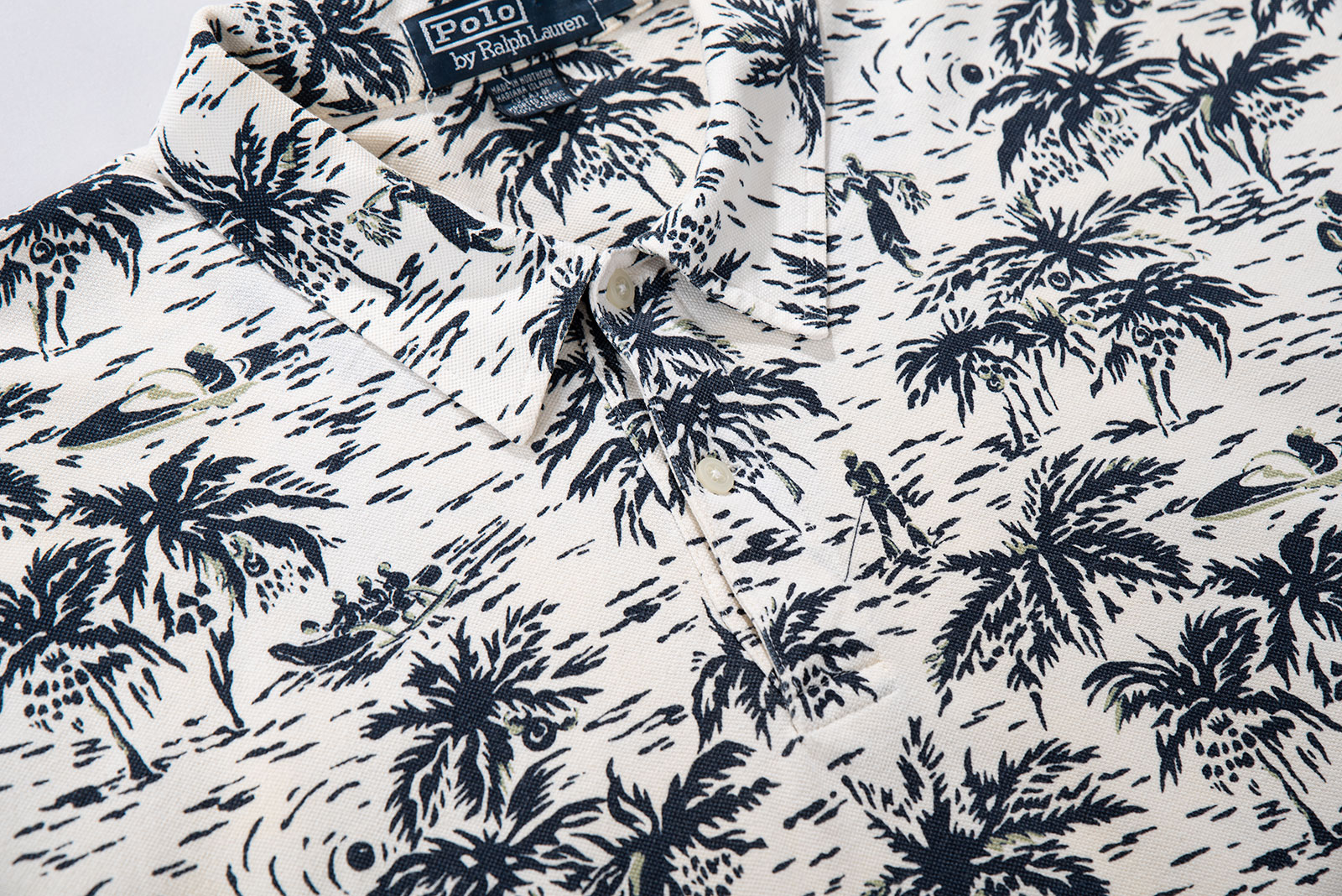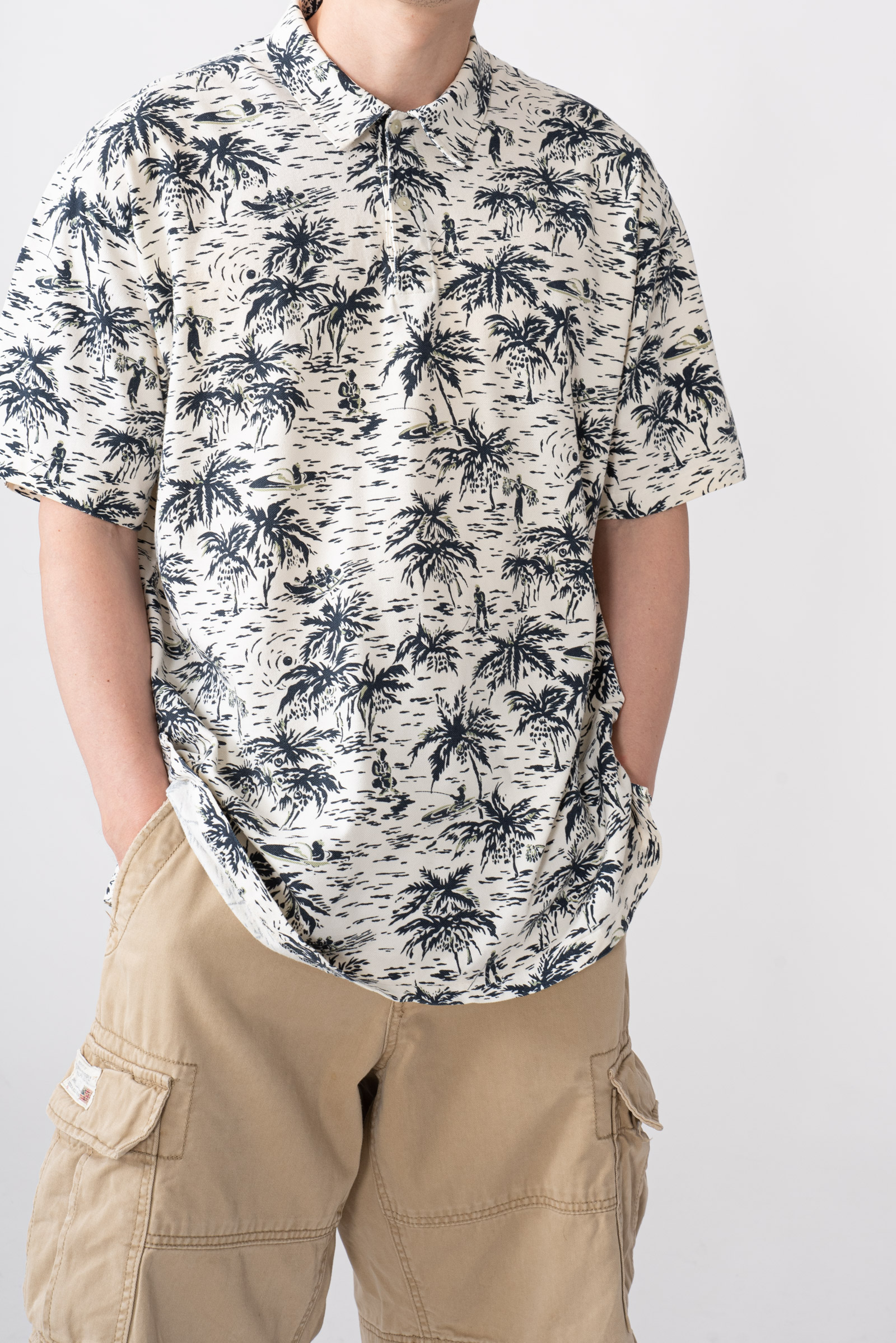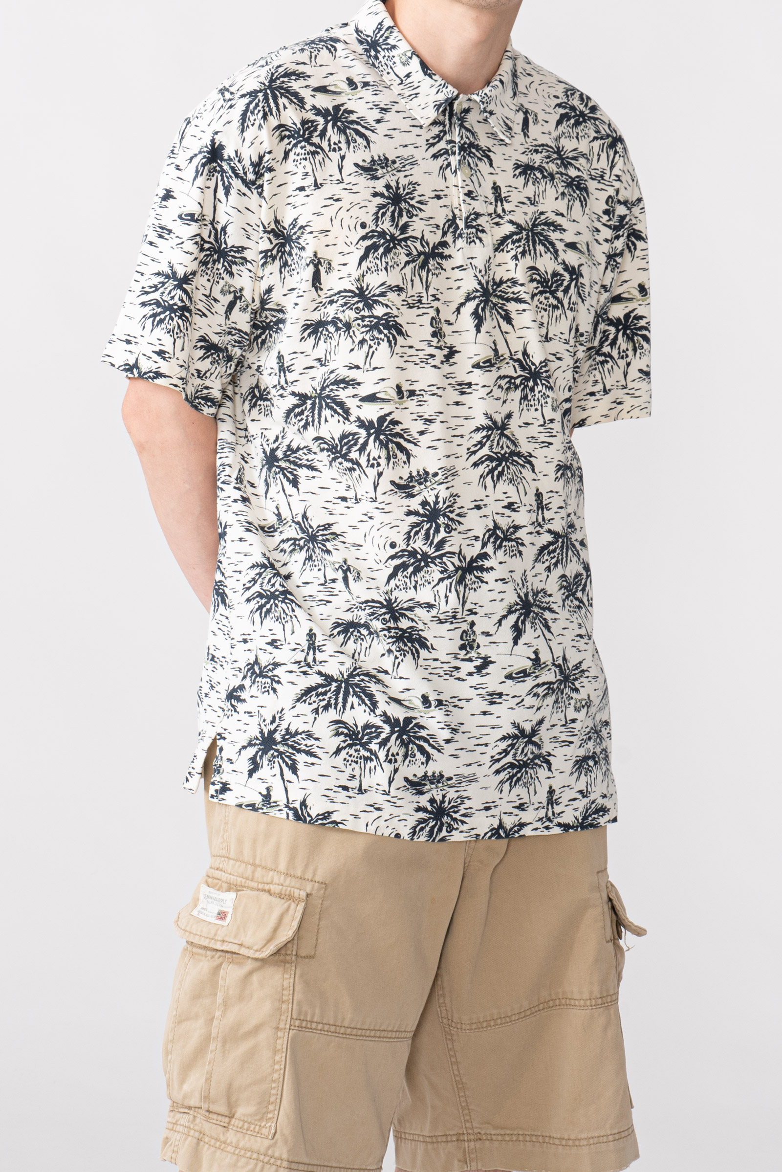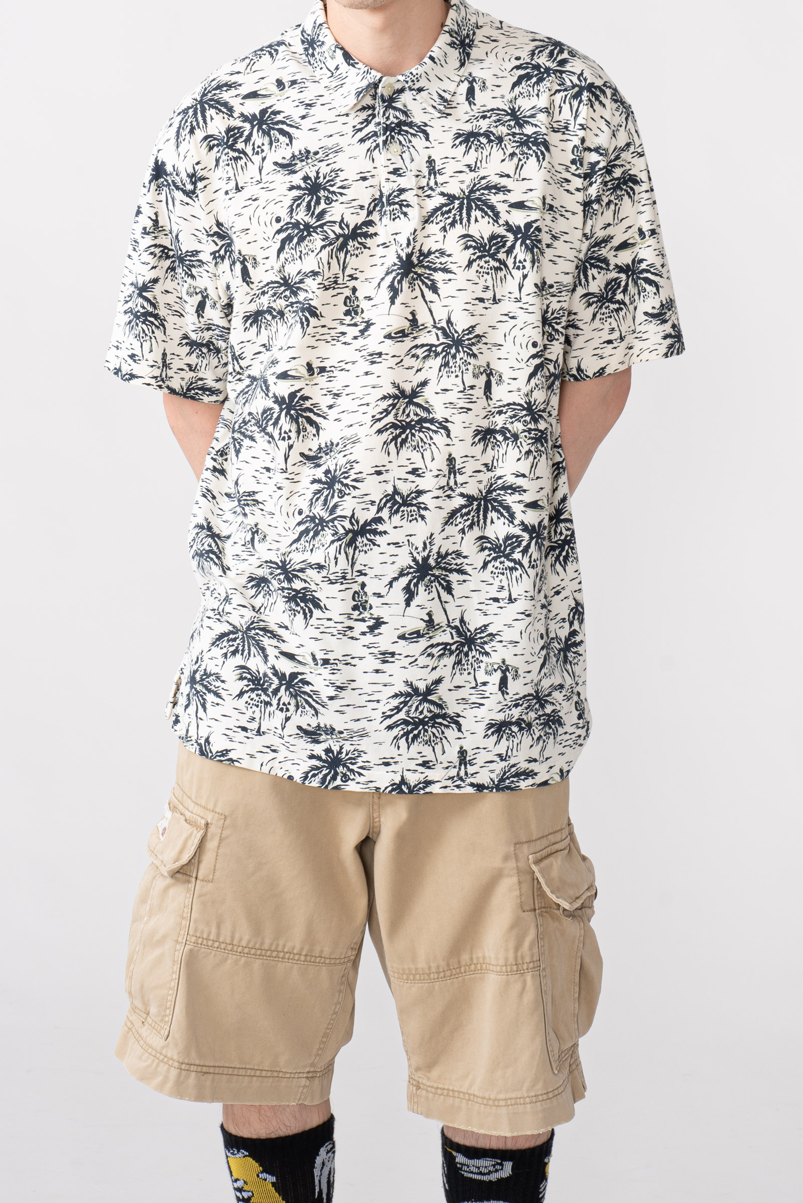 - 하와이안 패턴의 90 s 폴로 피케입니다. 셔츠형 타입인데 일반 피케처럼 흐물거리는 원단이 아니라 셔츠처럼 각이 잡히고 두툼하고 빳빳합니다. 직조 패턴이 3M 행주같은 느낌입니다. 아주 견고하고, 이게 과연 늘어나는 옷인가 하는 느낌이 있습니다.