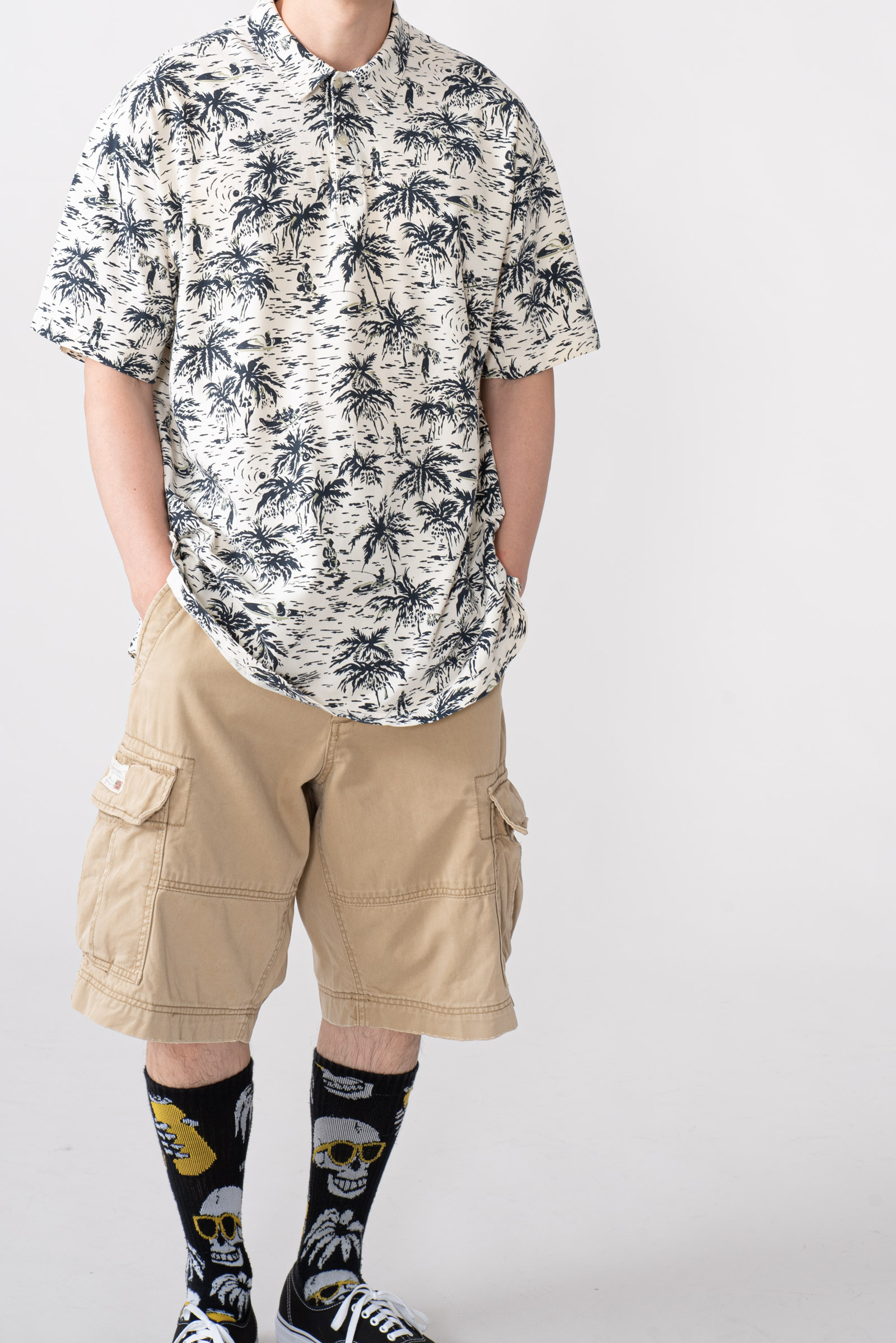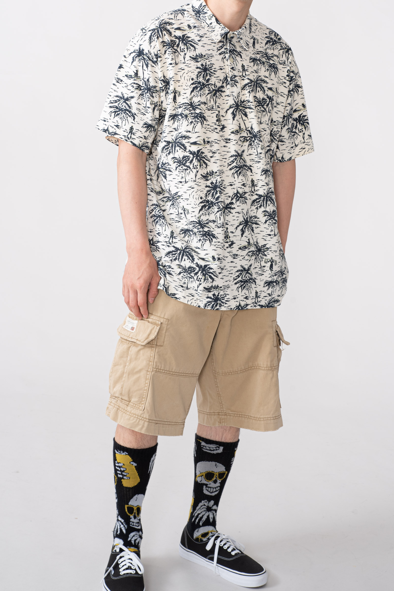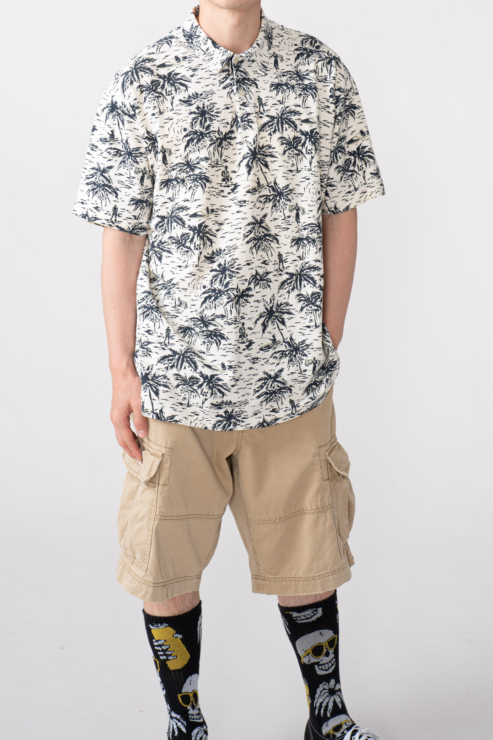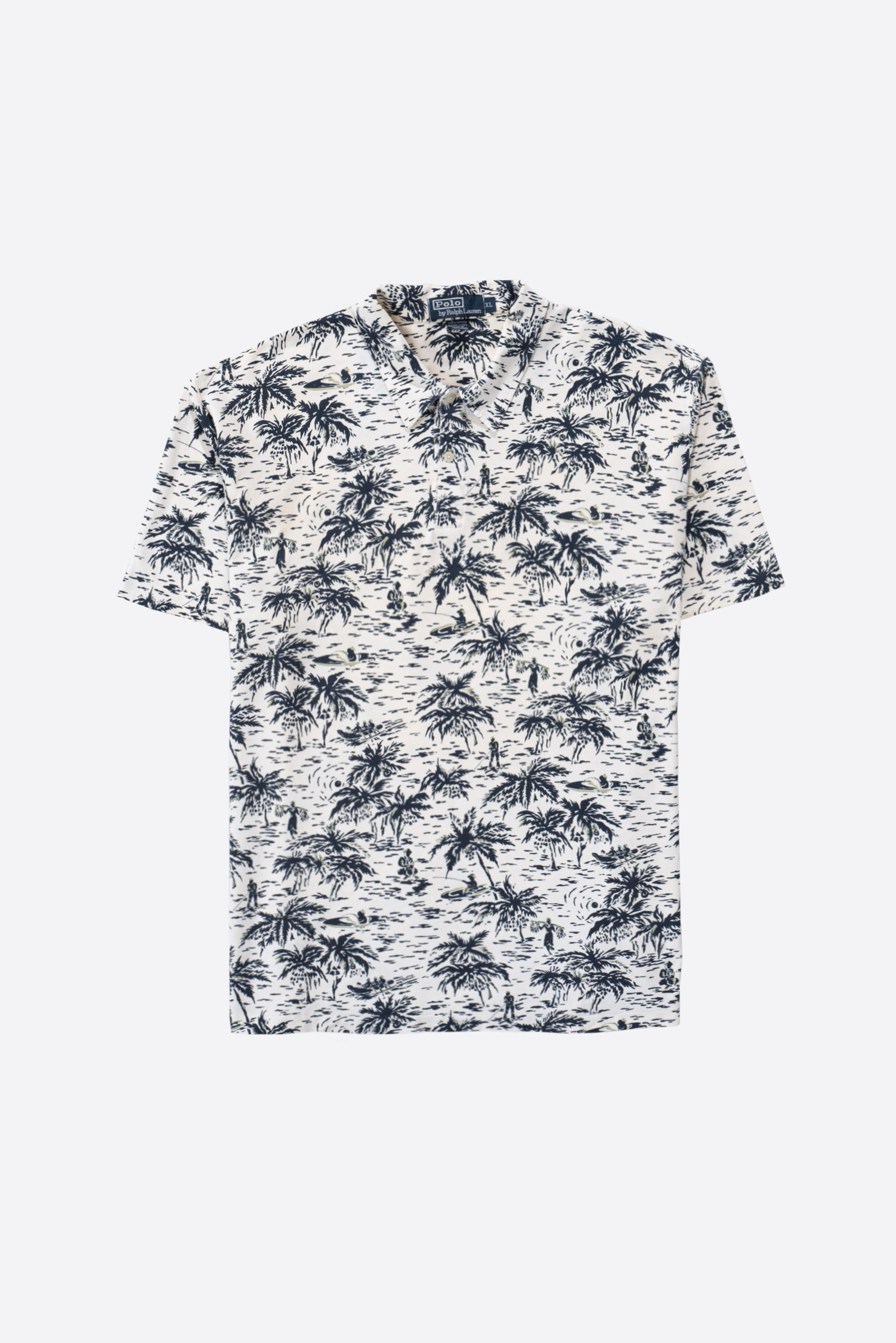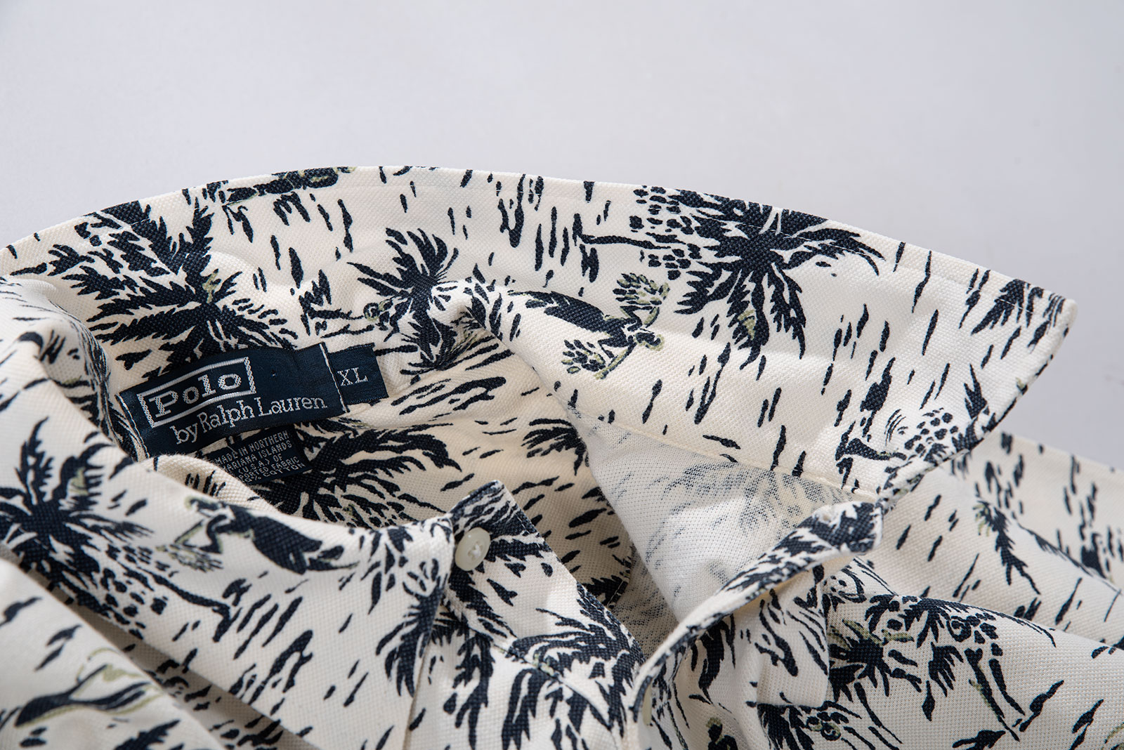 - 하와이안 패턴의 90 s 폴로 피케입니다. 셔츠형 타입인데 일반 피케처럼 흐물거리는 원단이 아니라 셔츠처럼 각이 잡히고 두툼하고 빳빳합니다. 직조 패턴이 3M 행주같은 느낌입니다. 아주 견고하고, 이게 과연 늘어나는 옷인가 하는 느낌이 있습니다.