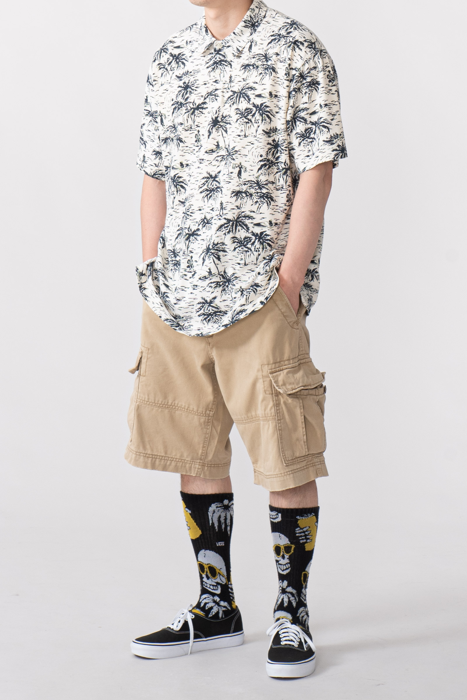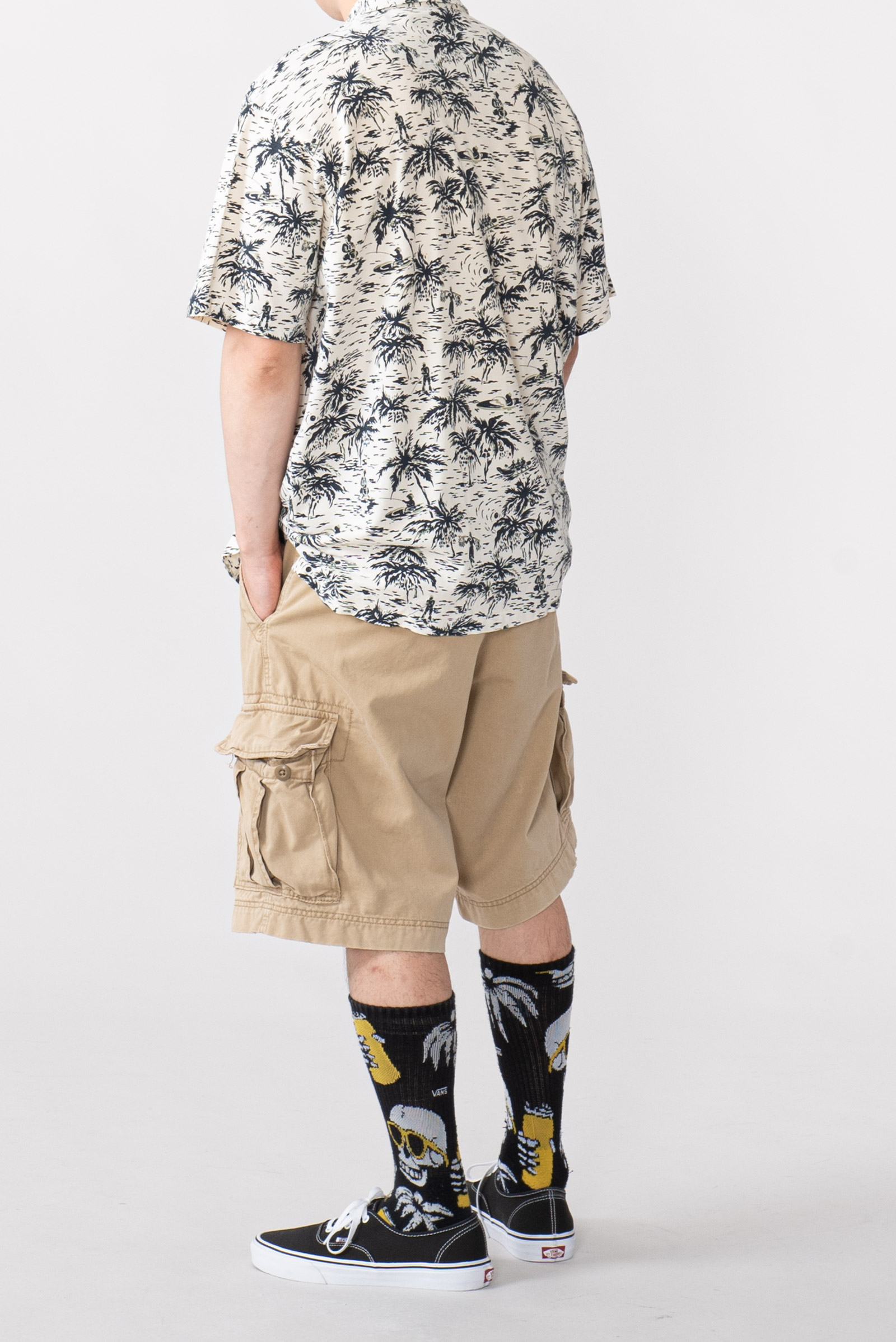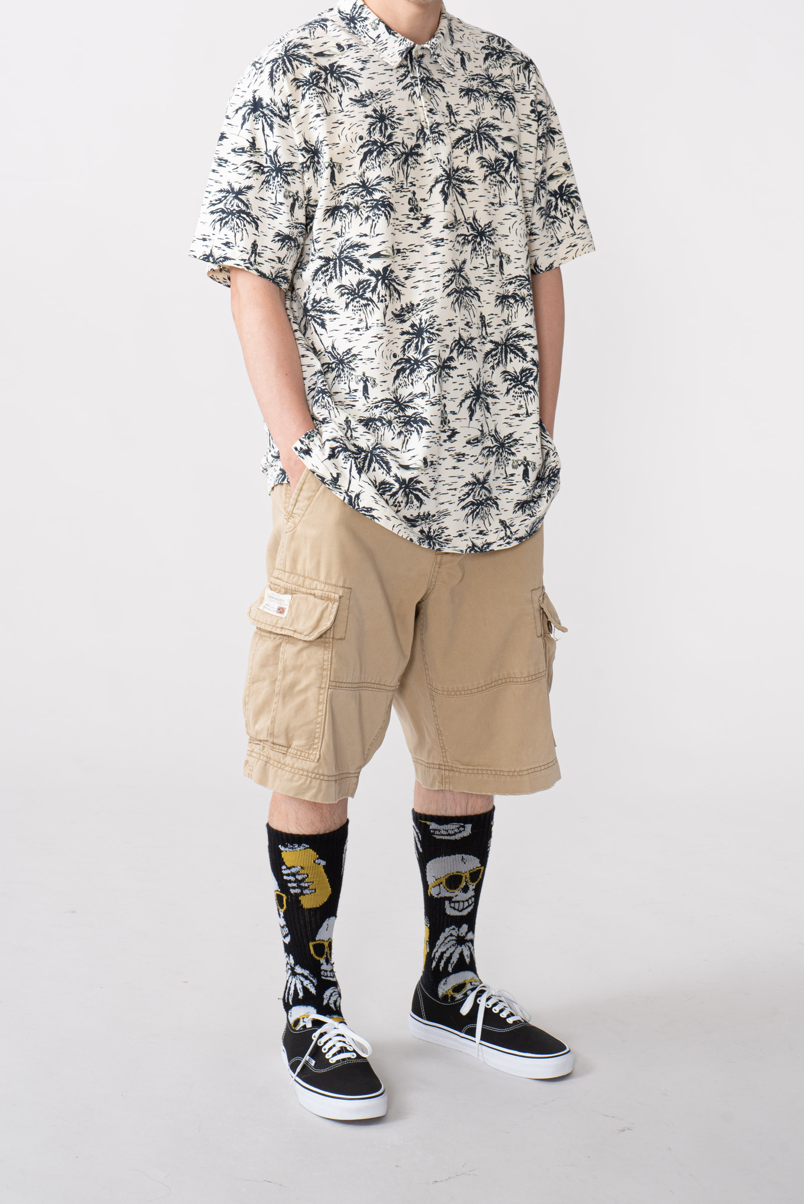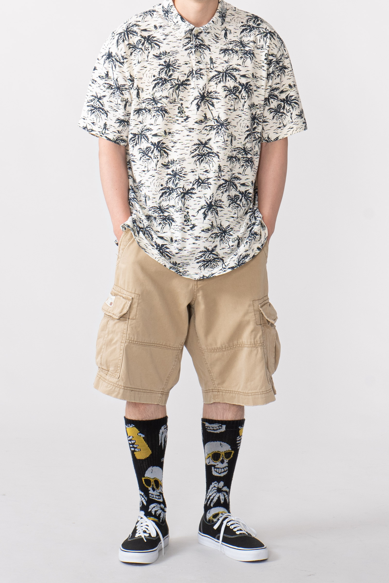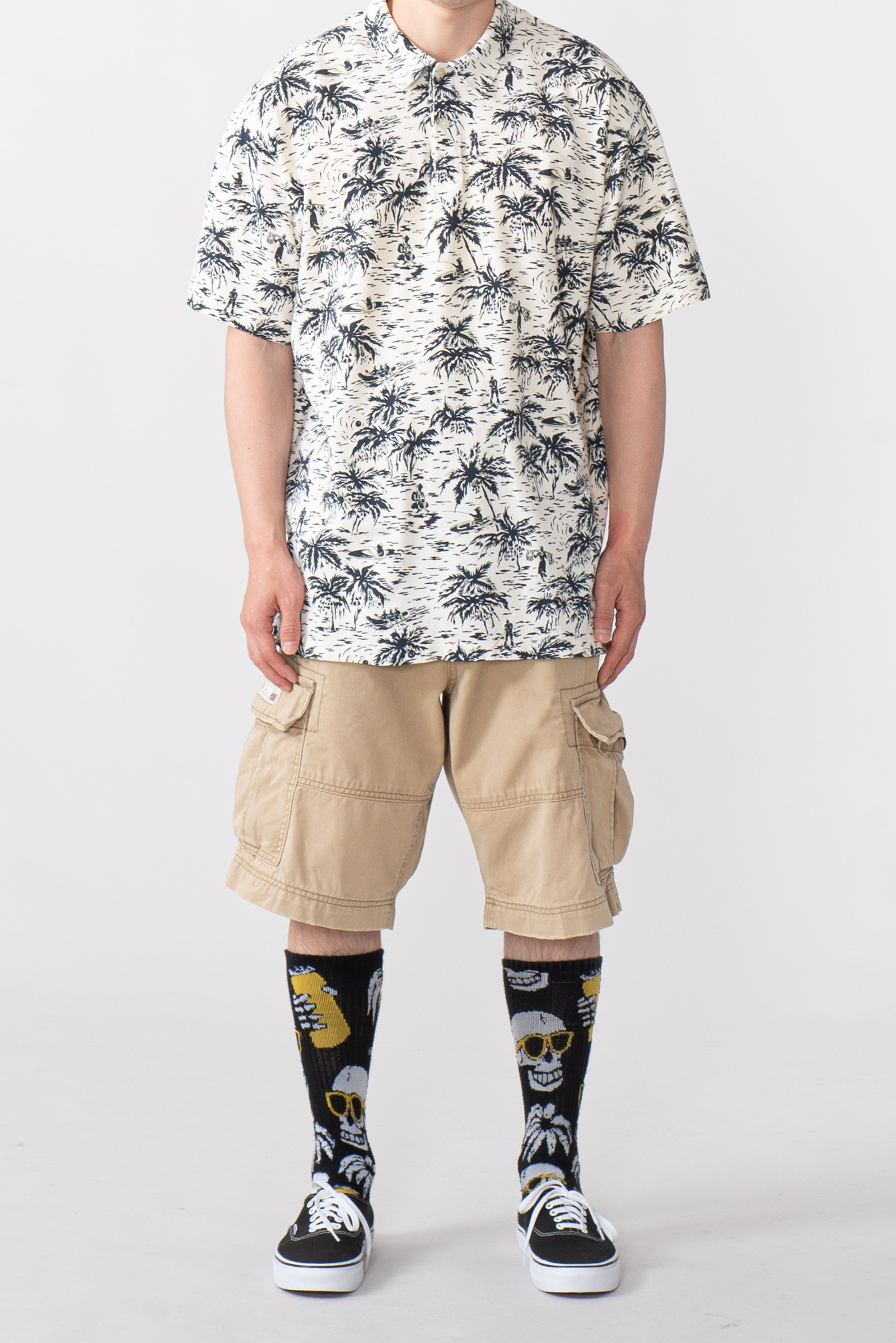 - 하와이안 패턴의 90 s 폴로 피케입니다. 셔츠형 타입인데 일반 피케처럼 흐물거리는 원단이 아니라 셔츠처럼 각이 잡히고 두툼하고 빳빳합니다. 직조 패턴이 3M 행주같은 느낌입니다. 아주 견고하고, 이게 과연 늘어나는 옷인가 하는 느낌이 있습니다.
