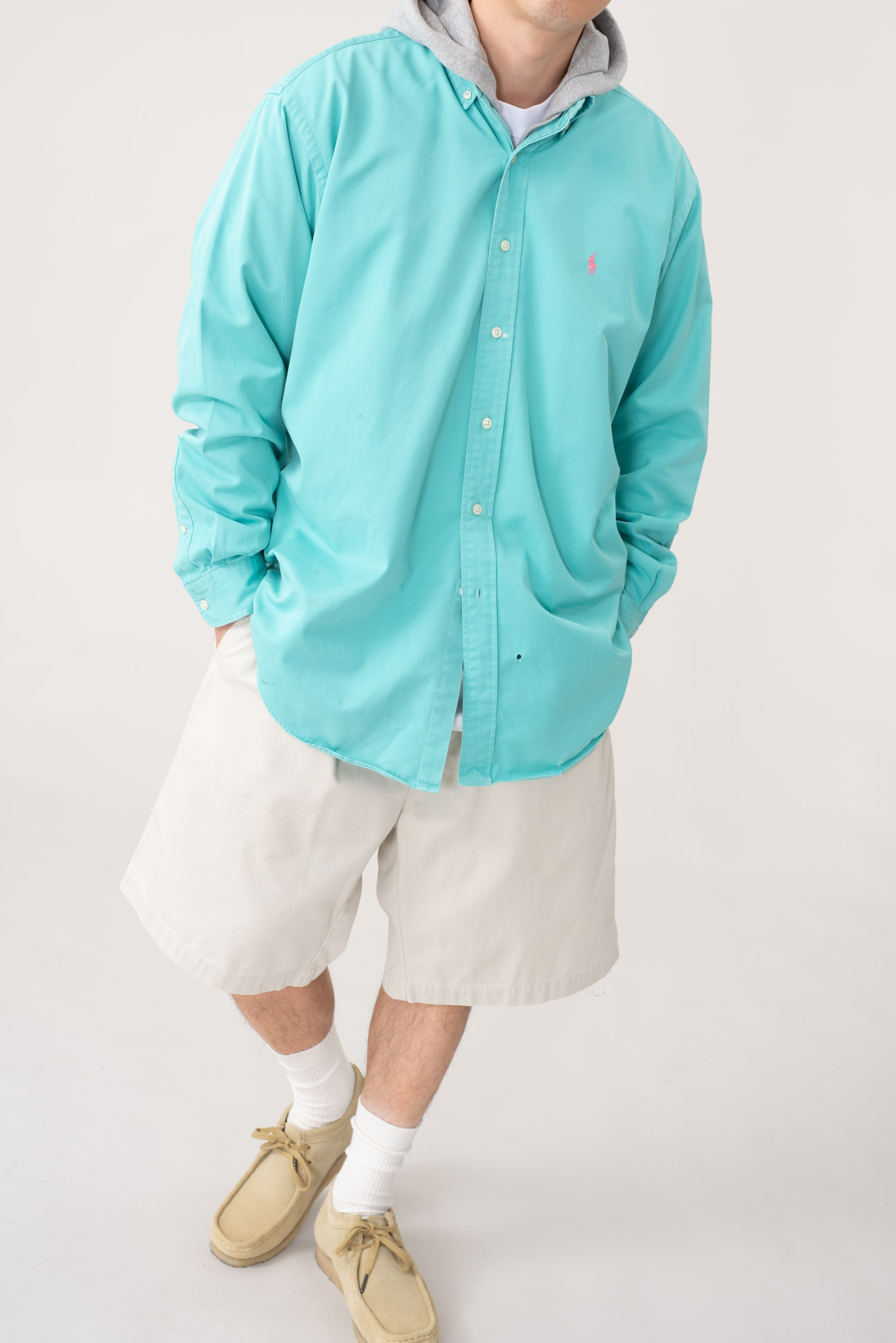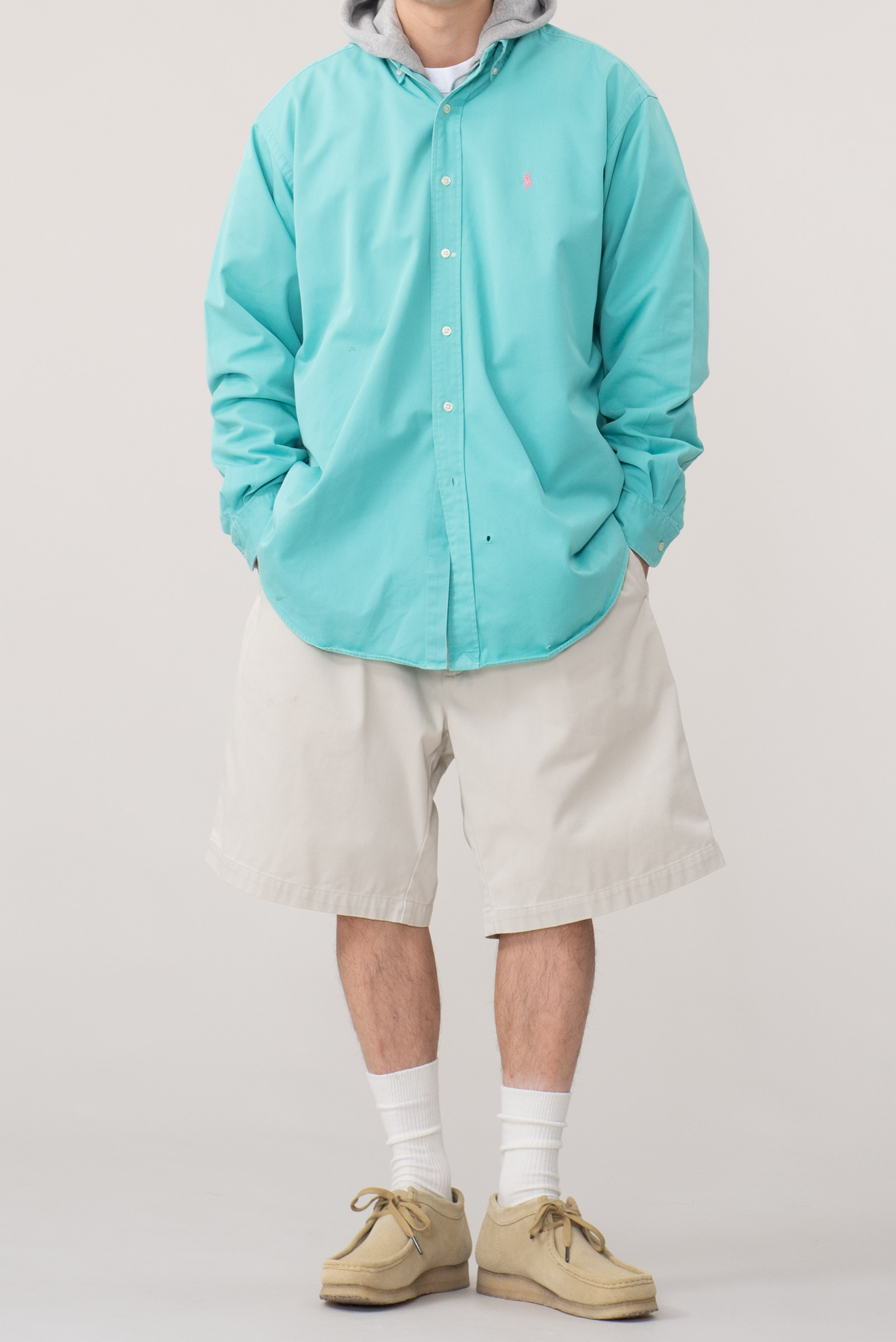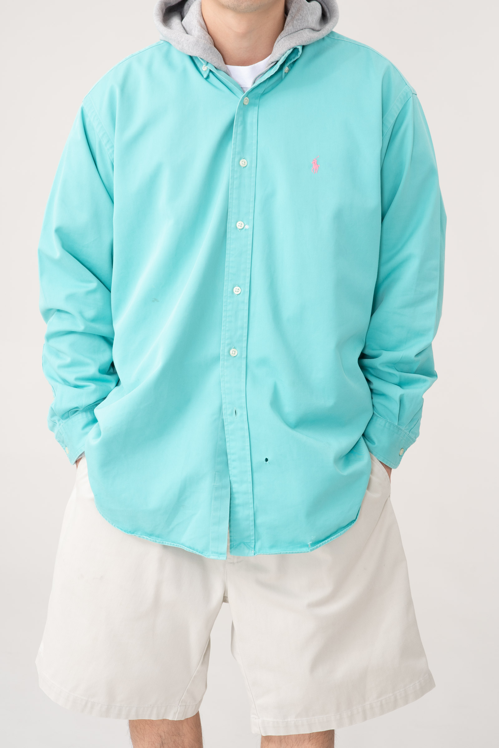- 90s 블레이크 핏 옥스포드 셔츠입니다. 민트 바탕에 핑크 포니 색 조합으로 어딜 가도 눈에 띕니다.