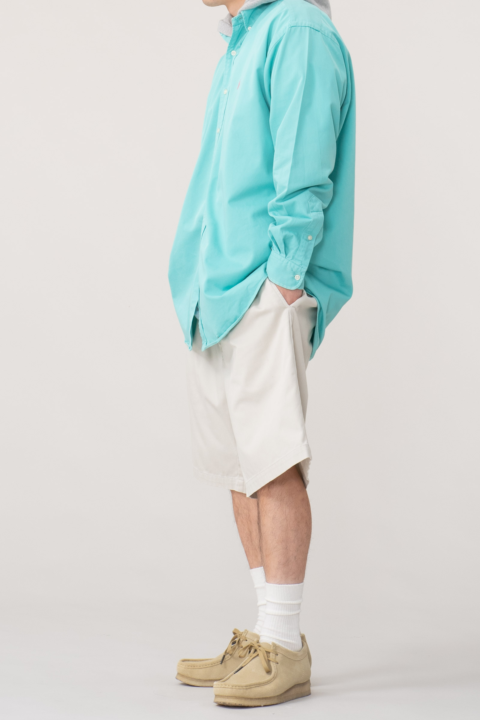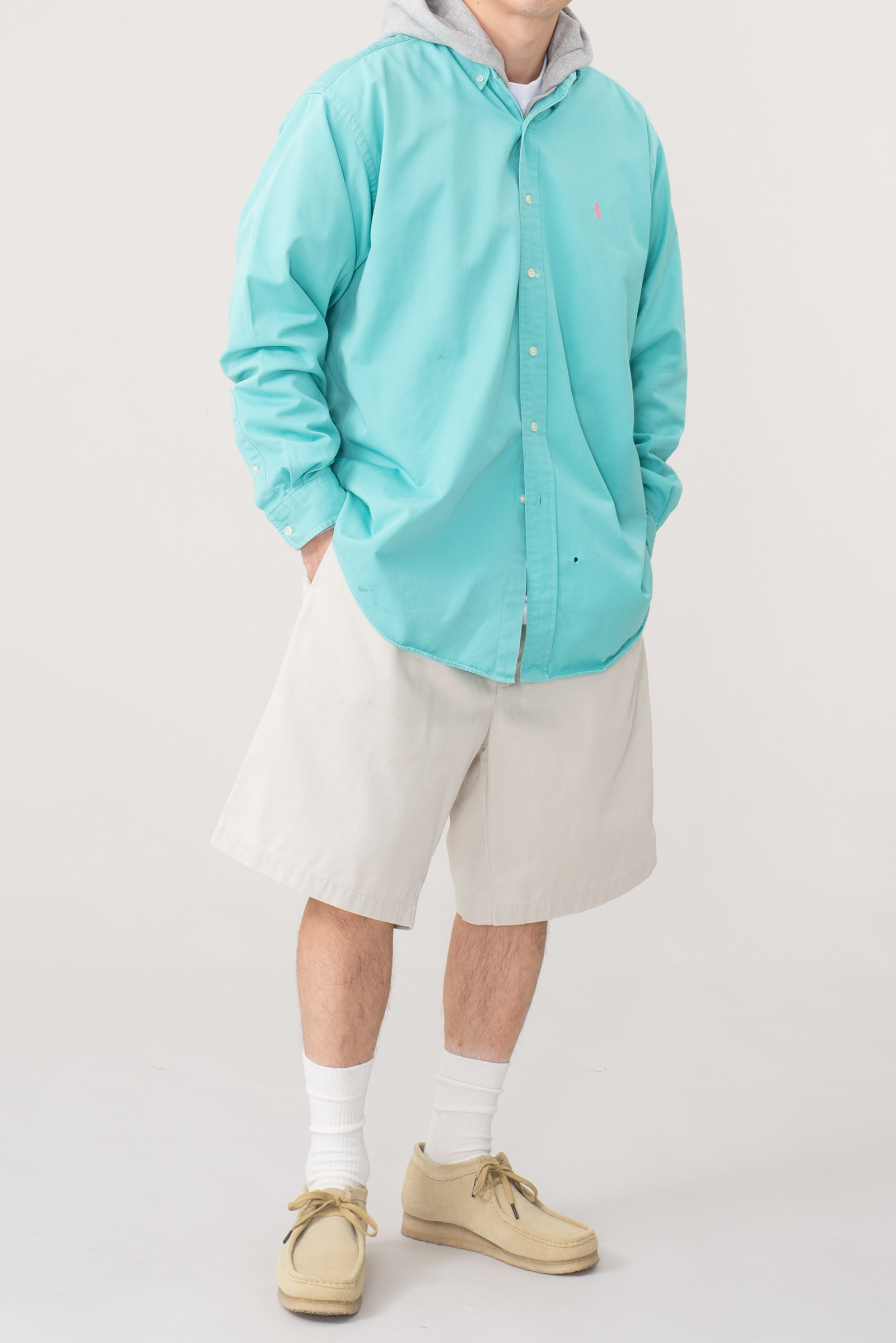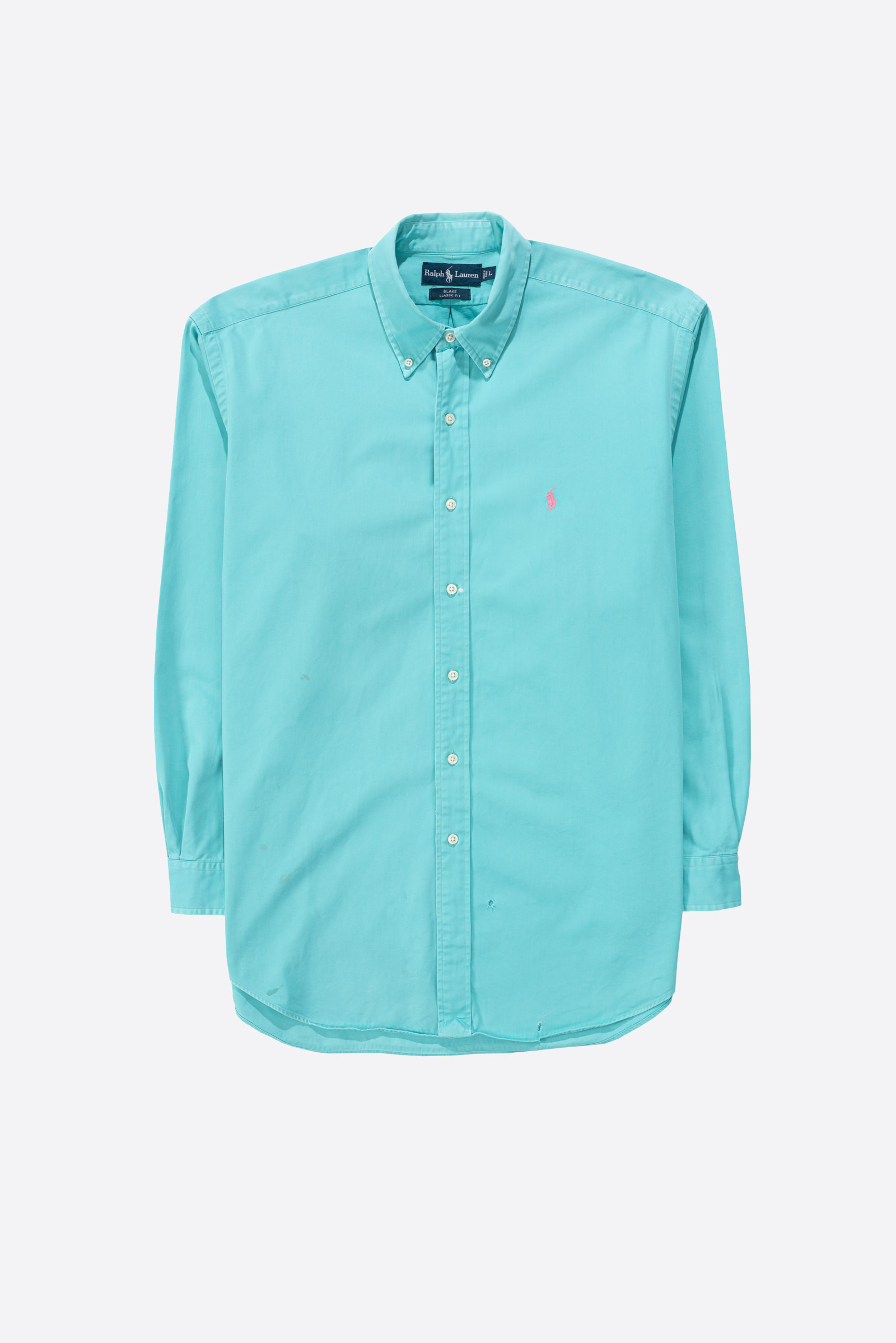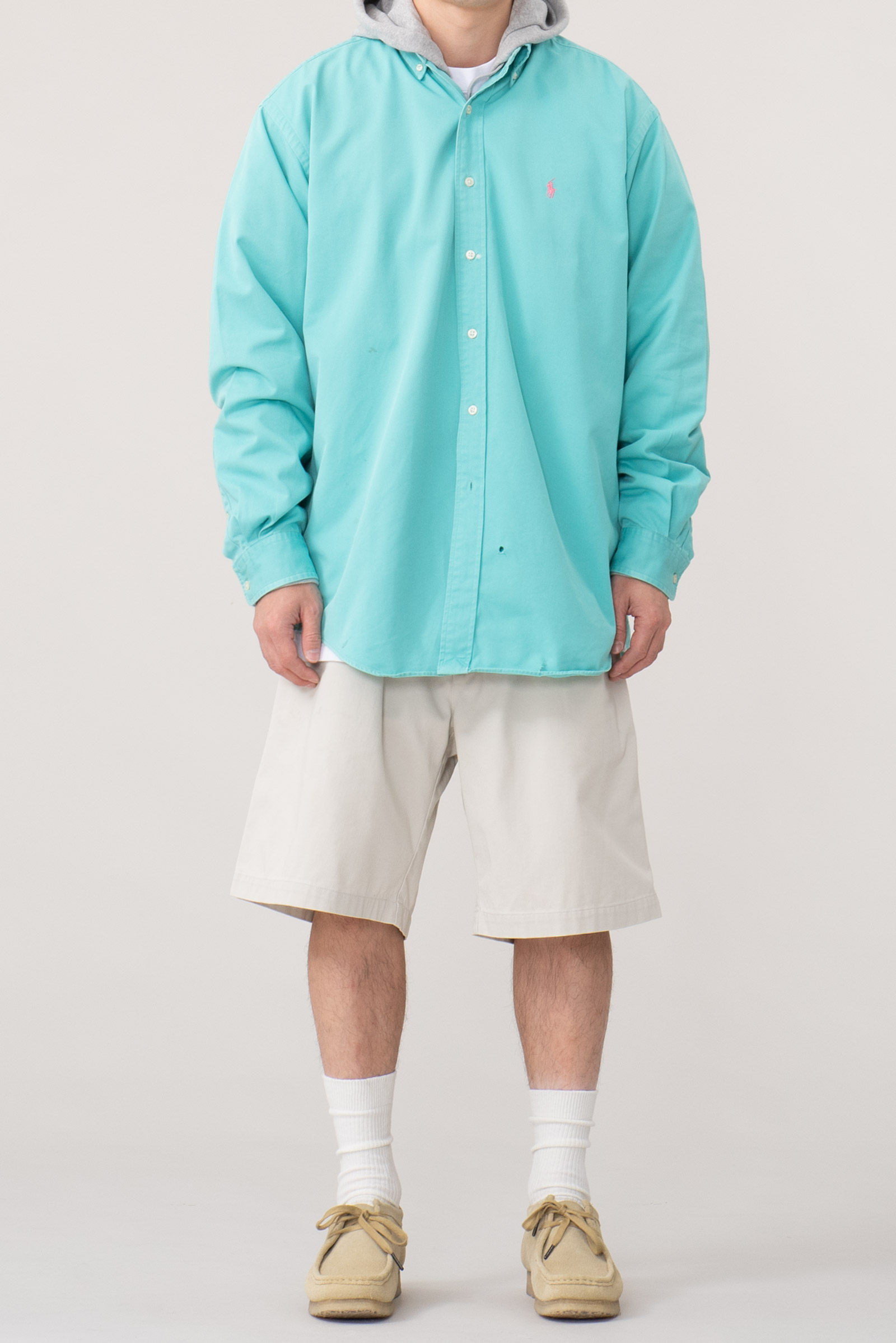 - 90s 블레이크 핏 옥스포드 셔츠입니다. 민트 바탕에 핑크 포니 색 조합으로 어딜 가도 눈에 띕니다.