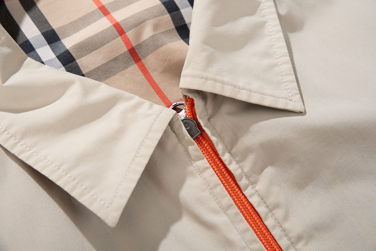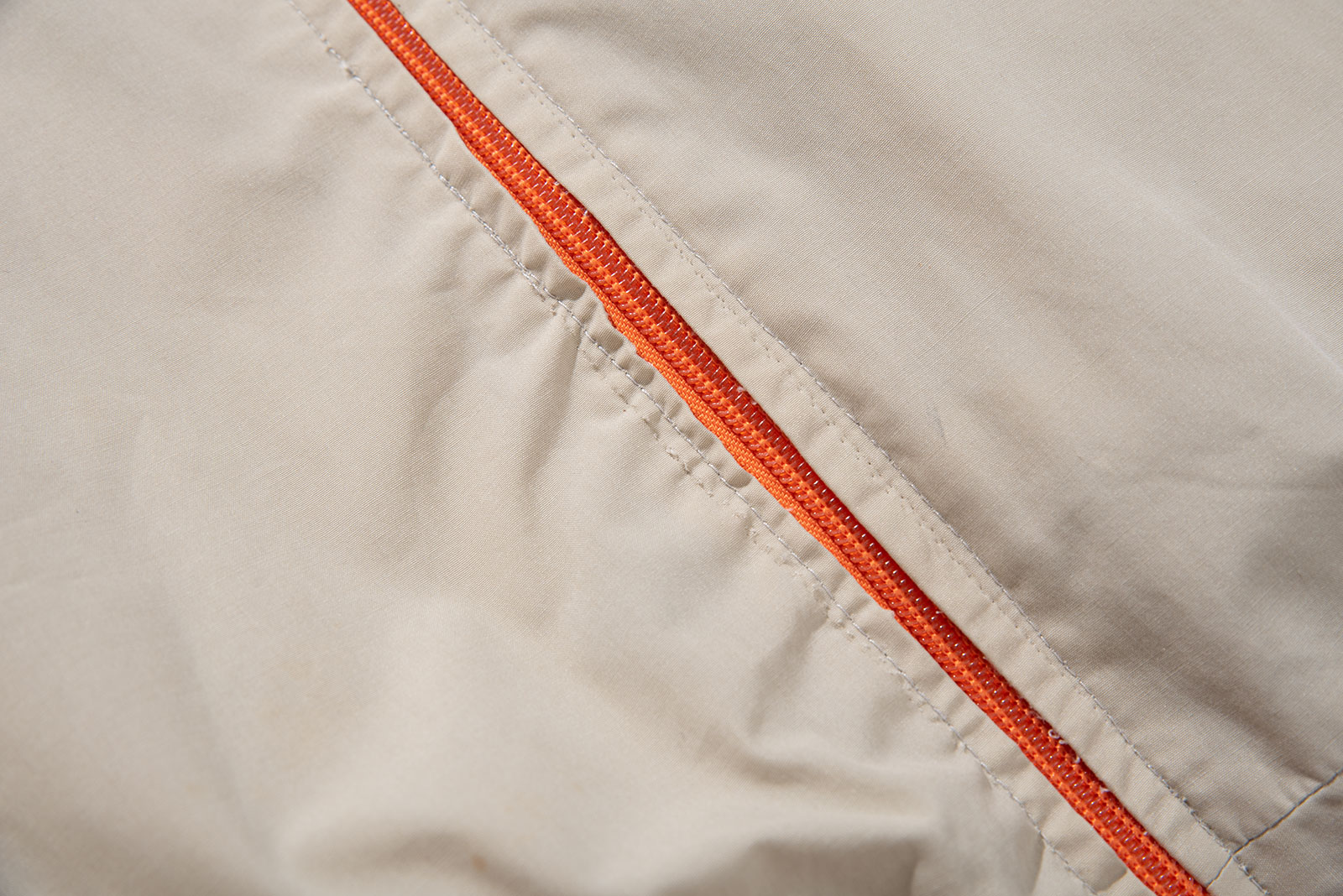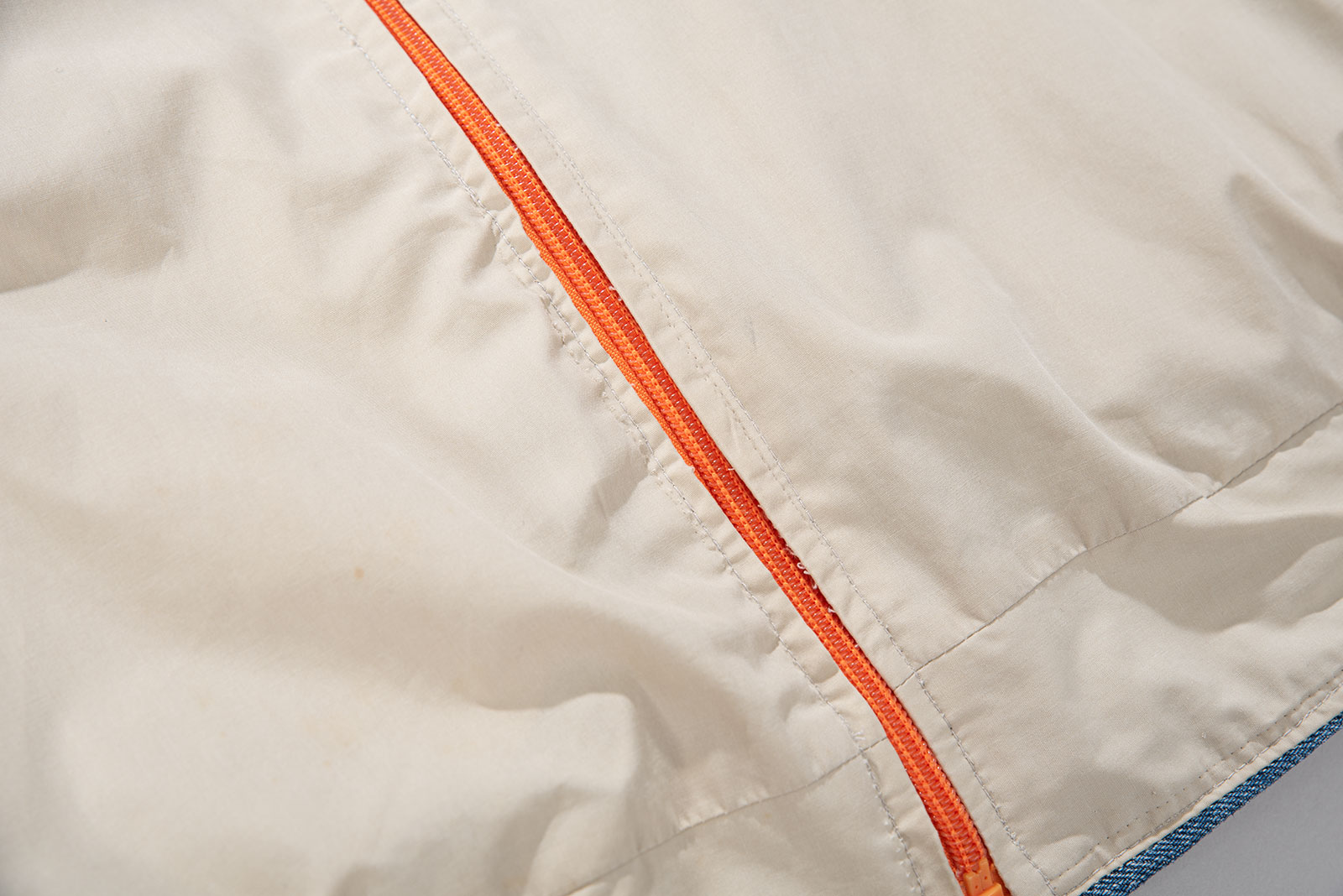 - 양면 지퍼가 고장났는지 지퍼 수선이 되었습니다. 지퍼 전체가 교체되었으며 역시나 전 주인도 노바체크가 깔쌈하다 여겼는지, 둘의 선택지 중, 노바체크 쪽으로 여닫을 수 있게 방향을 고정시켜뒀네요. 지퍼 밑단 한쪽의 올이 약간 트였는데 여닫는 것엔 문제 없습니다.