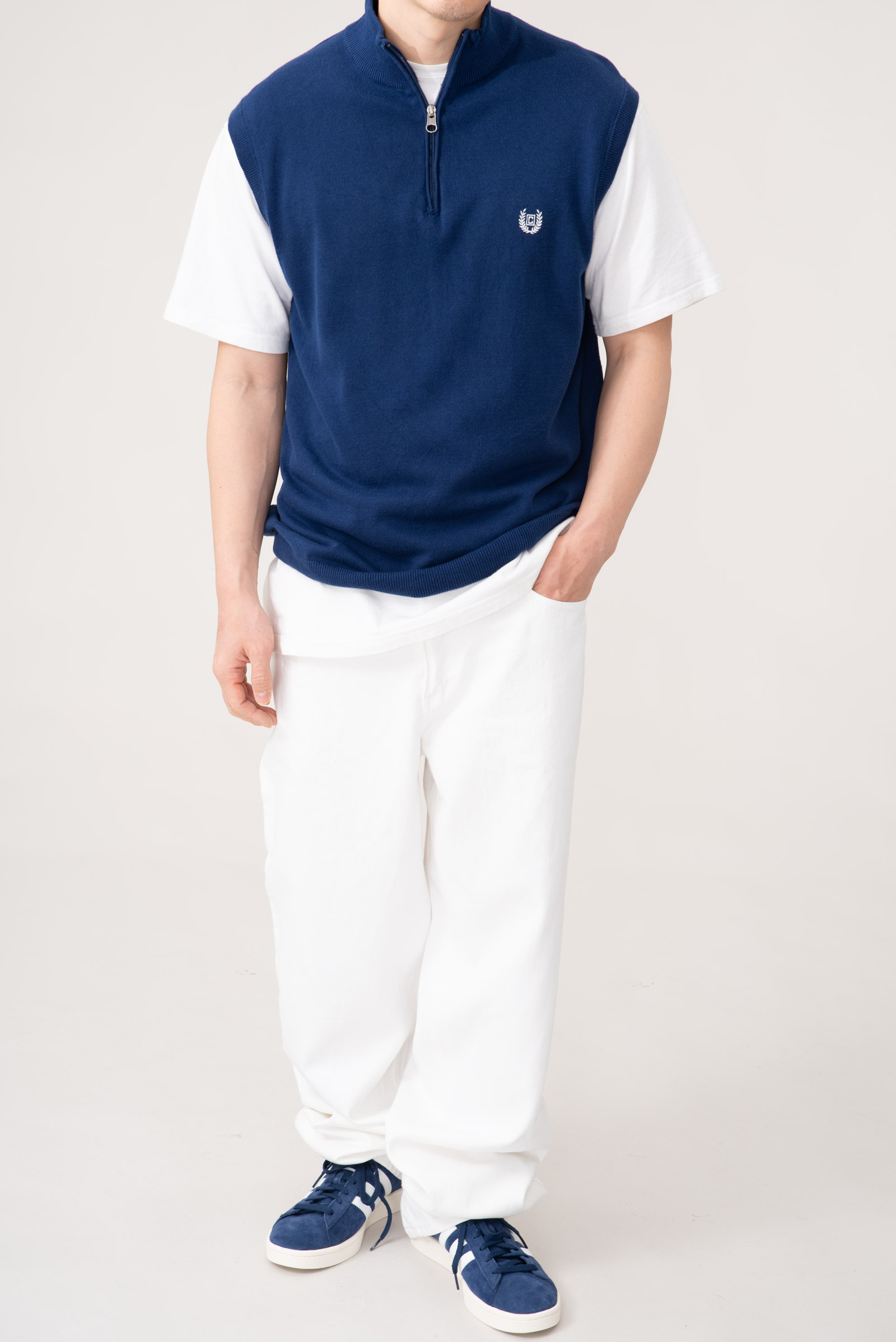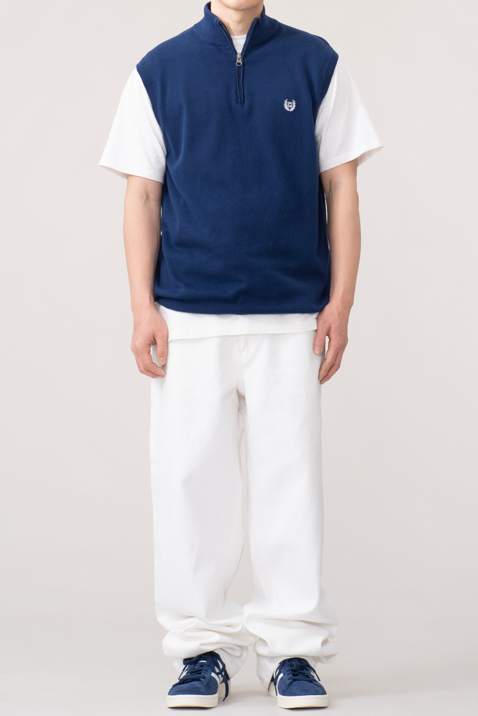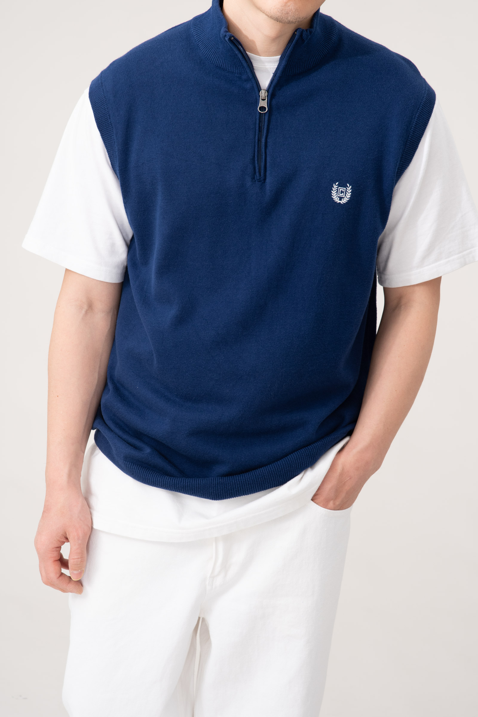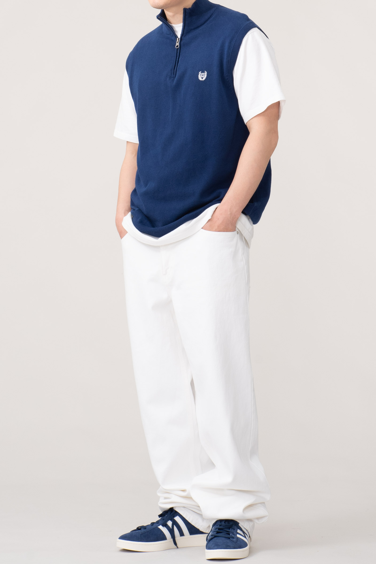 - 90s 챕스 하프넥 코튼 니트 베스트입니다. 블루 컬러가 빛을 잘 머금는데, 실제 색은 모델 착용샷과 근접합니다. 전체적인 물빠짐이 있고 그렇습니다만 컨디션은 준수합니다.