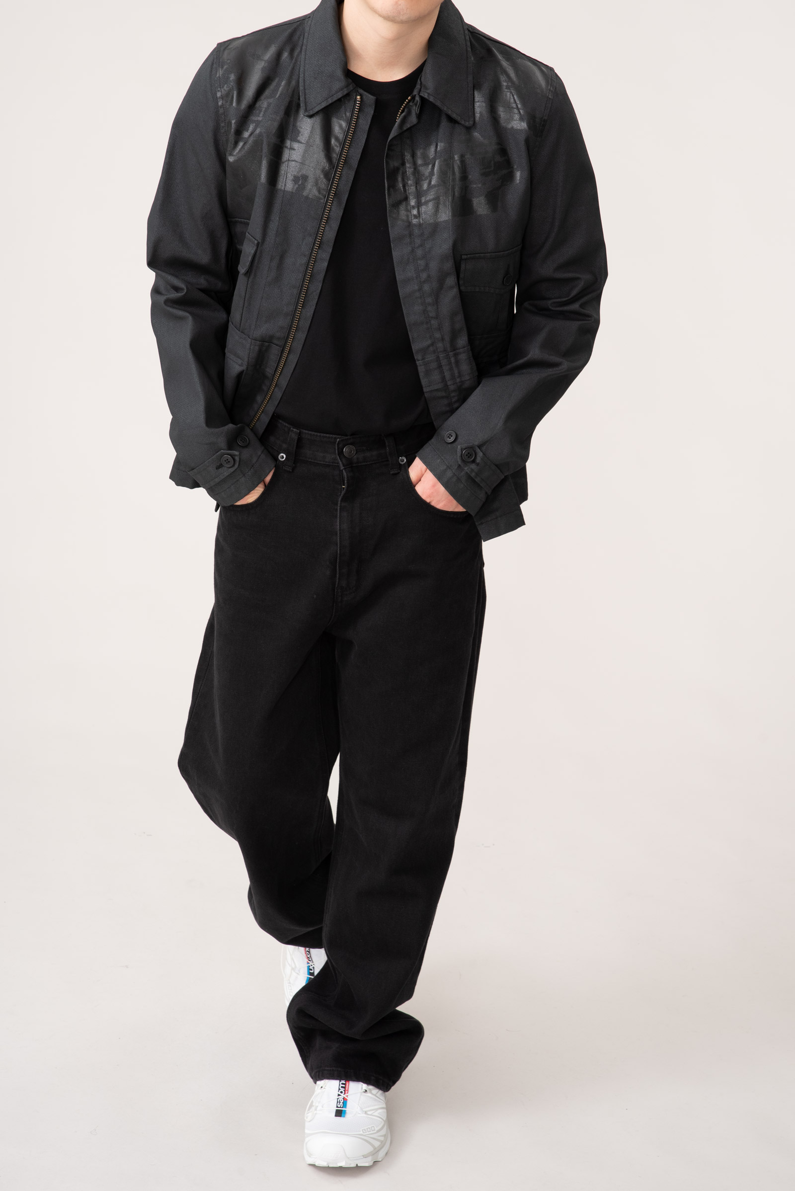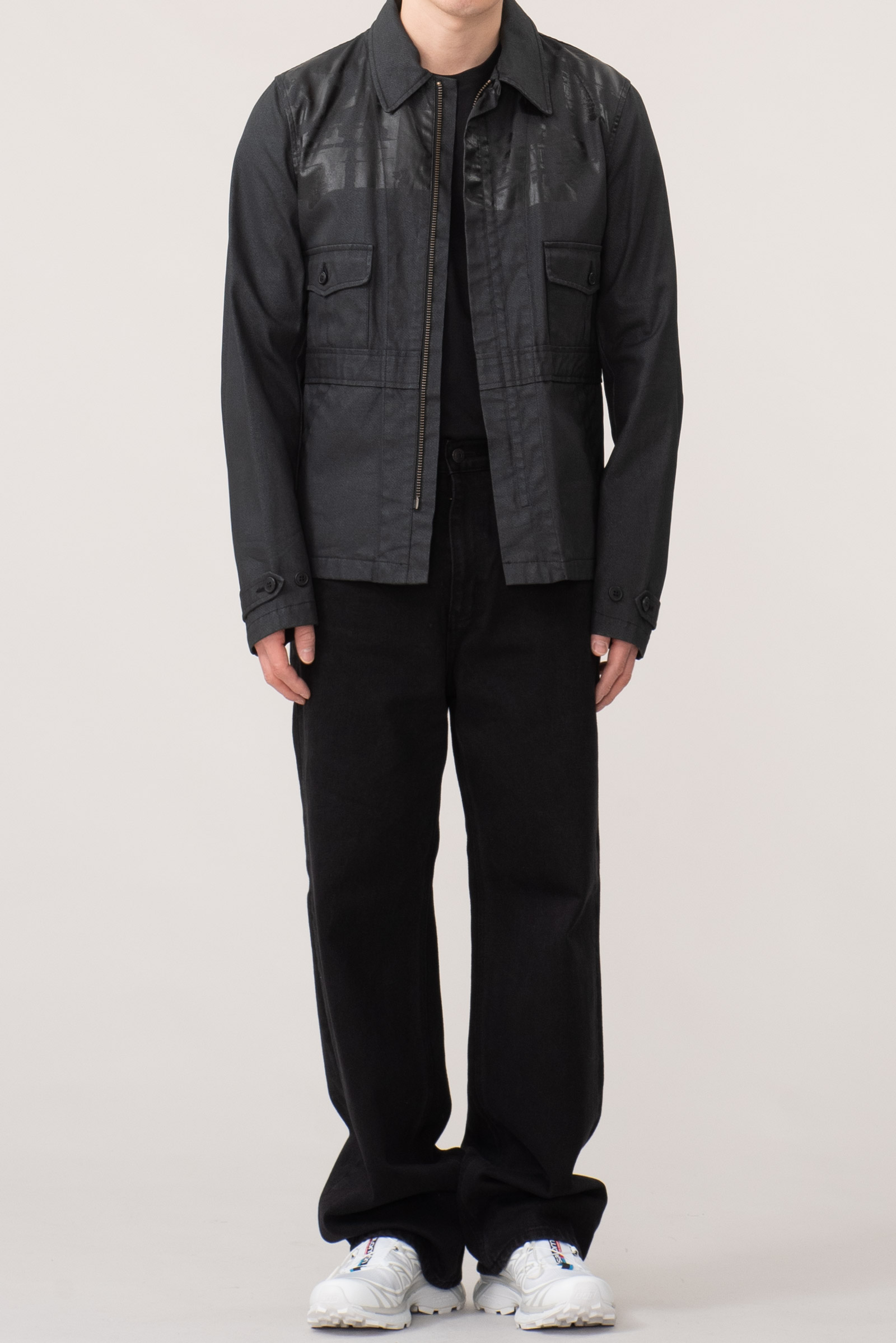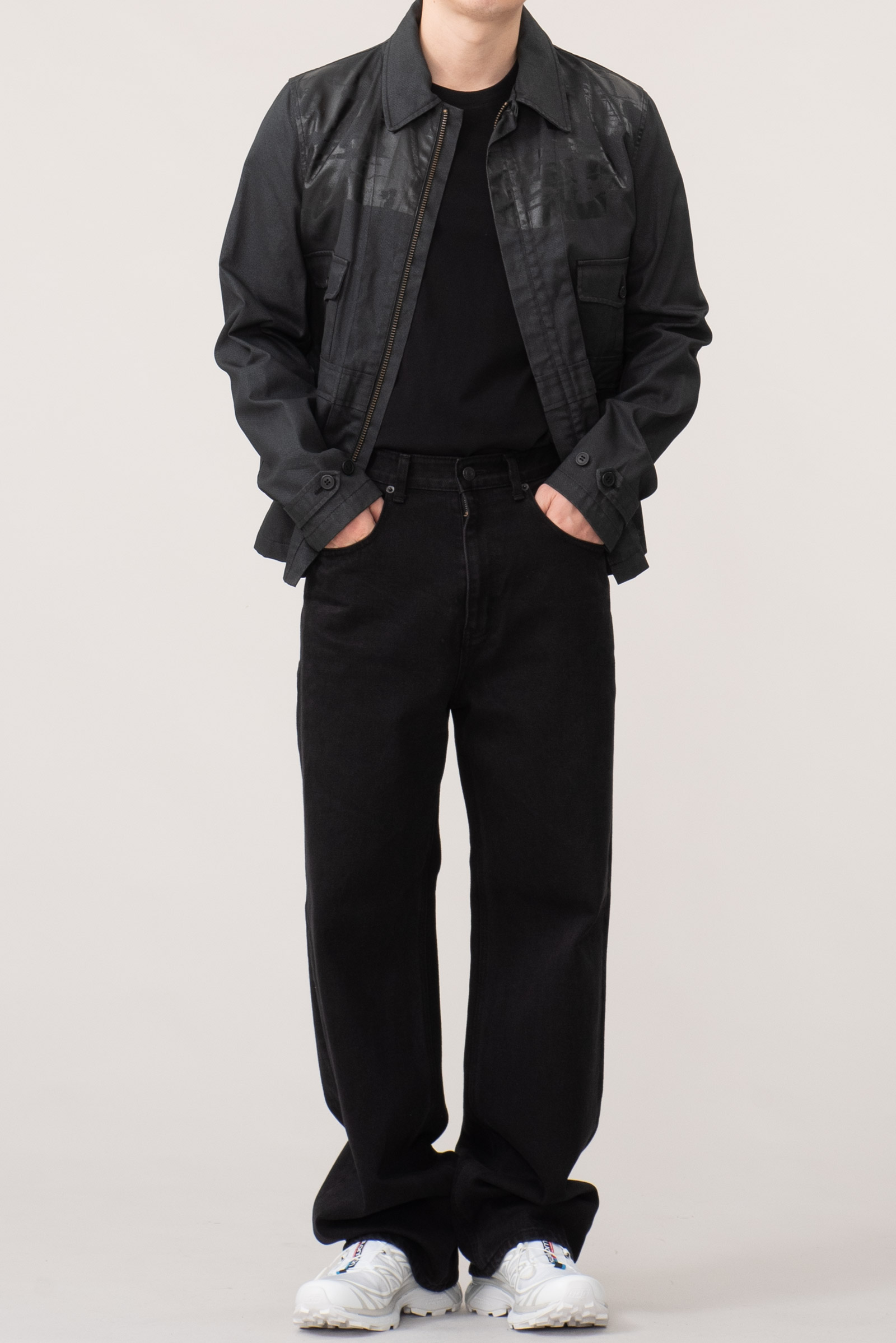 - 적당한 두께의 검정색 데님 원단 위로 얇은 코팅을 씌운 코팅진 개념의 제품입니다. 그 위로 농도가 더 짙은 코팅으로 페인팅 디테일을 더해 y2k 테크노웨어의 분위기를 가미했습니다. y2k가 도래한 현 시점에 아주 적절한 재킷이 아닌가 싶네요.