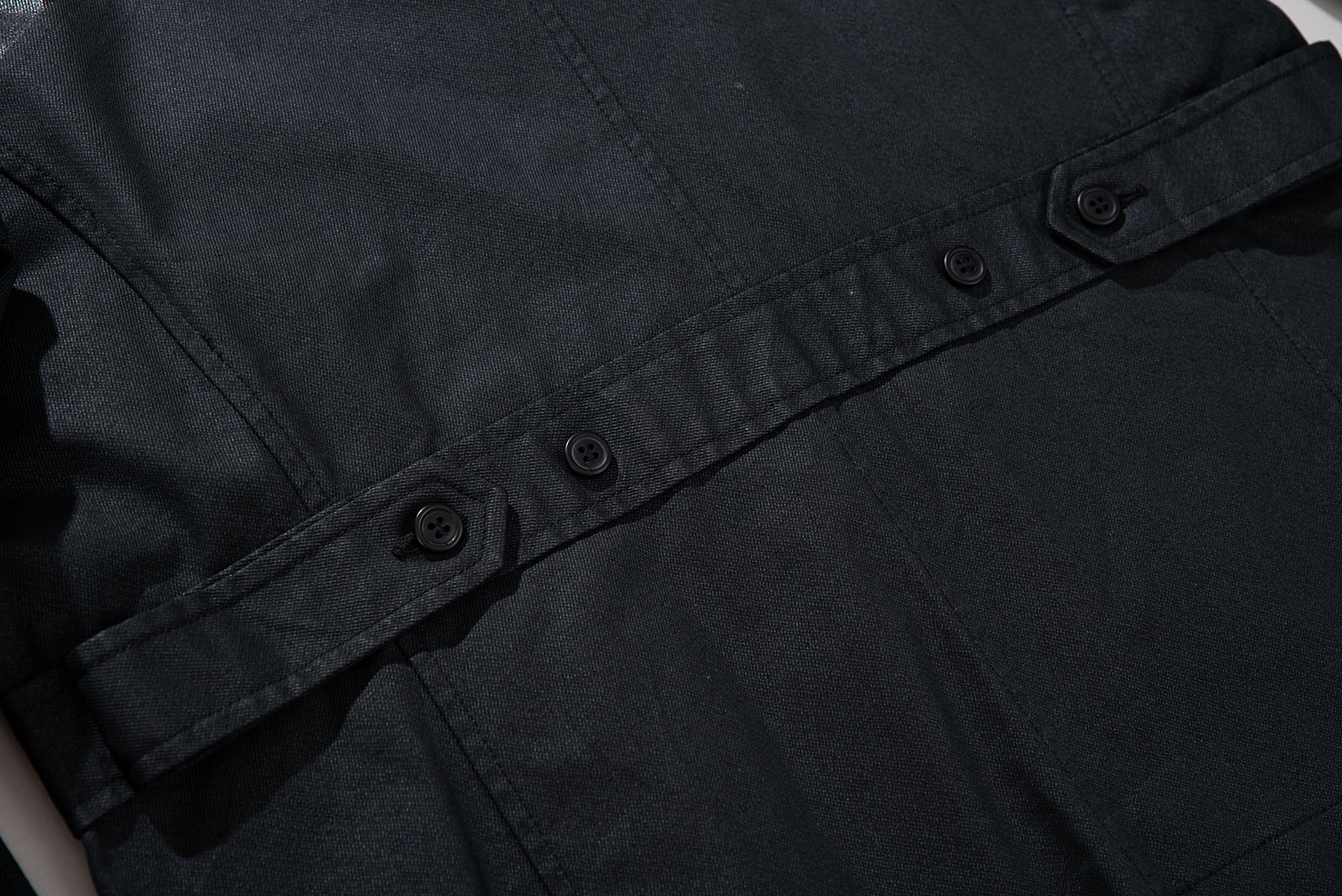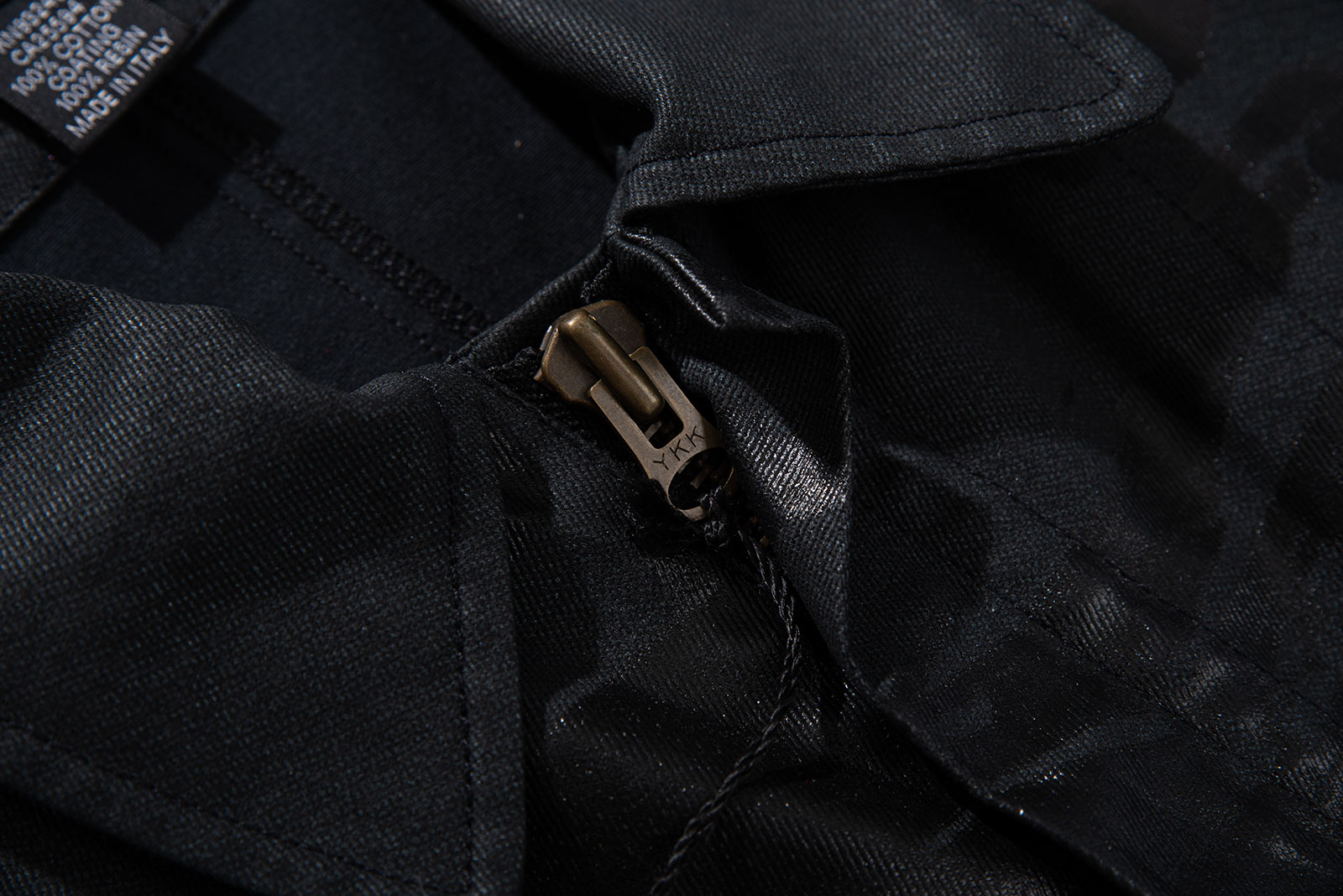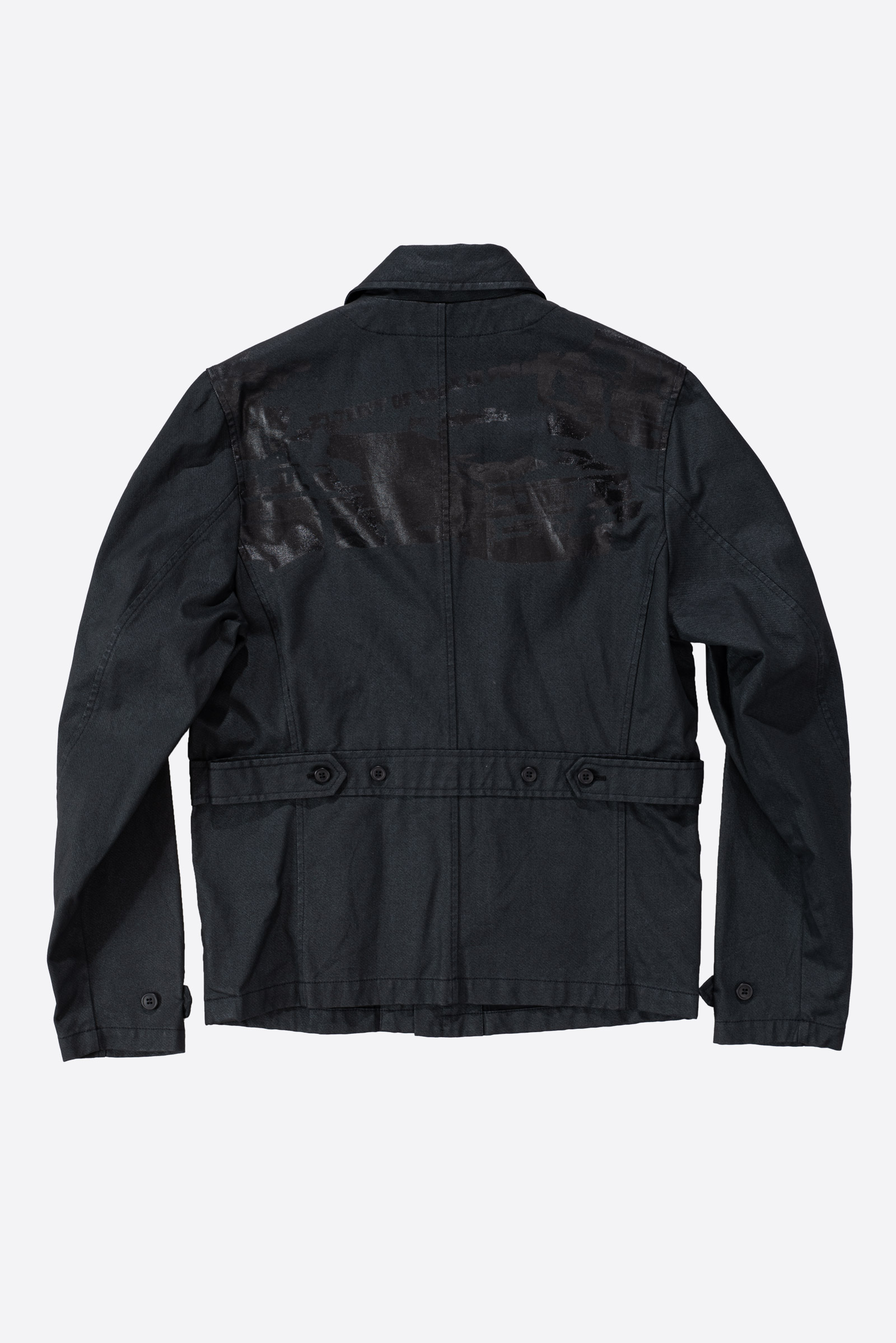 - 적당한 두께의 검정색 데님 원단 위로 얇은 코팅을 씌운 코팅진 개념의 제품입니다. 그 위로 농도가 더 짙은 코팅으로 페인팅 디테일을 더해 y2k 테크노웨어의 분위기를 가미했습니다. y2k가 도래한 현 시점에 아주 적절한 재킷이 아닌가 싶네요.
