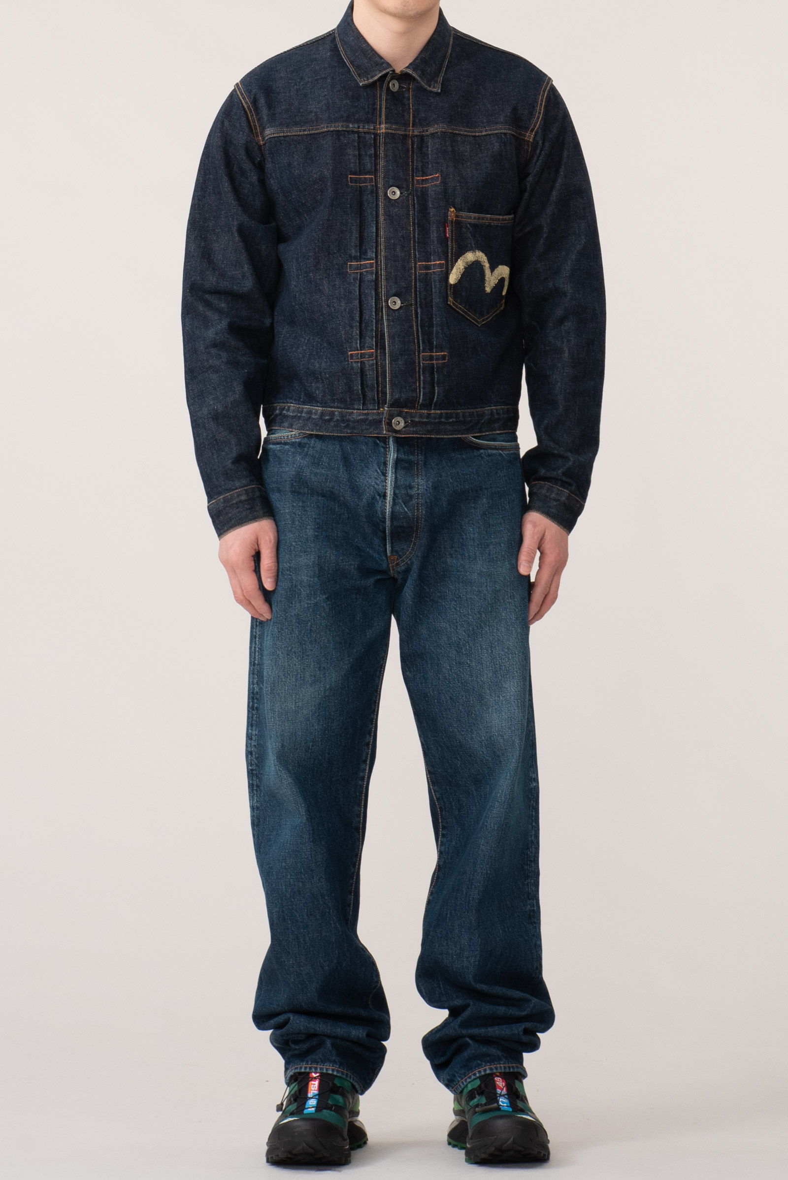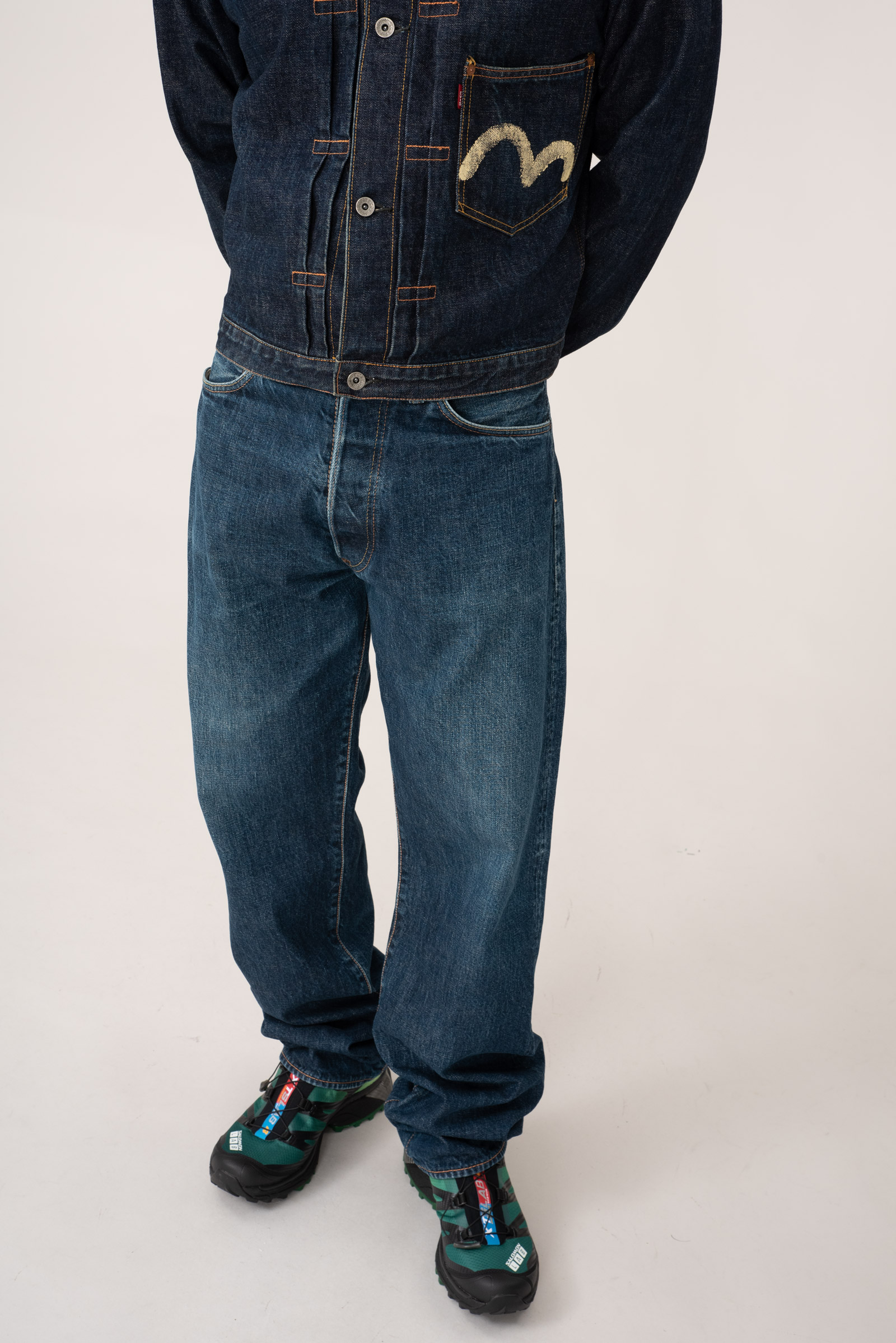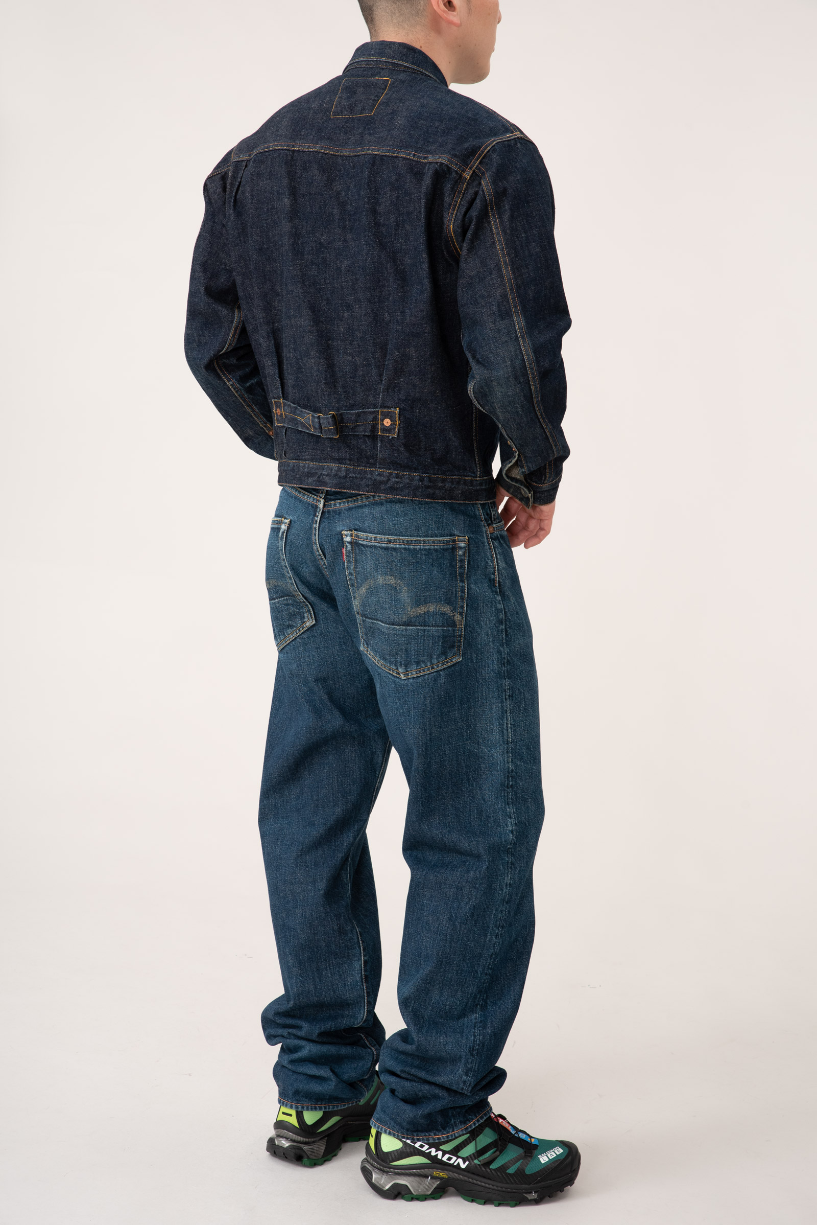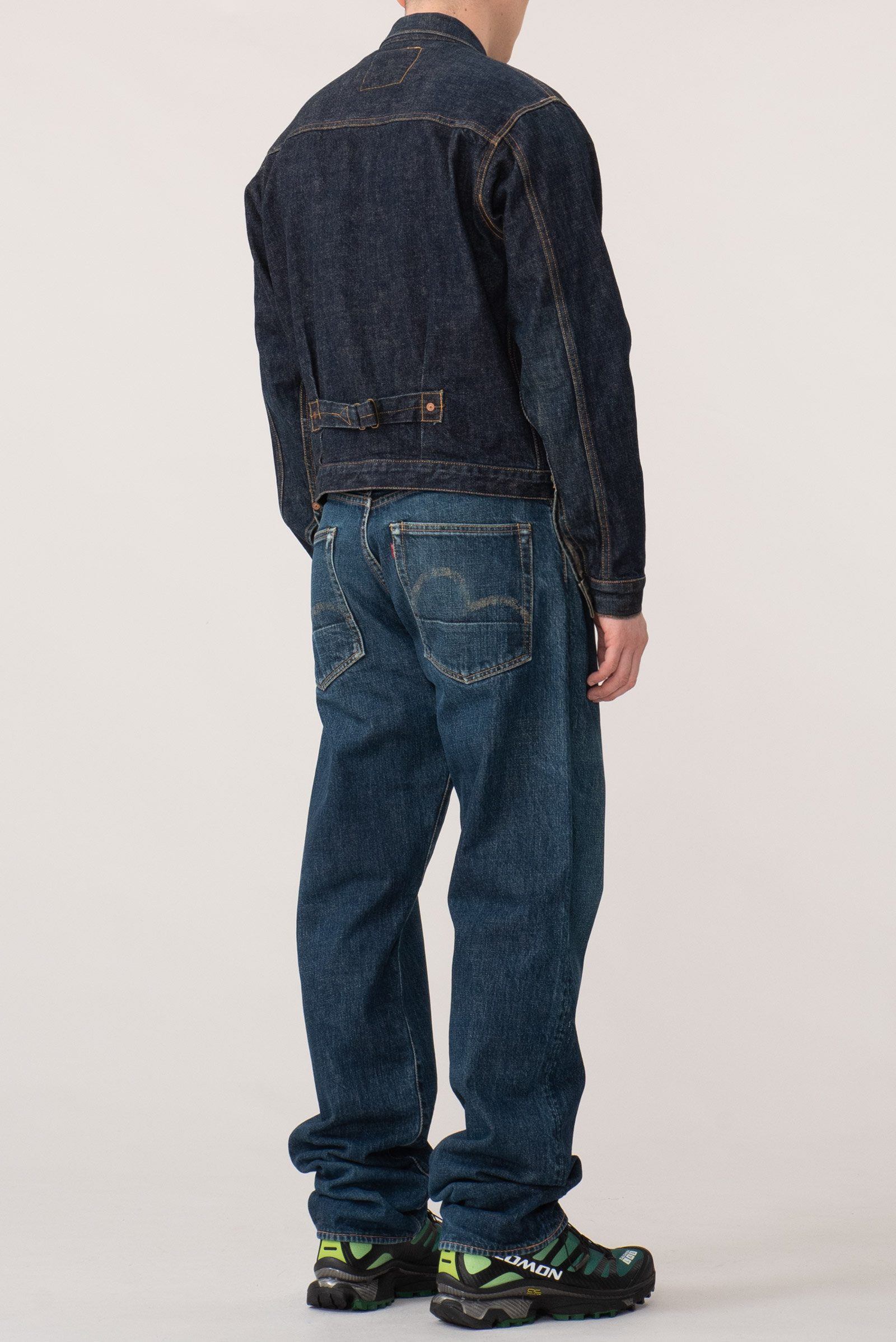 - 에비수 간판 모델 no.2 2001 제품입니다. 2000 모델보다 조금 더 와이드한 핏으로 전 후 주일 미군이 입다 버리고 간 리바이스 501의 오버 사이징을 재해석한 제품입니다. 허리 딱 맞게 입어도 밑위부터 밑단까지 기형적으로 넓은 실루엣을 즐길 수 있습니다.