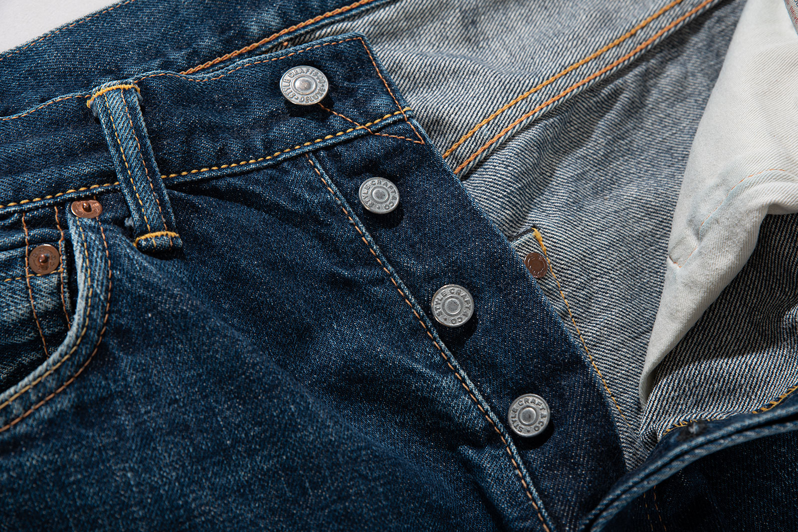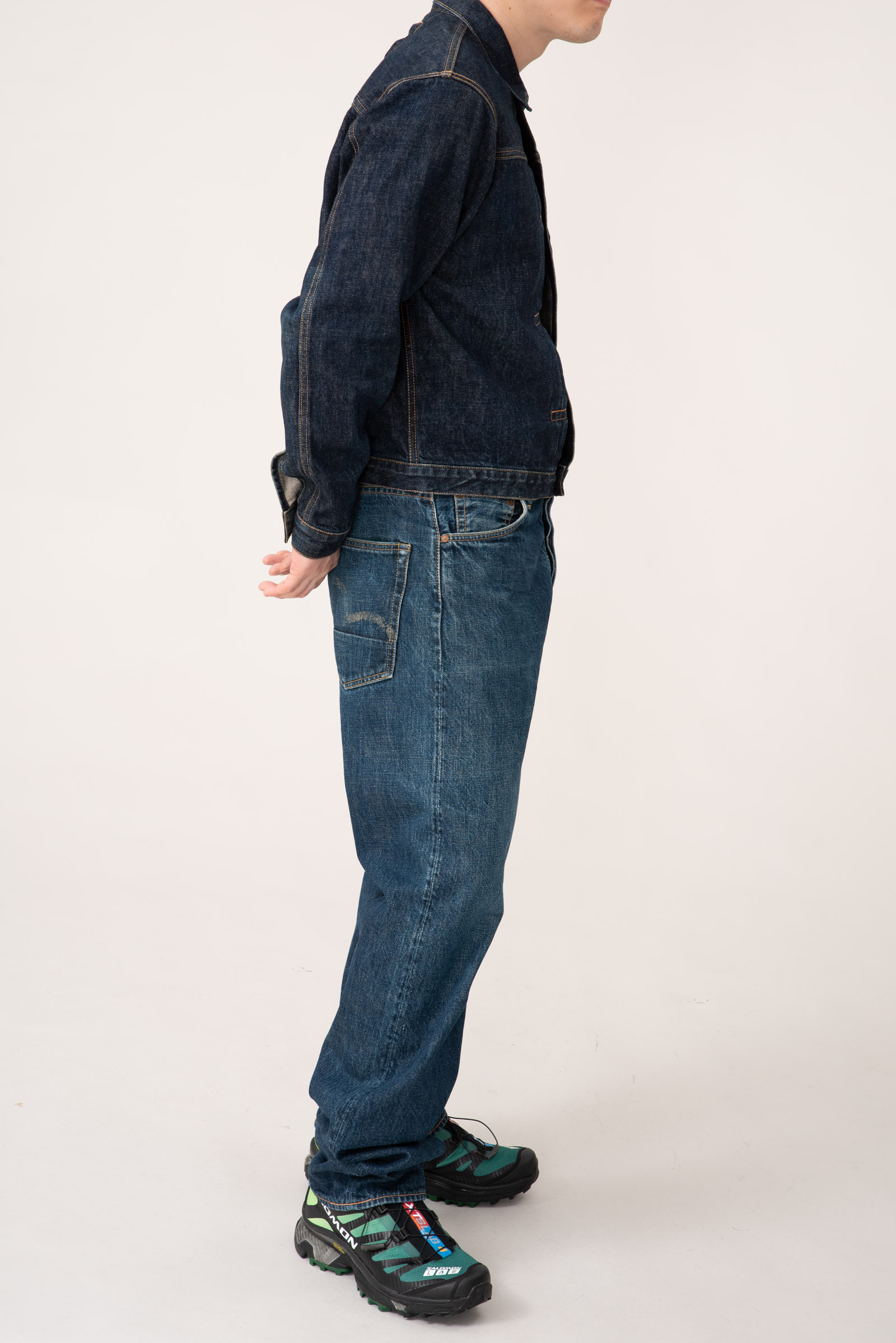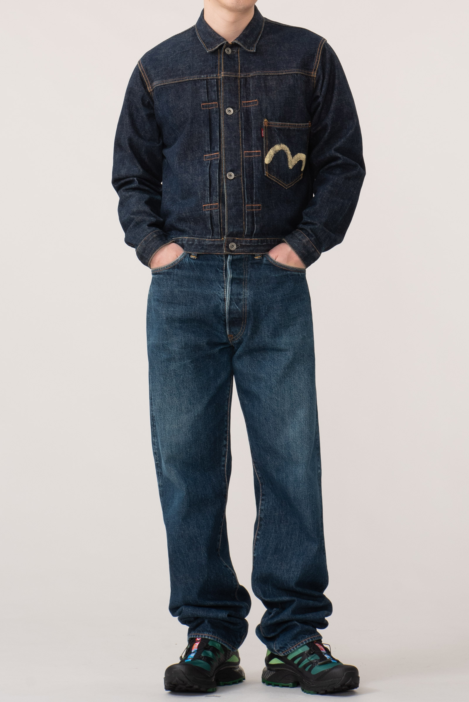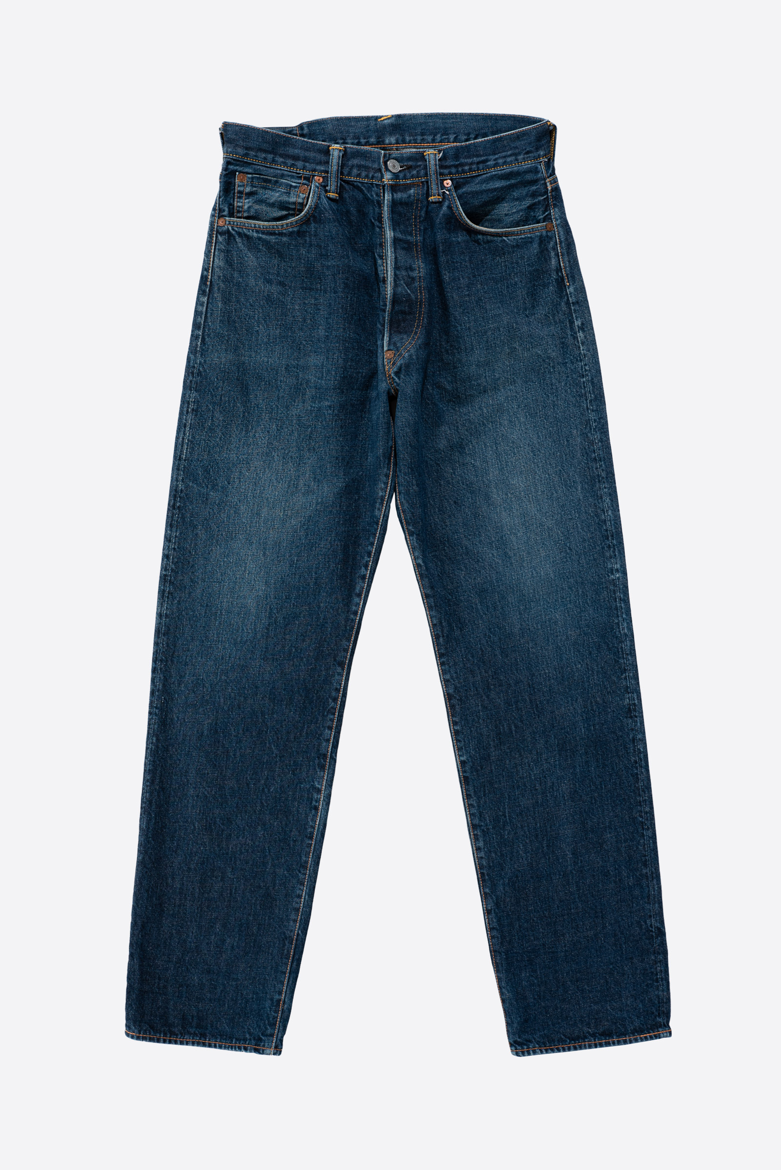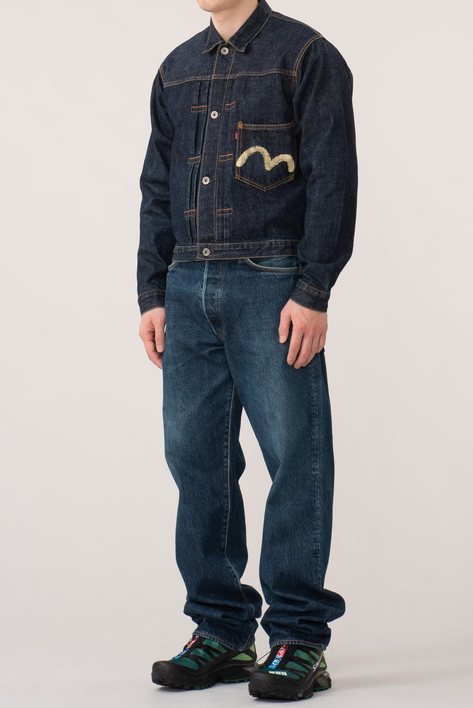 - 에비수 간판 모델 no.2 2001 제품입니다. 2000 모델보다 조금 더 와이드한 핏으로 전 후 주일 미군이 입다 버리고 간 리바이스 501의 오버 사이징을 재해석한 제품입니다. 허리 딱 맞게 입어도 밑위부터 밑단까지 기형적으로 넓은 실루엣을 즐길 수 있습니다.
