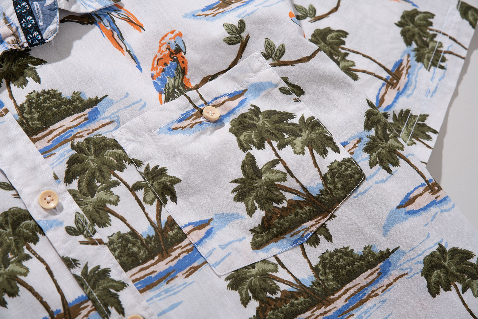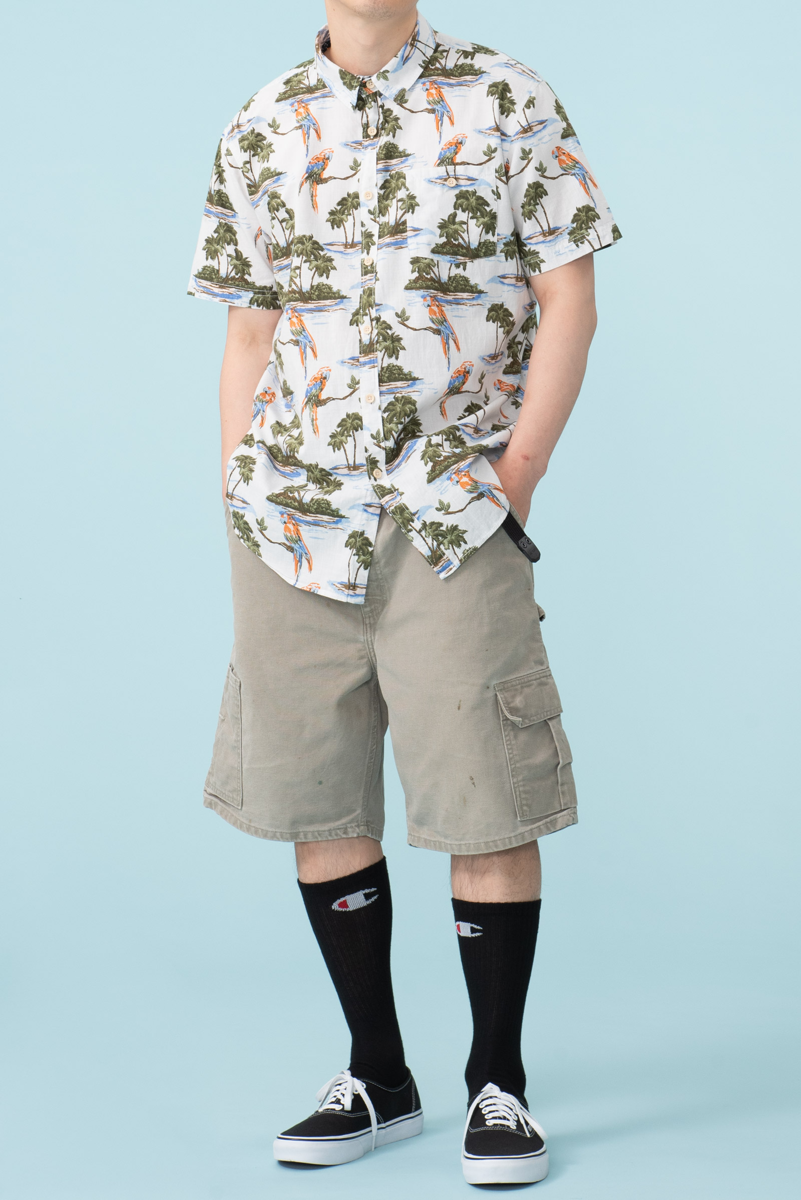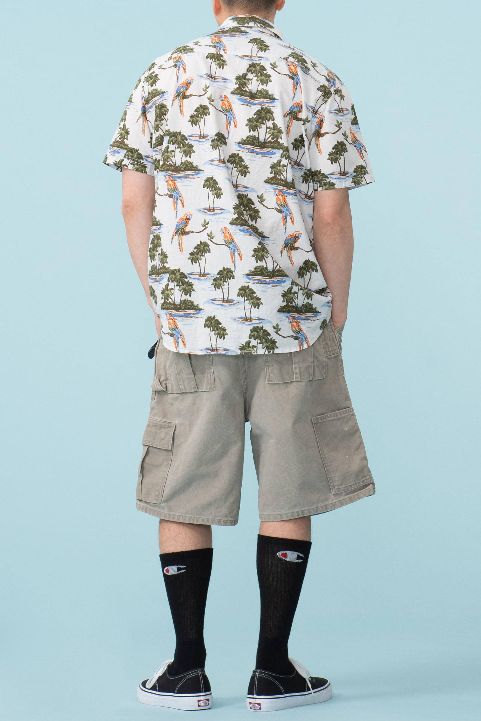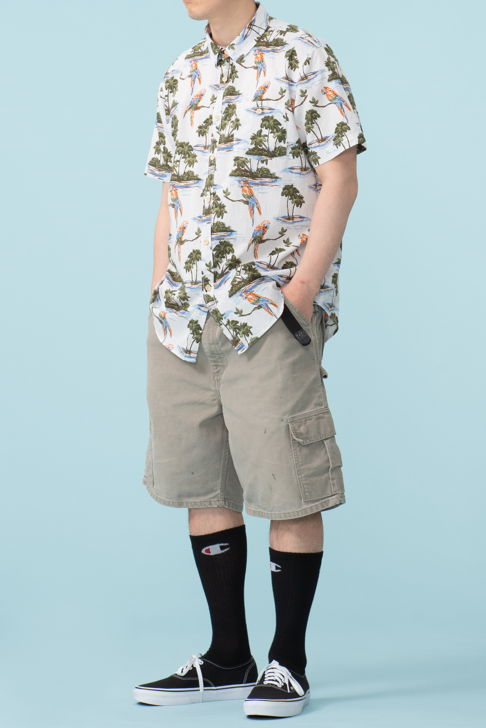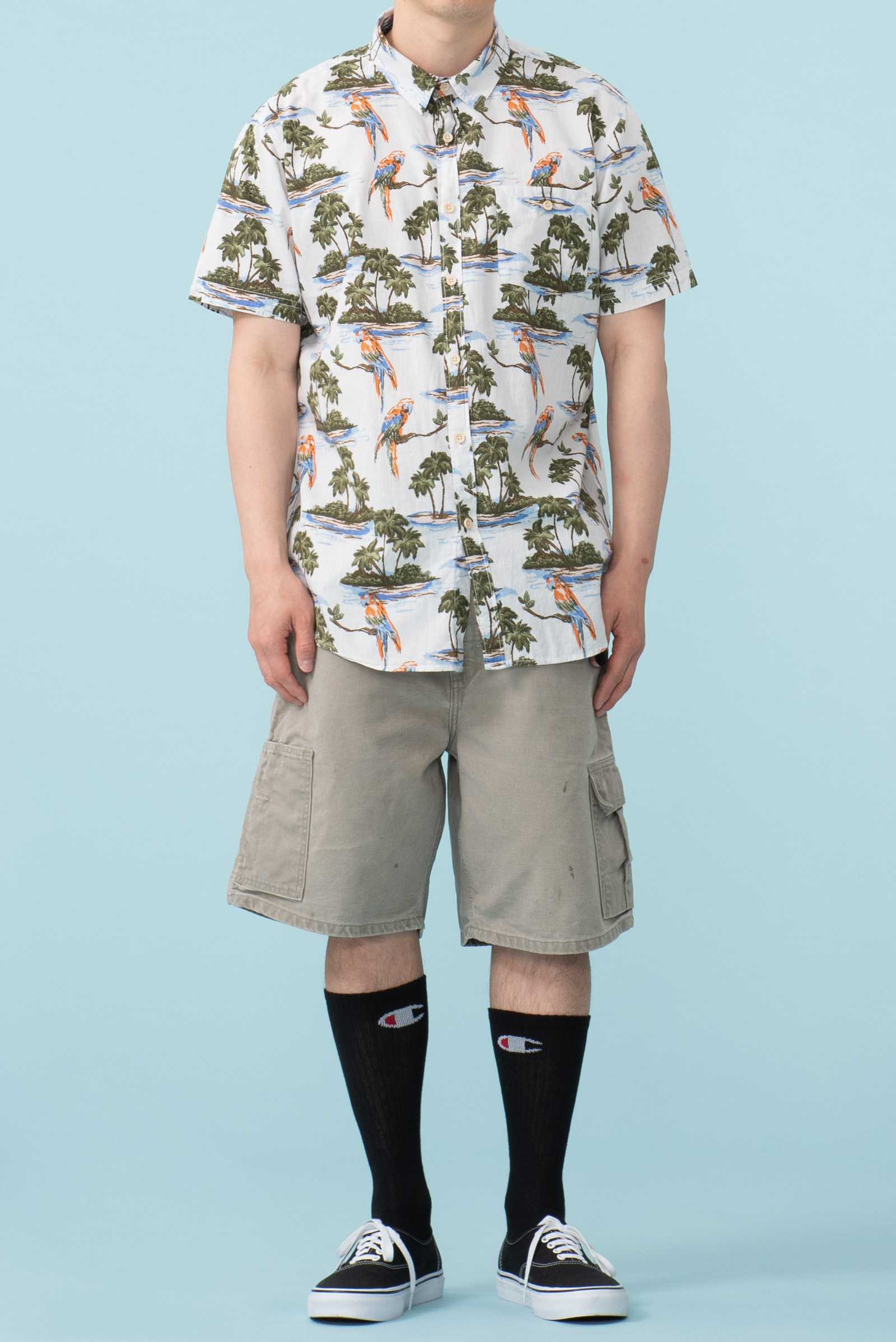- 코튼 소재의 하와이안 셔츠입니다. 어릴 때 시내에 있던 보세 전문점 '무료입장'에서 판매하던 스타일의 제품입니다. 셔츠 하나에 만원~이만원 정도였는데, 소풍가기 전엔 꼭 들러야 할 그런 곳이었죠.