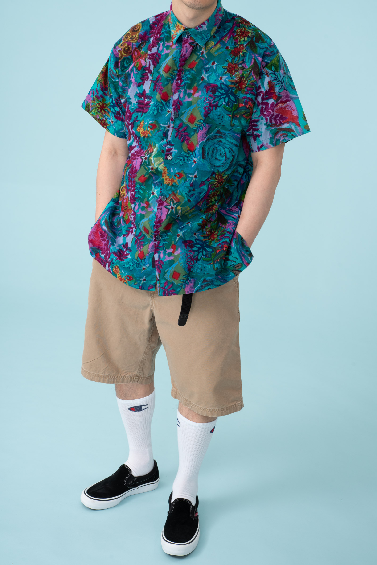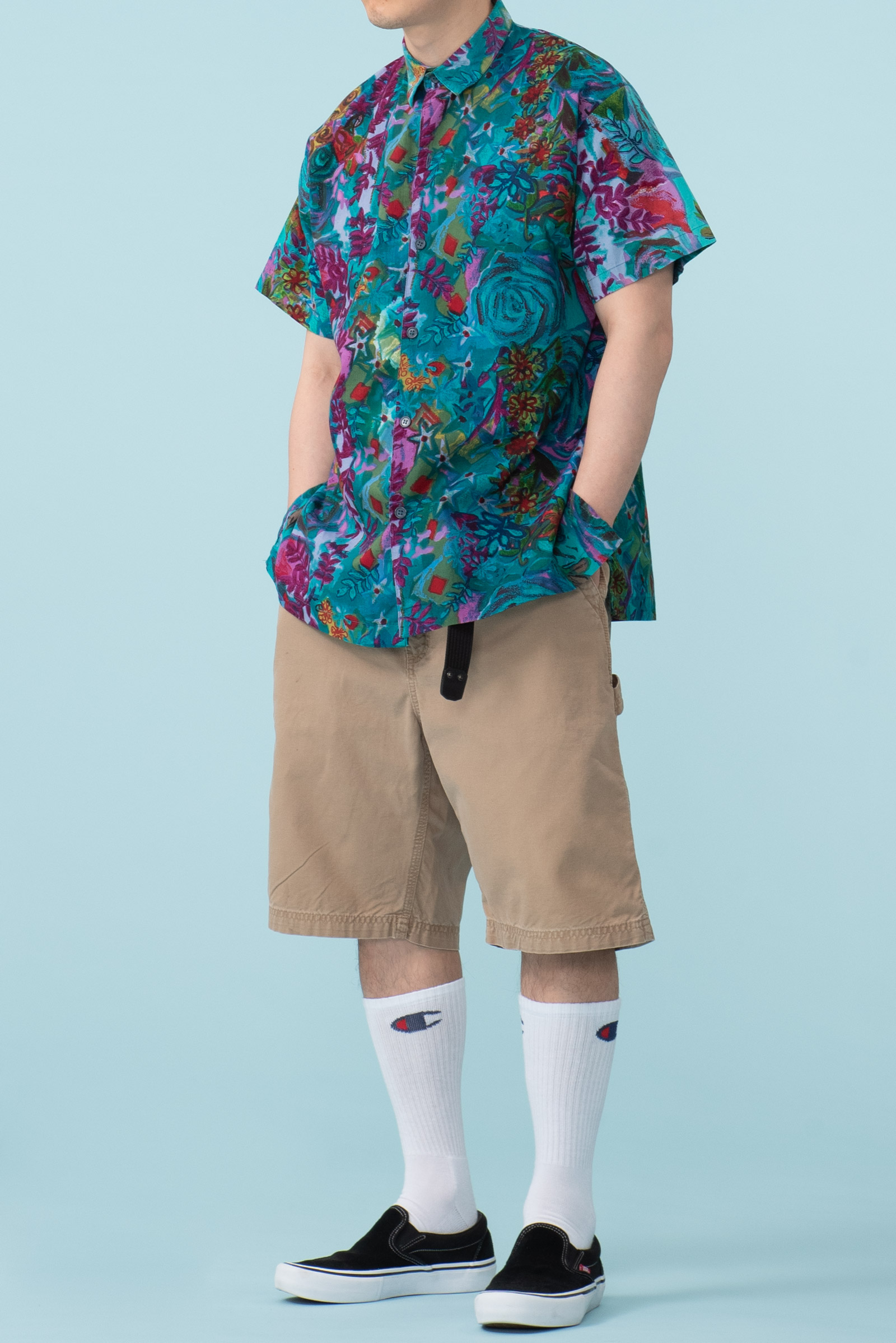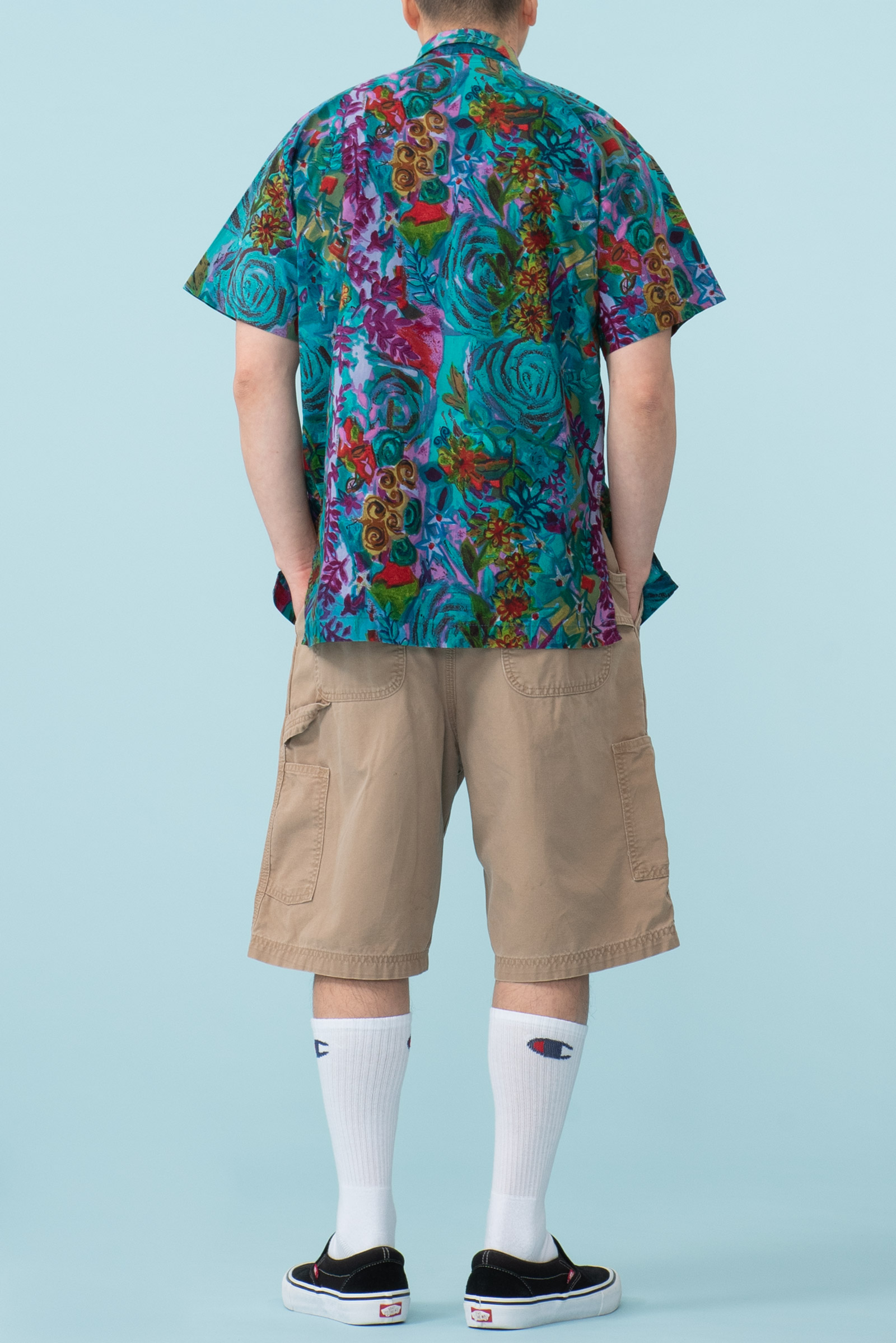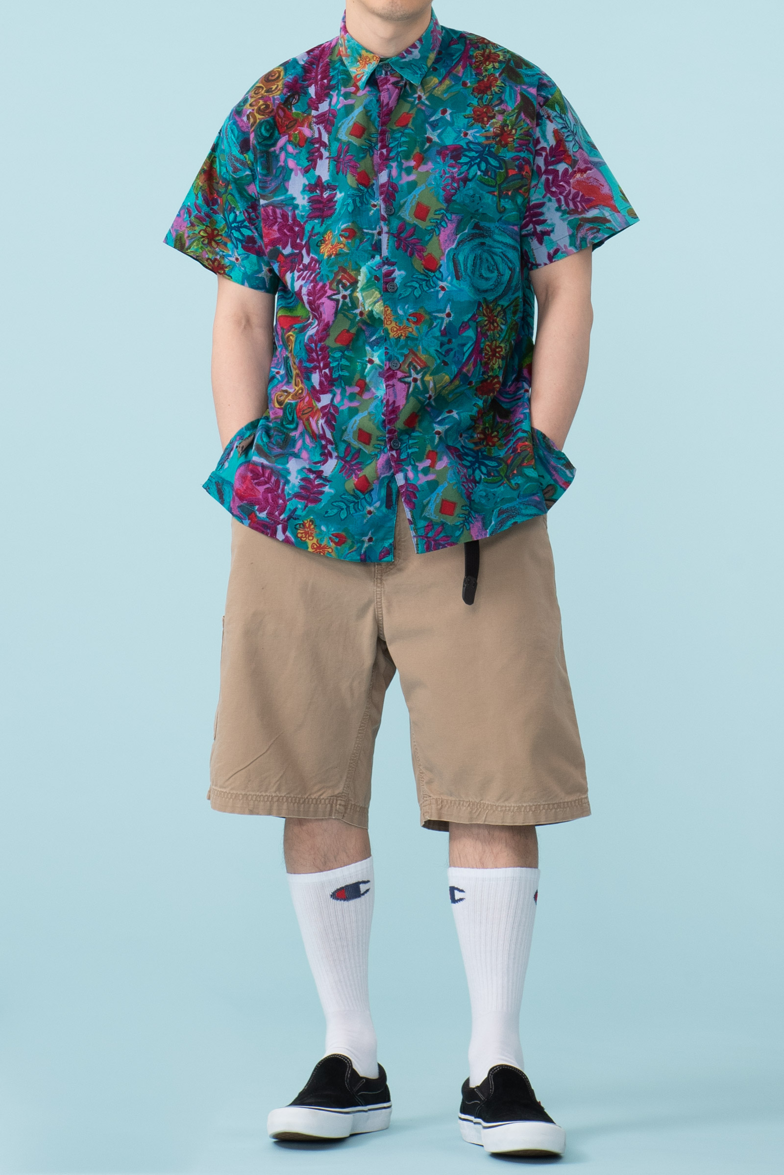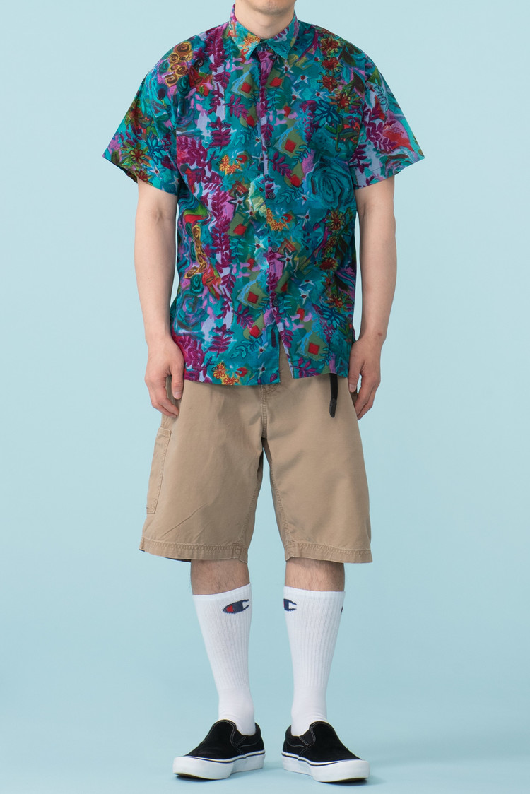 - 세기말적인 패턴의 하와이안 셔츠입니다. 코튼 소재라 서터릿한 느낌으로 연출하기 좋겠습니다. 핏이 좀 어벙한데, 어깨 선과 목의 여유없음에 그런 것 같습니다. 모델하고 옷이 안 맞았던 모양입니다. 좀 슬림한 분들에게 추천드립니다.