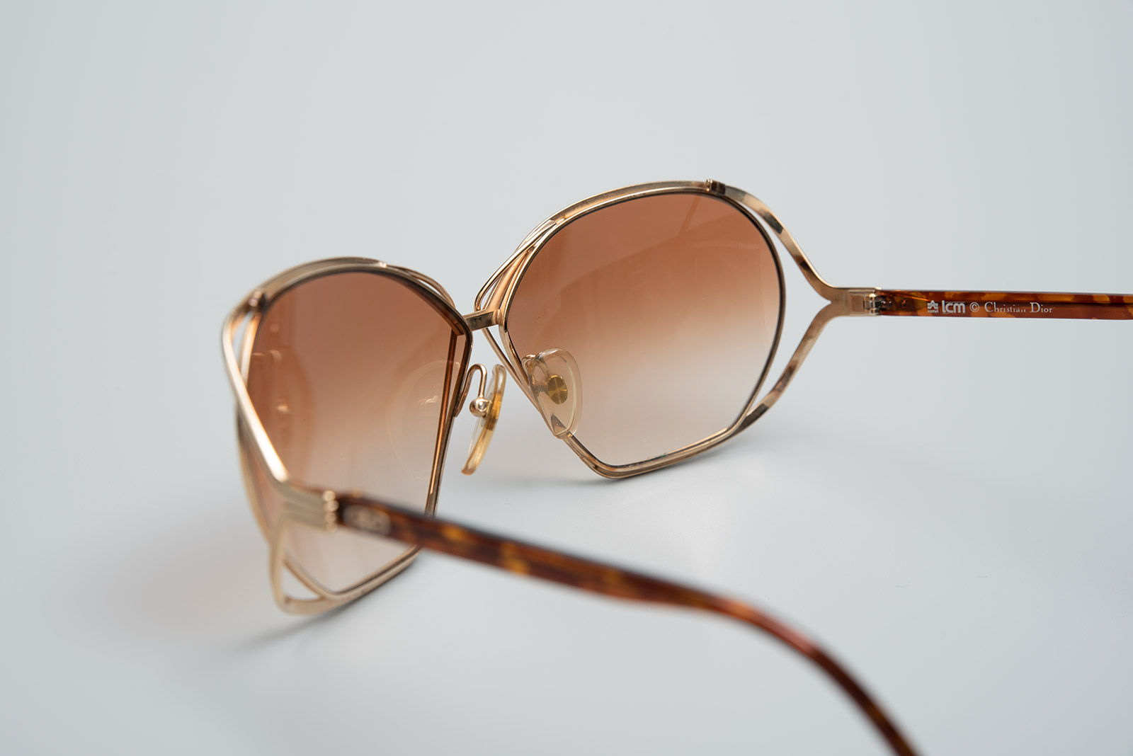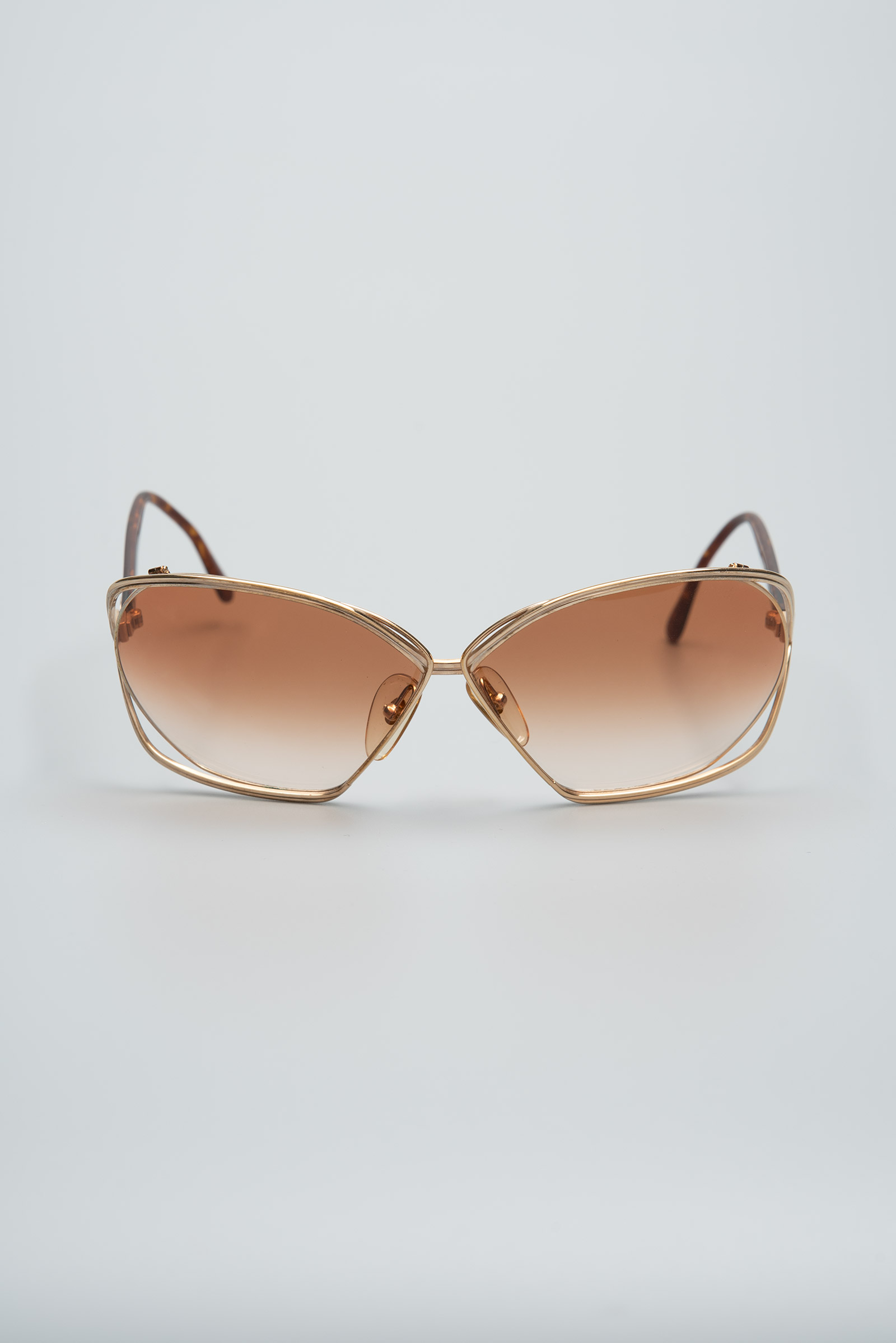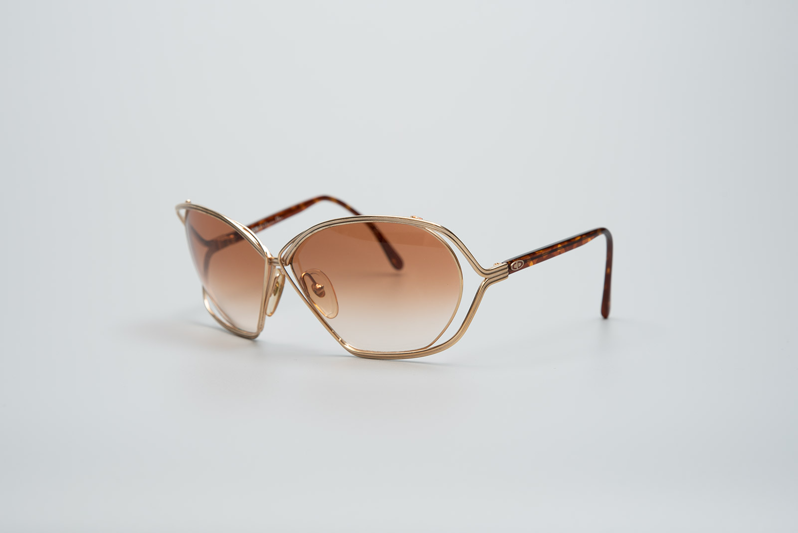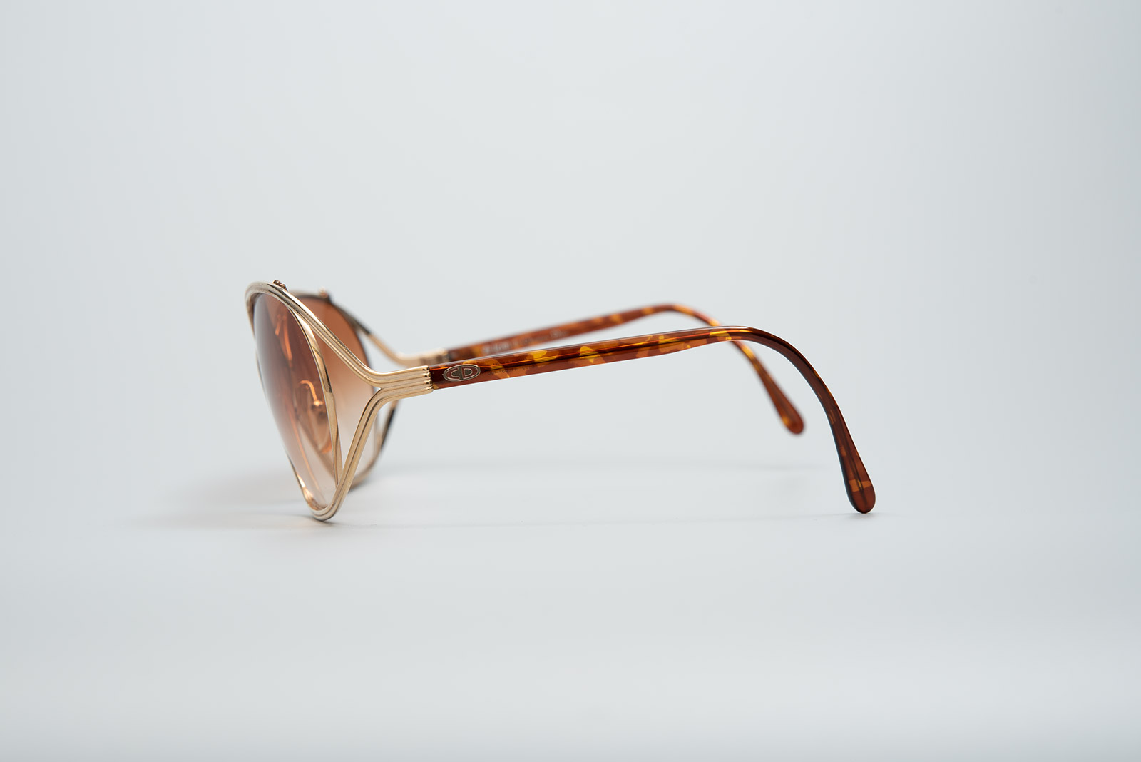 - 뉴룩으로 화려하게 등장하며 80년대 선글라스 프레임의 대유행을 이끌던 크리스찬 디올의 2499 80s 버터플라이 선글라스입니다. 은은한 갈색 그라데이션의 우아하고 고혹스러운 오리지널 렌즈와 견고하고 유려한 금색 프레임이 어우러져 럭셔리 그 자체인 프레임입니다.