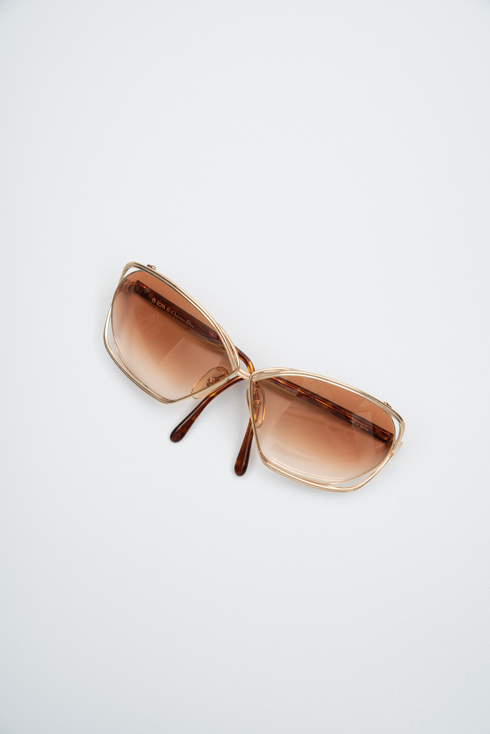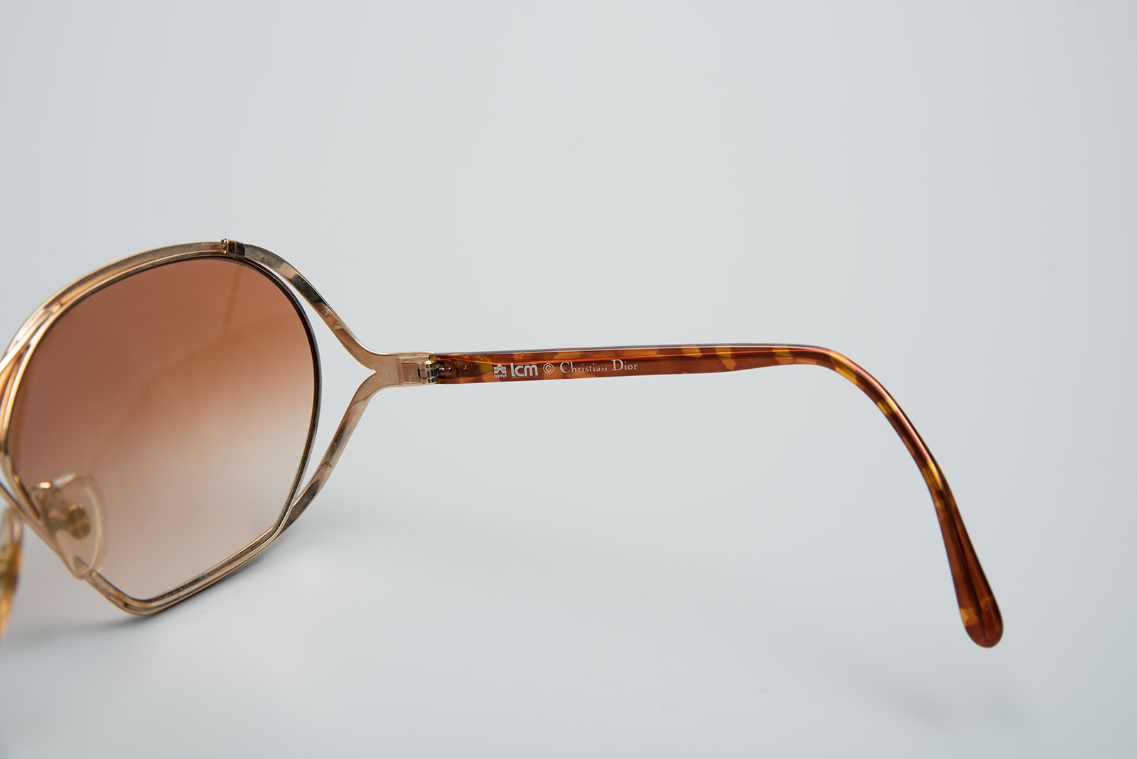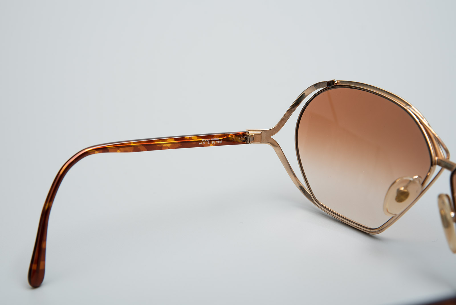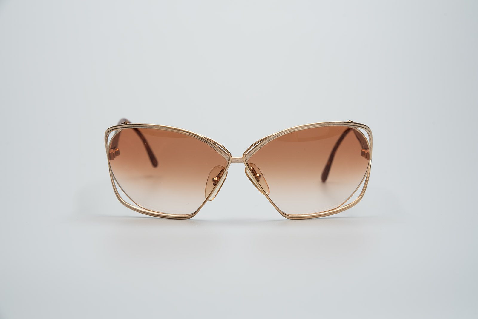 - 뉴룩으로 화려하게 등장하며 80년대 선글라스 프레임의 대유행을 이끌던 크리스찬 디올의 2499 80s 버터플라이 선글라스입니다. 은은한 갈색 그라데이션의 우아하고 고혹스러운 오리지널 렌즈와 견고하고 유려한 금색 프레임이 어우러져 럭셔리 그 자체인 프레임입니다.