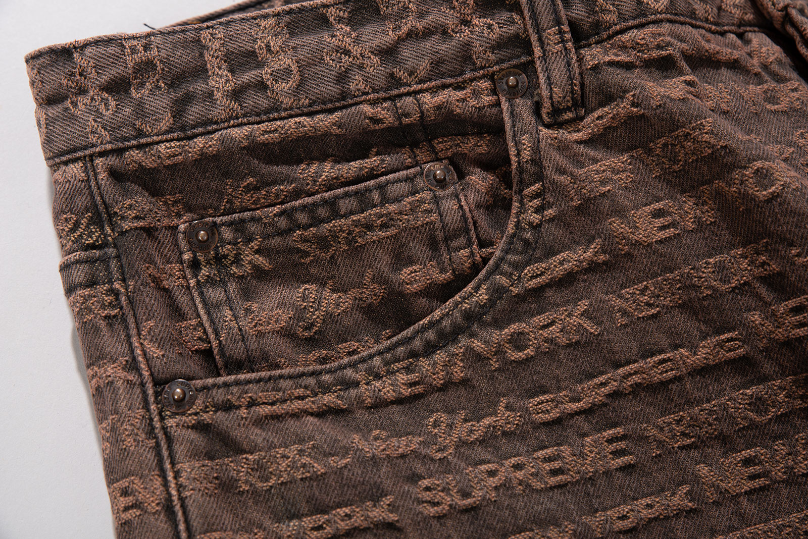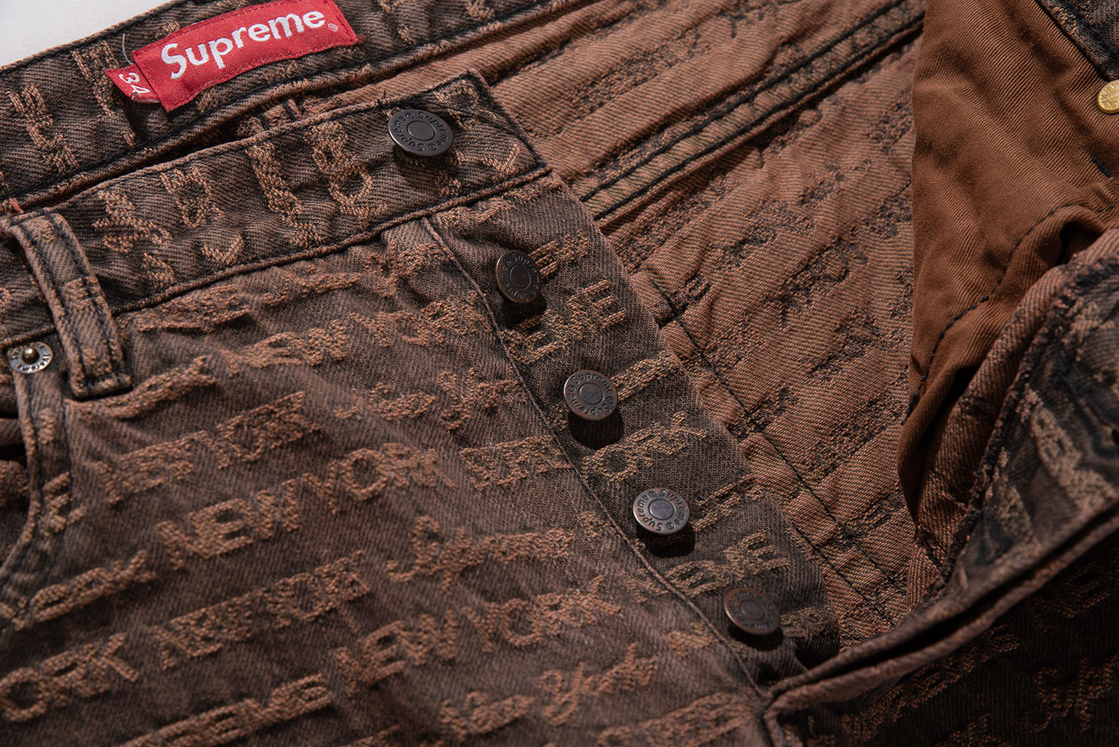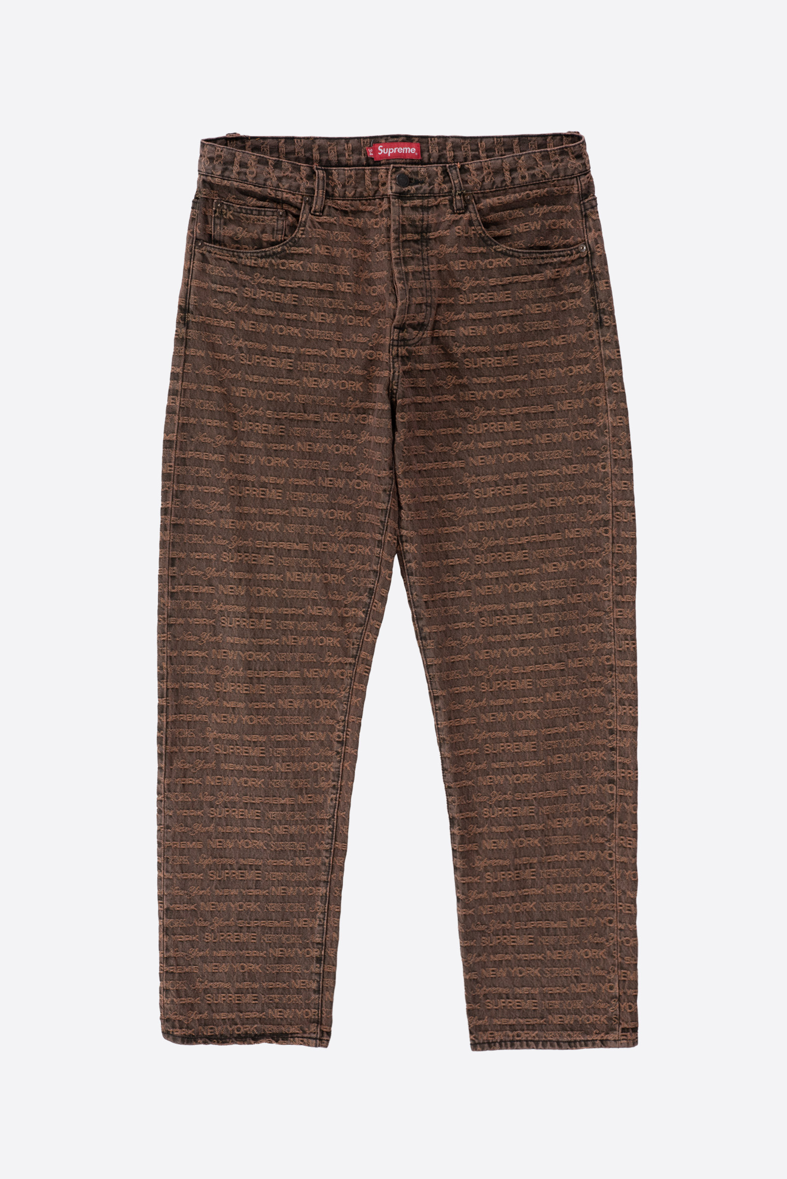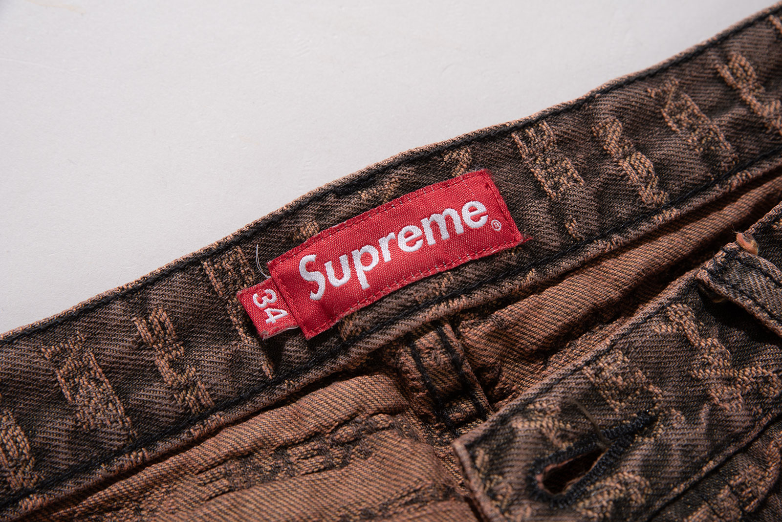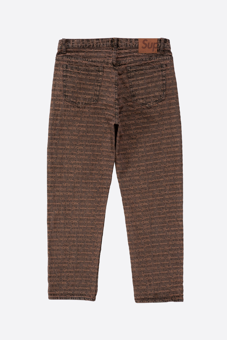 - 22FW 발매 된 슈프림의 멀티 타입 자카드 레귤러 진 브라운 컬러입니다. 구하기 힘든 34 사이즈로 오버 사이징하기 좋은 실루엣 연출되는 제품입니다.
