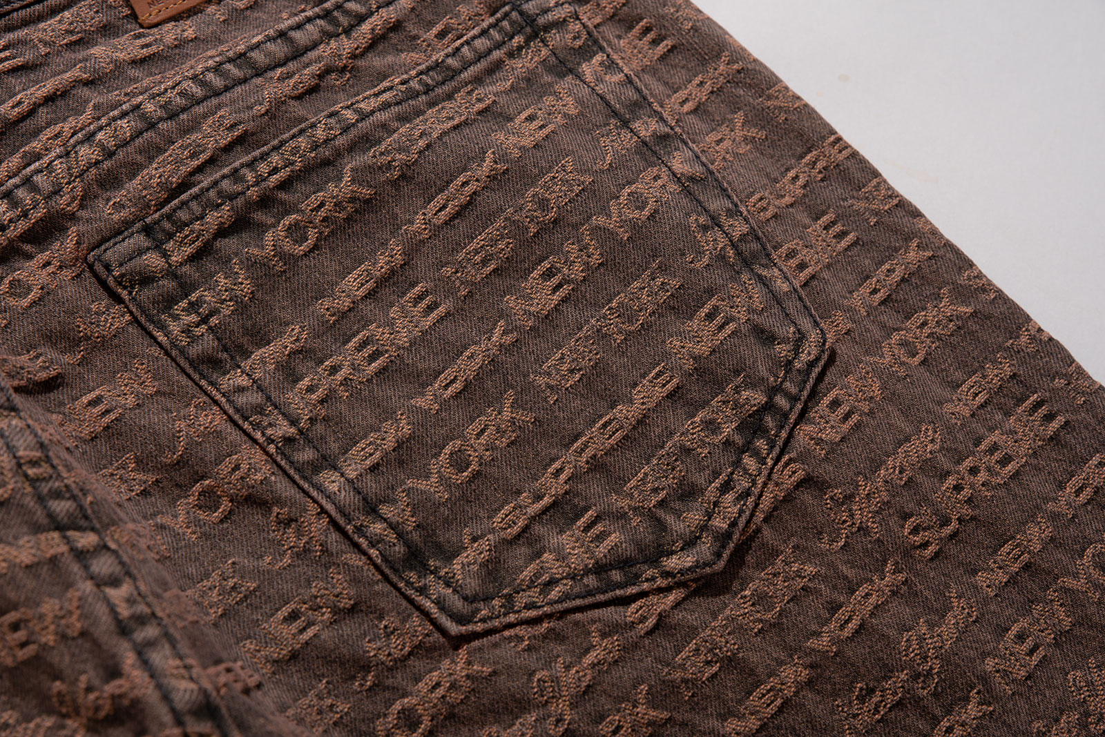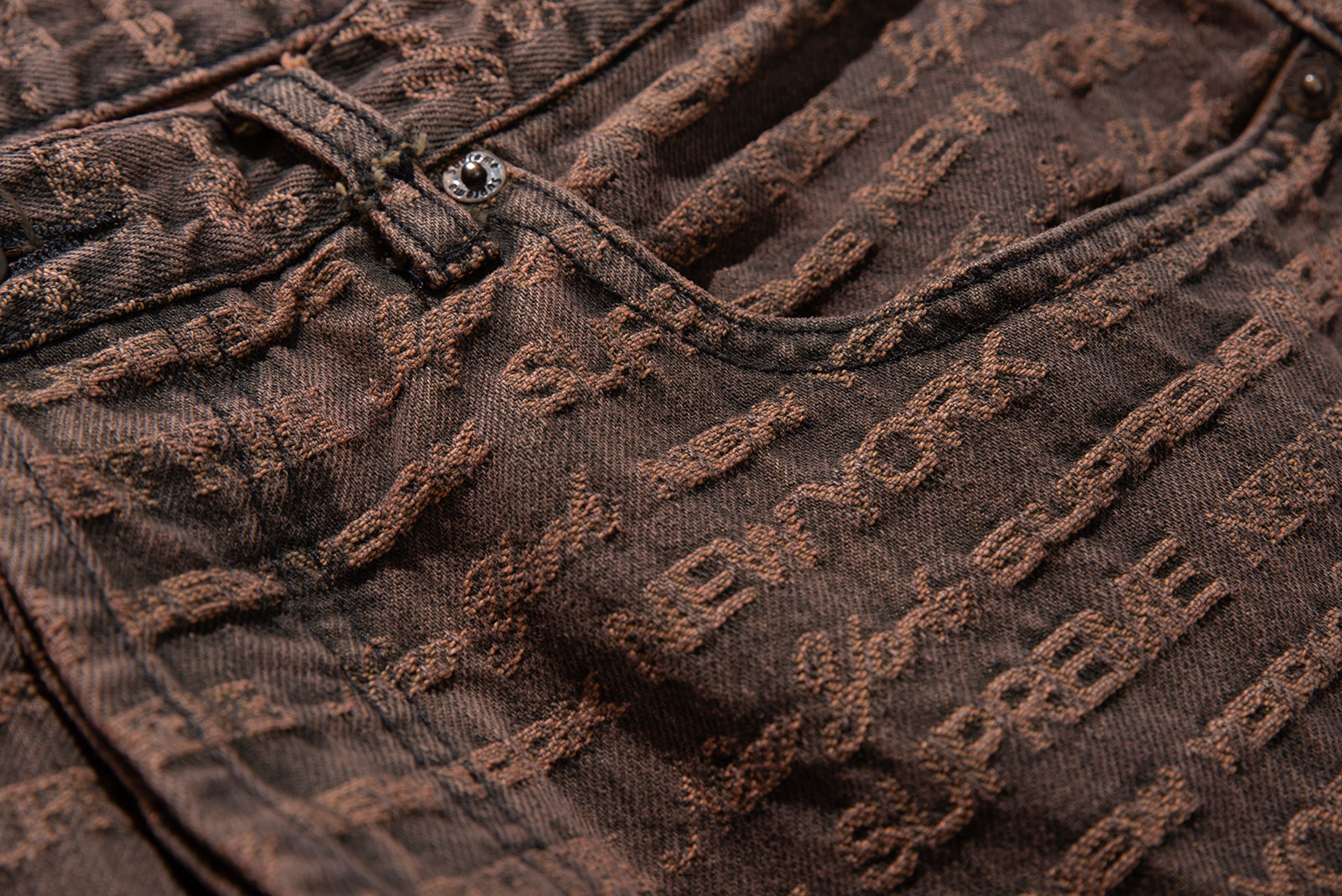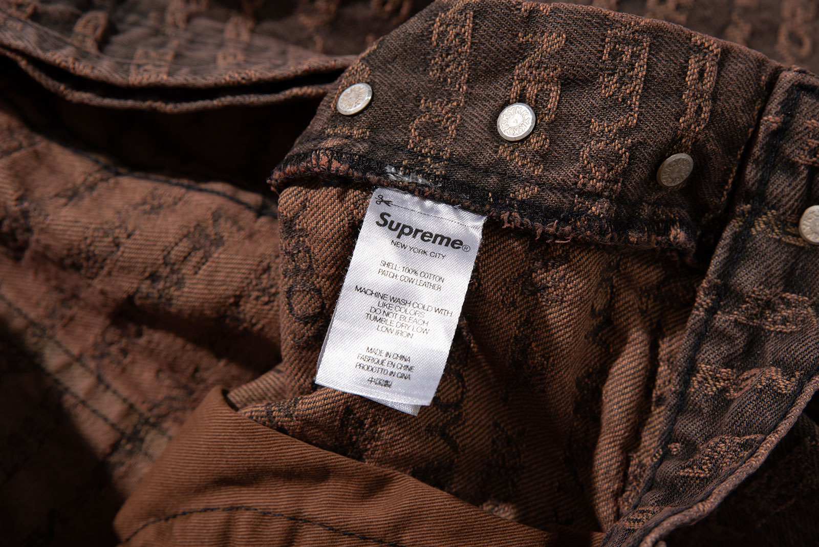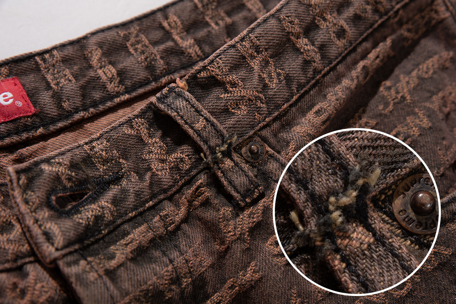 - 22FW 발매 된 슈프림의 멀티 타입 자카드 레귤러 진 브라운 컬러입니다. 구하기 힘든 34 사이즈로 오버 사이징하기 좋은 실루엣 연출되는 제품입니다.