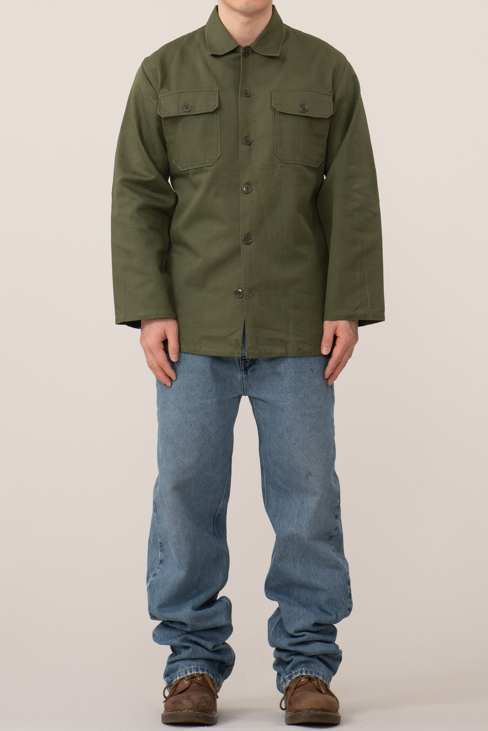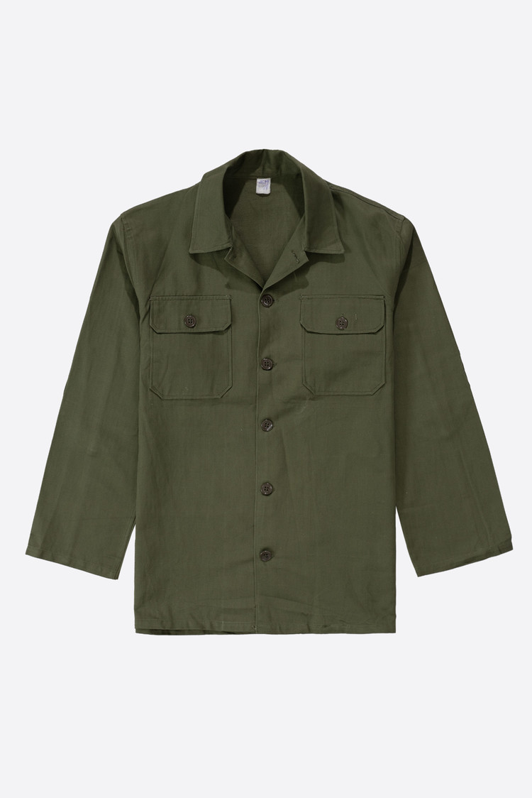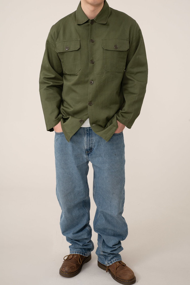 - 70 년대 육군/경찰용 HBT 재킷입니다. 어깨 견장이 없으며 팔꿈치 덧댐처리 된 제품으로, 해당 디자인 중에선 레어에 속하는 개체입니다. 데드스톡 컨디션으로 입고 되었습니다. 100-105 정도의 사이즈 감입니다.