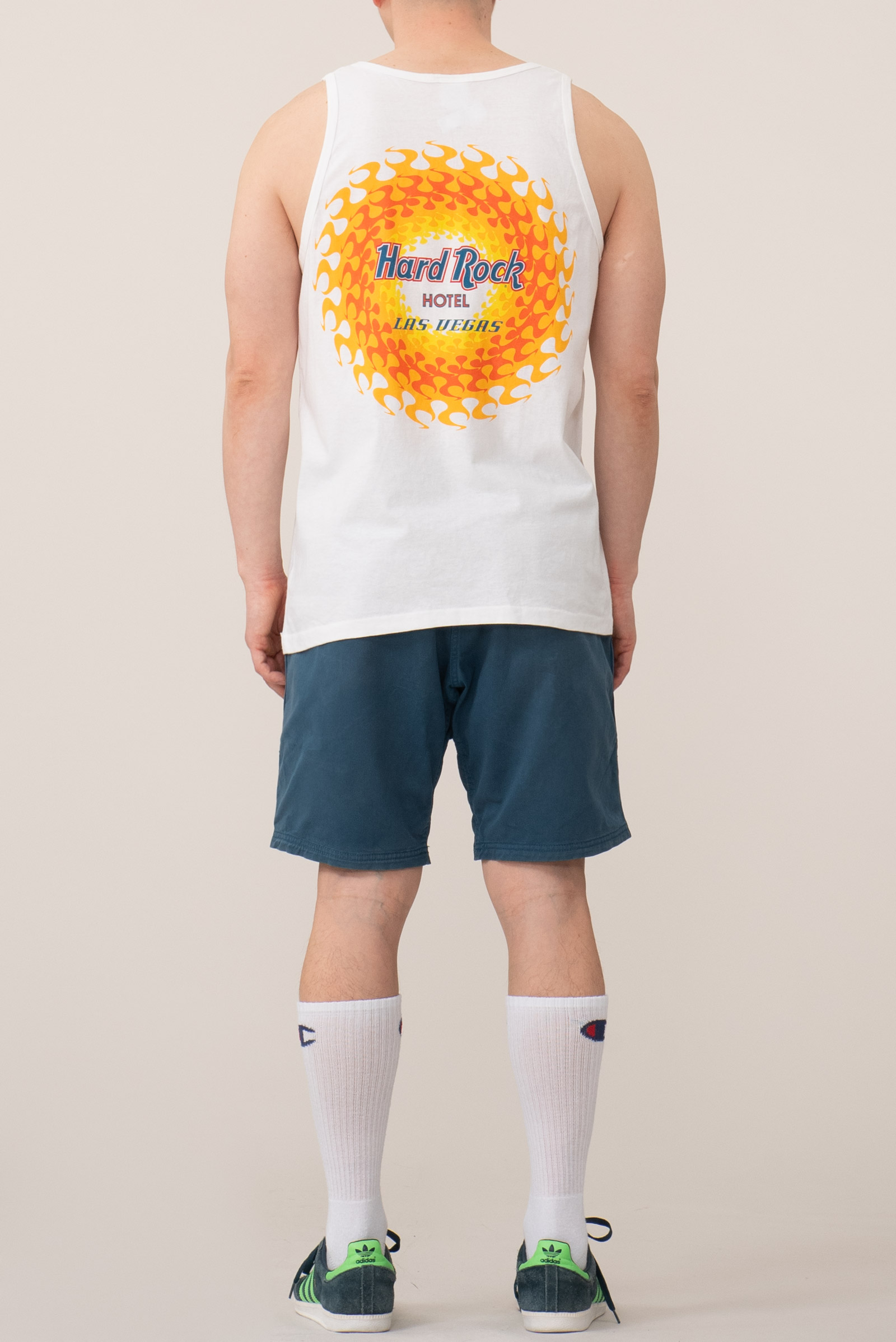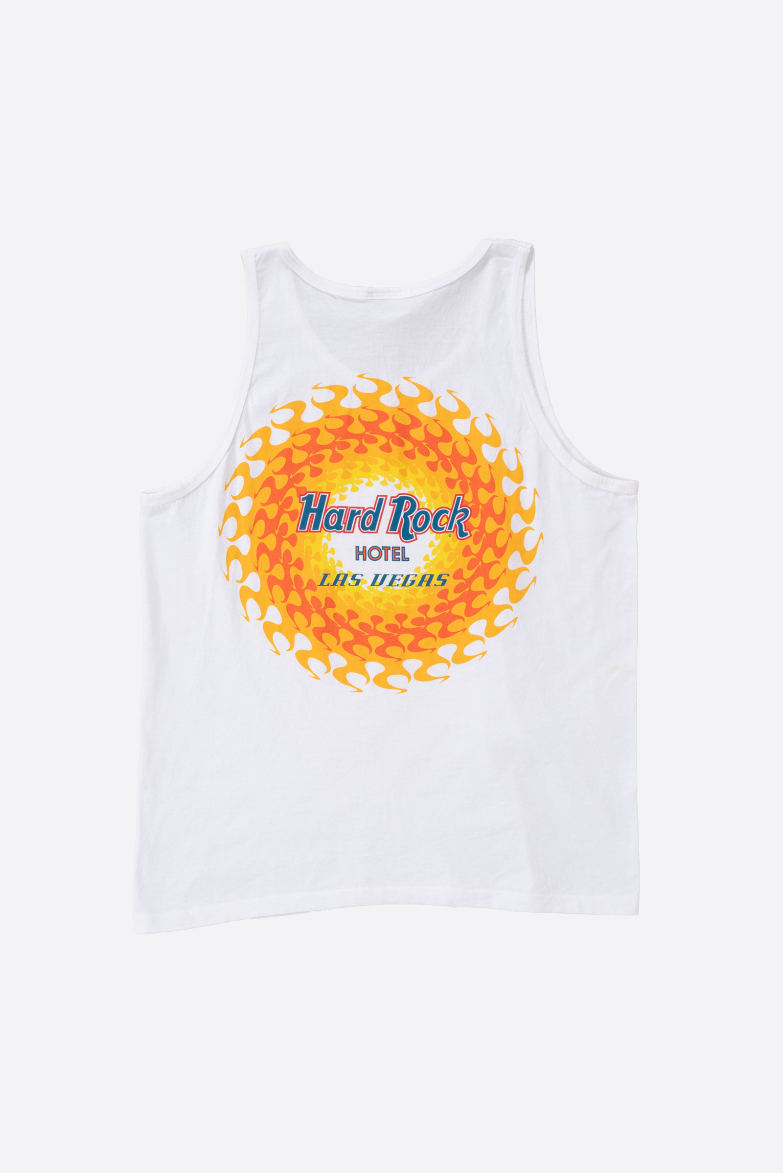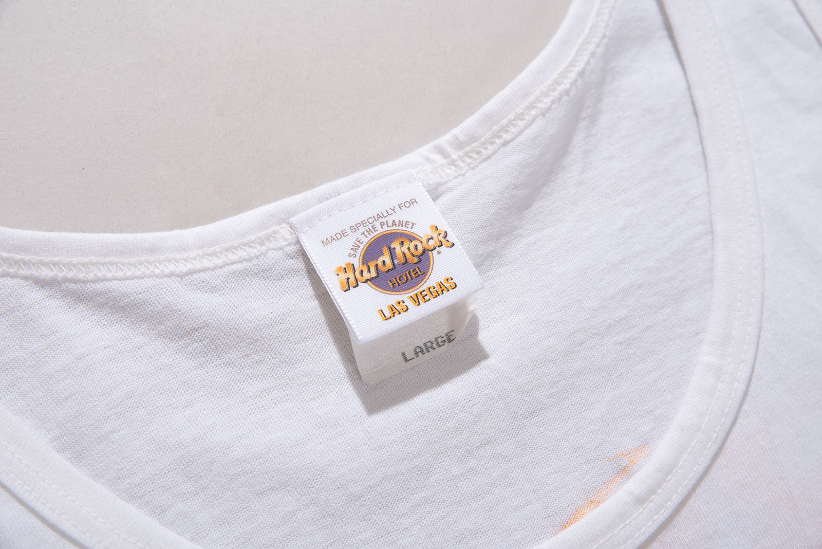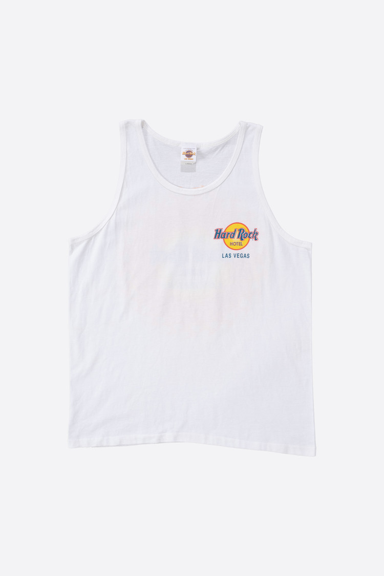 - 90 년대 제작 된 하드락 호텔 라스 베가스 민소매입니다. 전체적으로 깔끔한데, 등판 프린팅 옆으로 노란 오염이 있습니다.