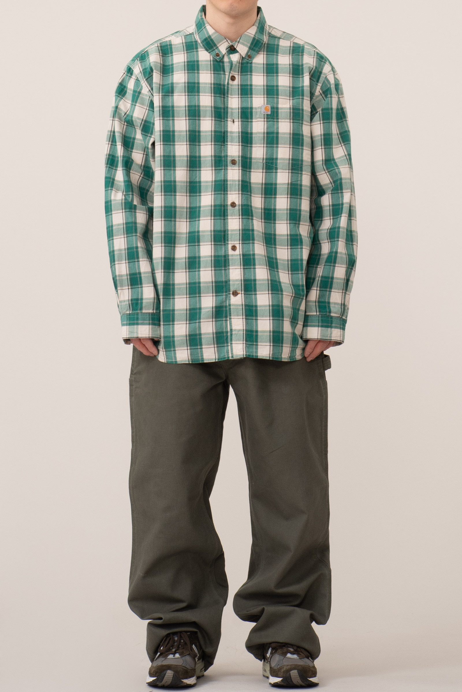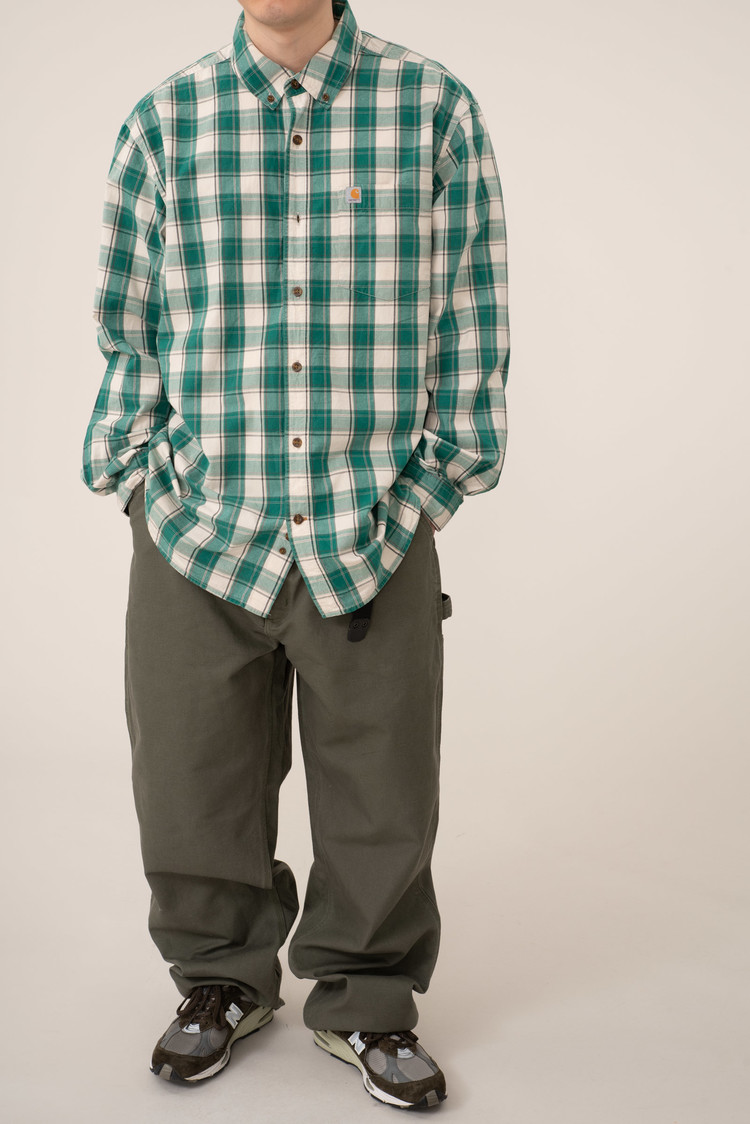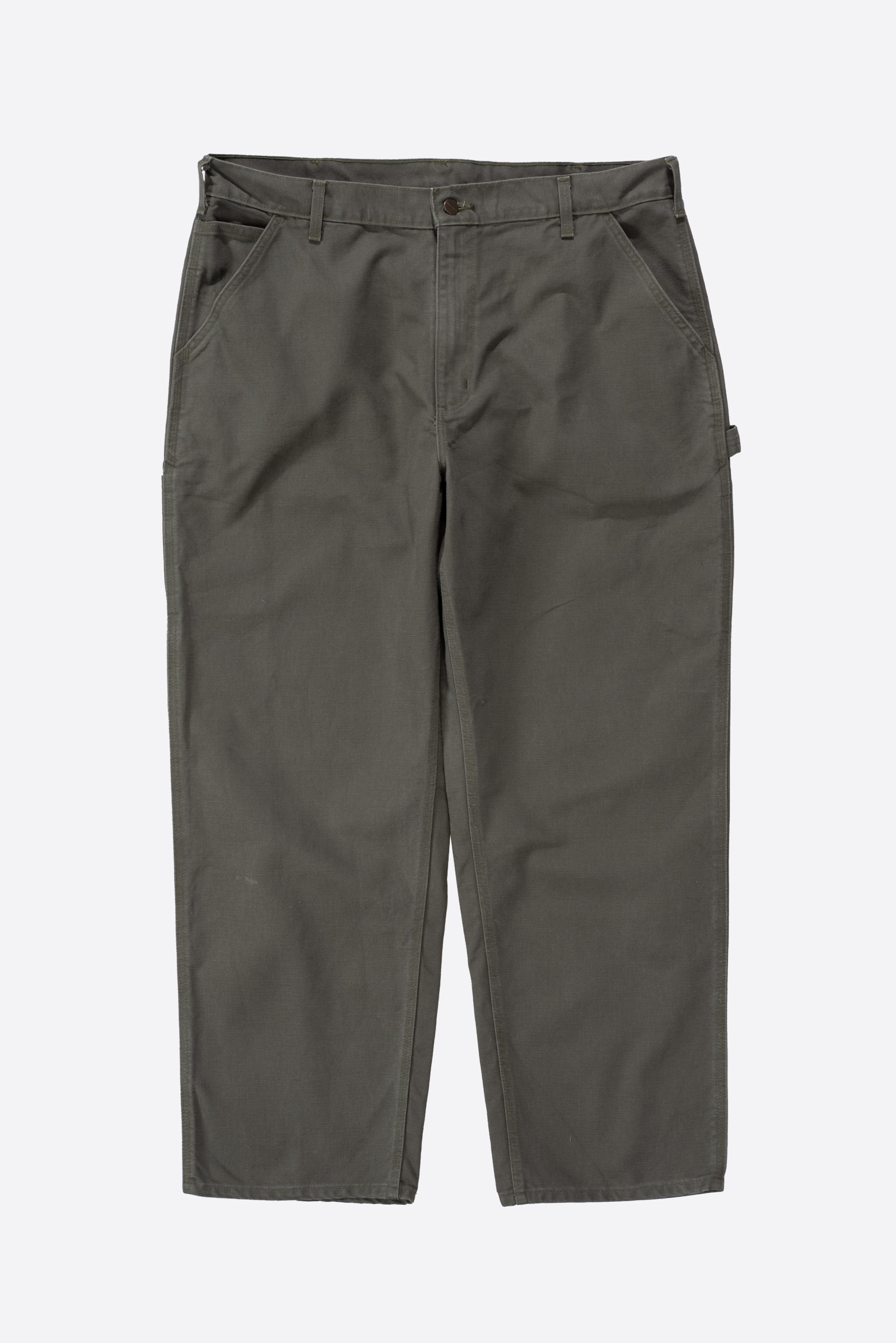 - 18 년도에 제작 된 칼하트 싱글니 모스 컬러입니다. 여유있는 사이즈로 입고 되어 오버 사이징하기 딱 좋은 실루엣 연출되는 팬츠입니다. 사용감이 어느정도 있긴한데, 깨끗한 편입니다.