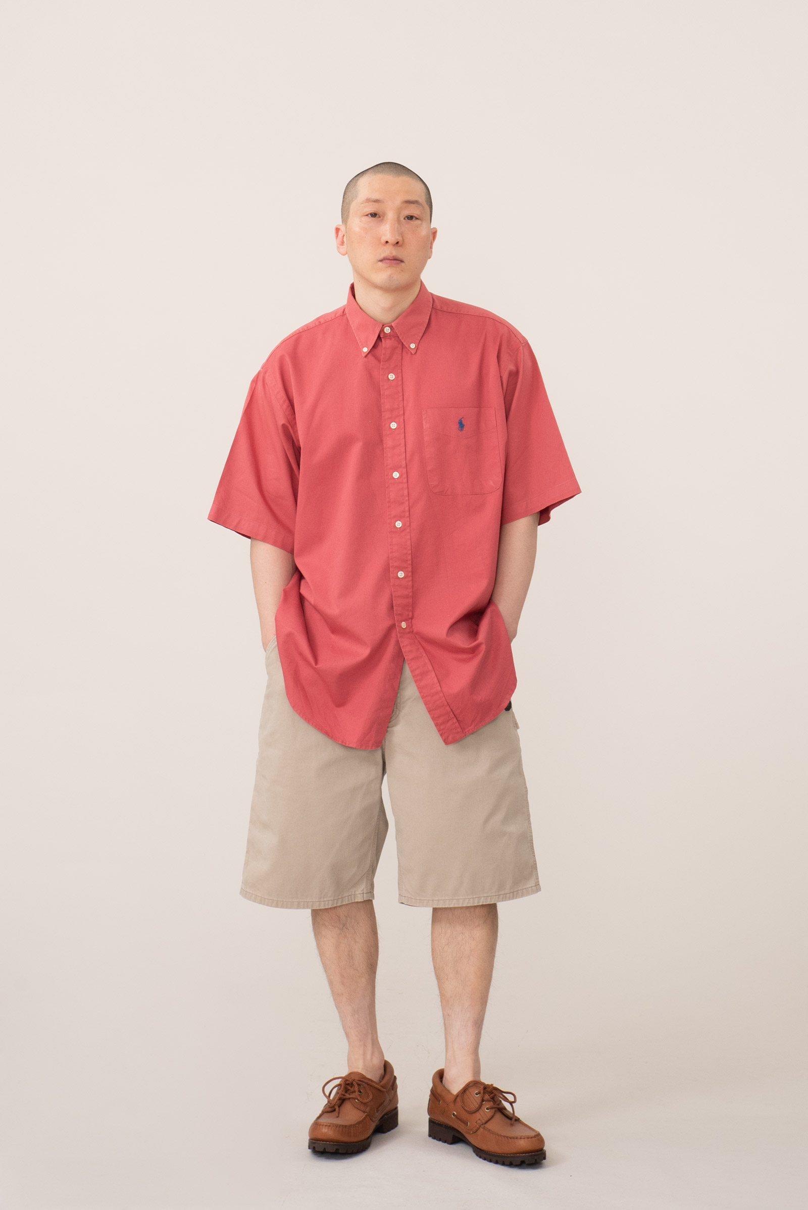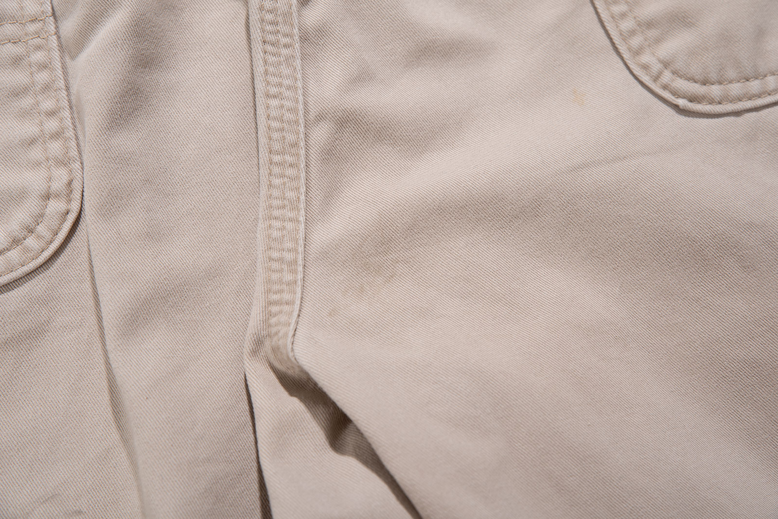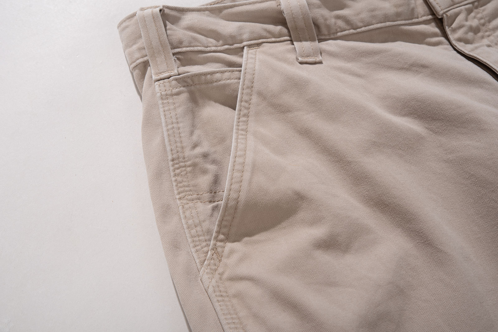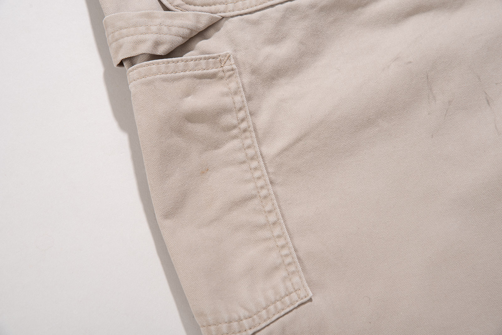 - 도톰한 능직으로 만들어진 칼하트 워크 쇼츠입니다. 폴로 올드 치노 쇼츠 느낌이 있는데, 그것 보단 좀 더 진득한 무게감이 느껴지는 제품입니다. 전체적으로 오염이 좀 있어요. 컨디션은 나쁘지 않습니다.