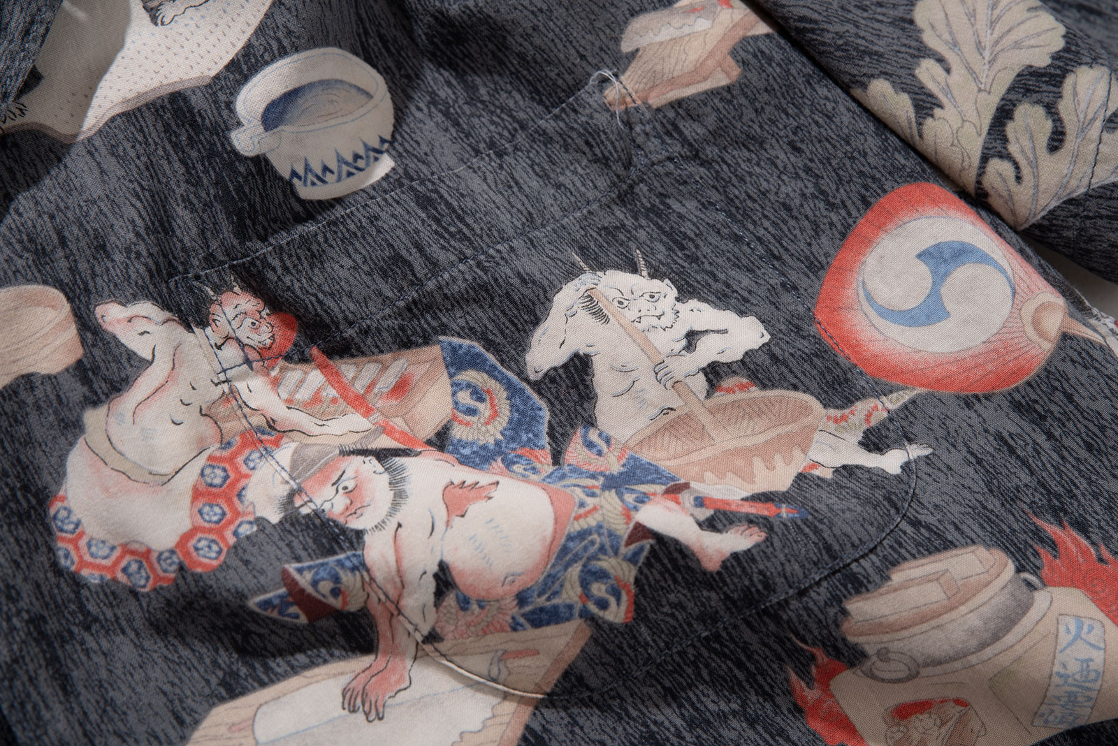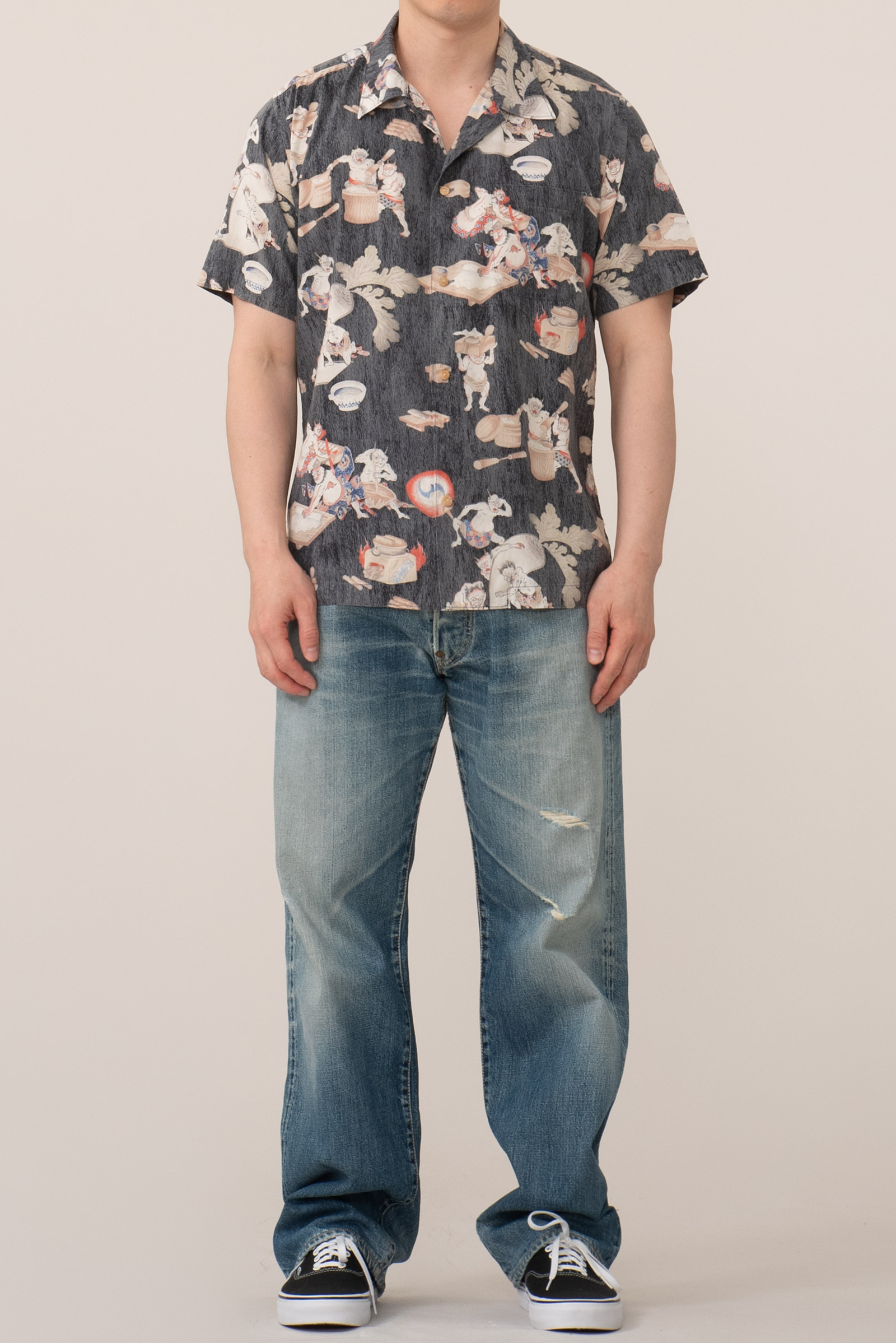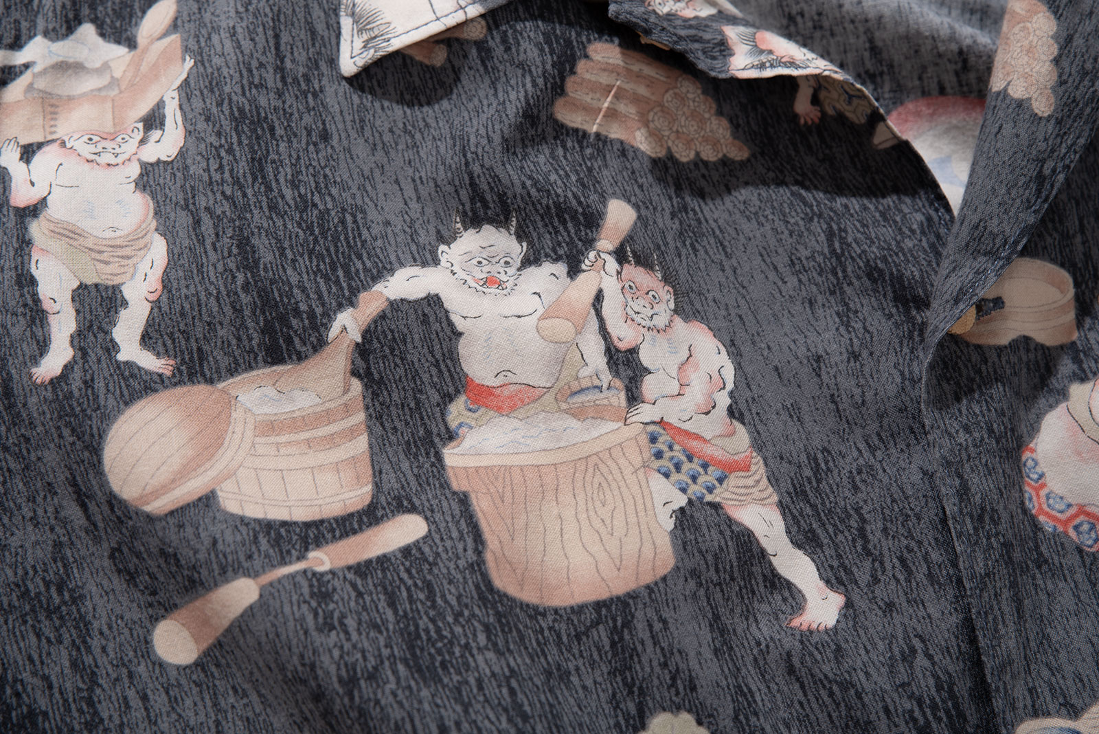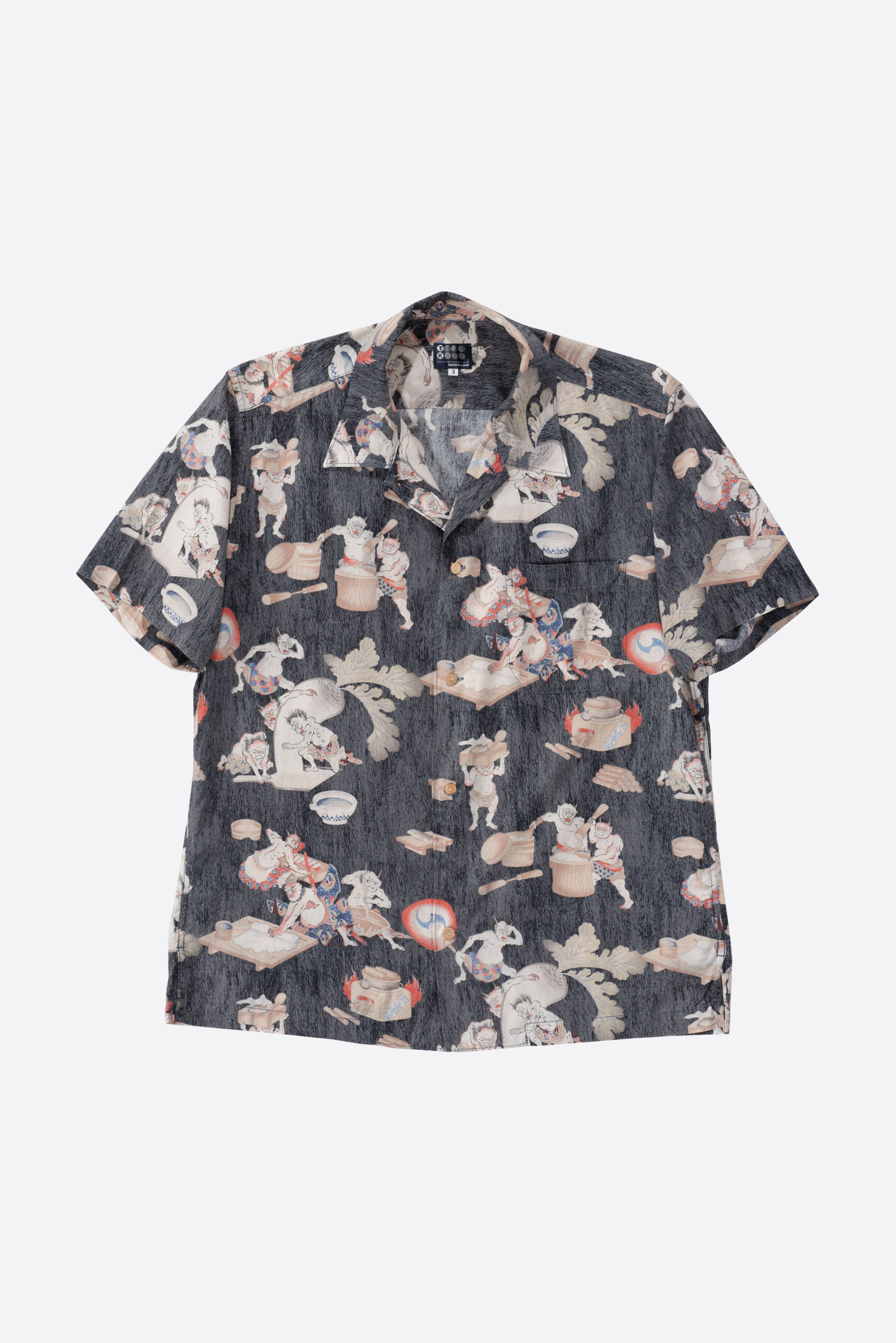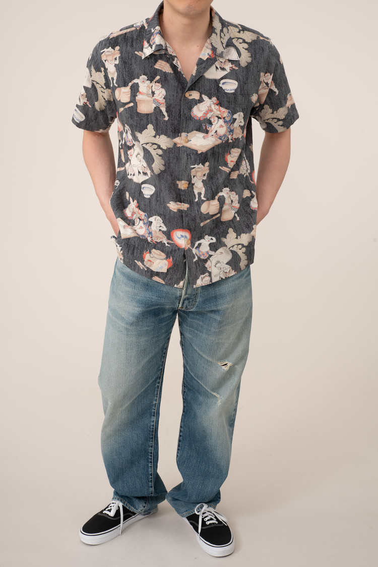 - 타케오 키쿠치의 오니 패턴 하와이안 셔츠입니다. 일본 도깨비들이 떡방아를 찧어 떡을 만들어 판매한다는 설정의 패턴인데, 자세히 뜯어보면 참 아기자기하고 재미있고 귀엽(?)습니다. ㅎㅎ