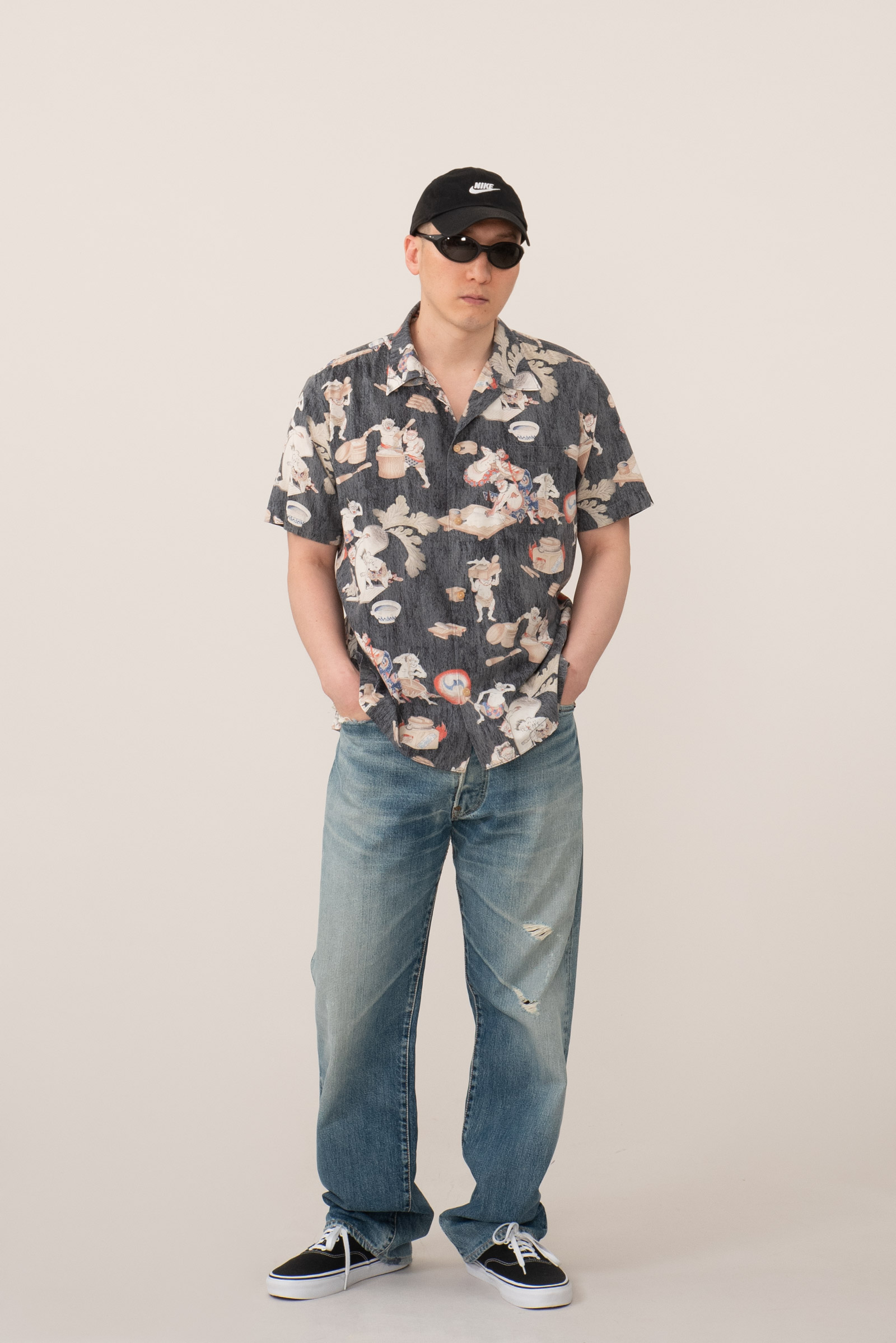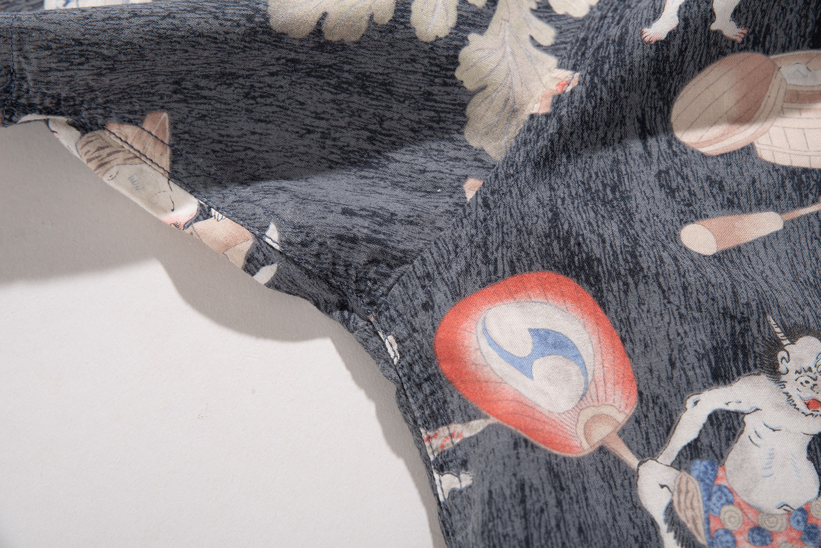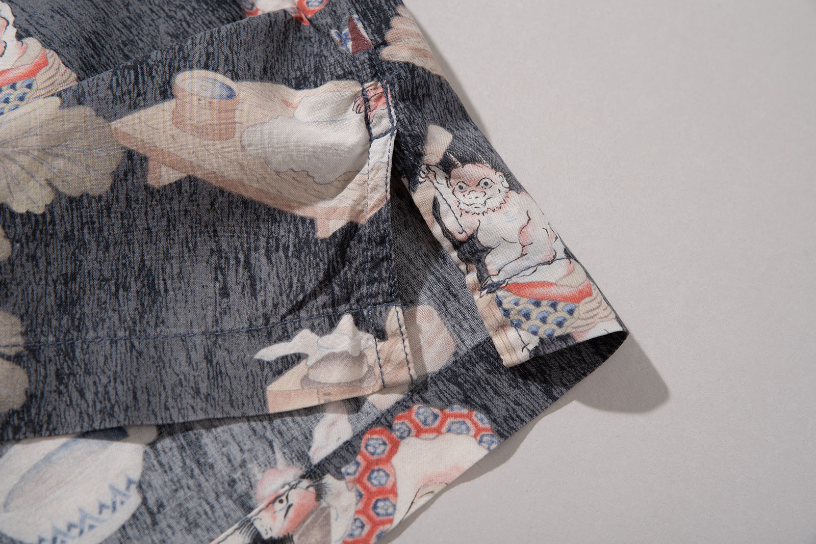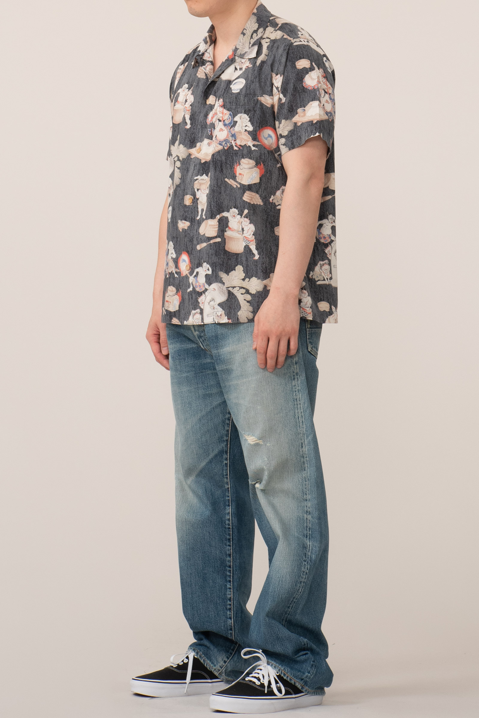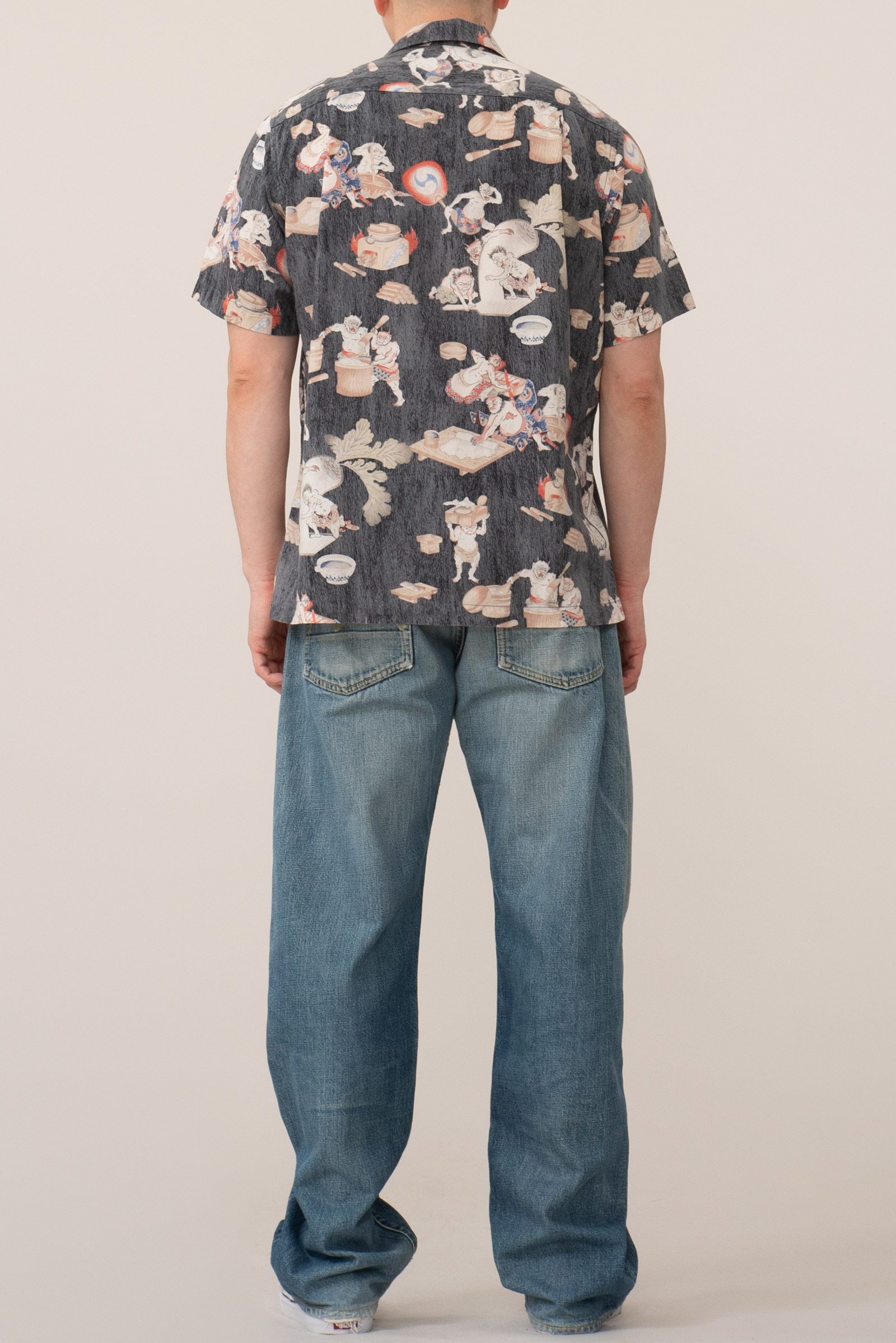 - 타케오 키쿠치의 오니 패턴 하와이안 셔츠입니다. 일본 도깨비들이 떡방아를 찧어 떡을 만들어 판매한다는 설정의 패턴인데, 자세히 뜯어보면 참 아기자기하고 재미있고 귀엽(?)습니다. ㅎㅎ