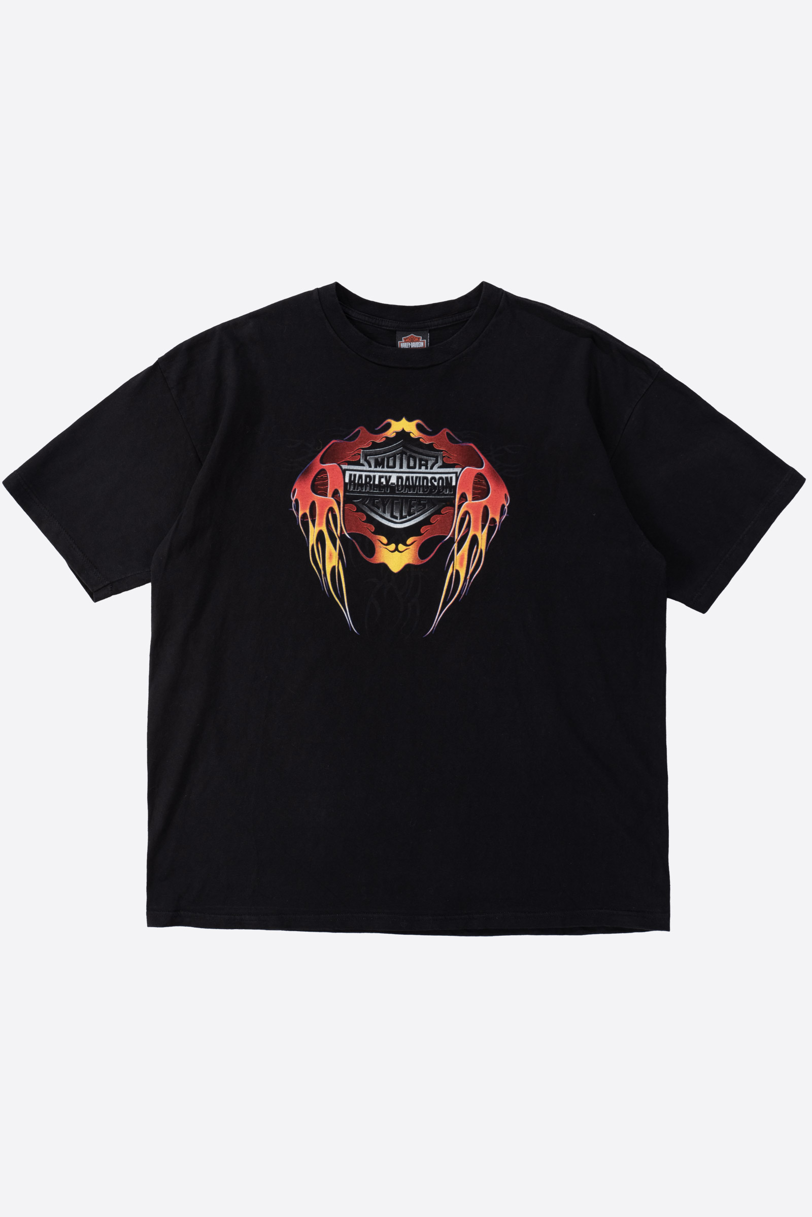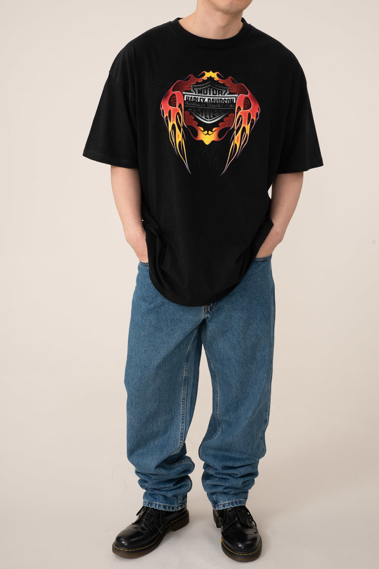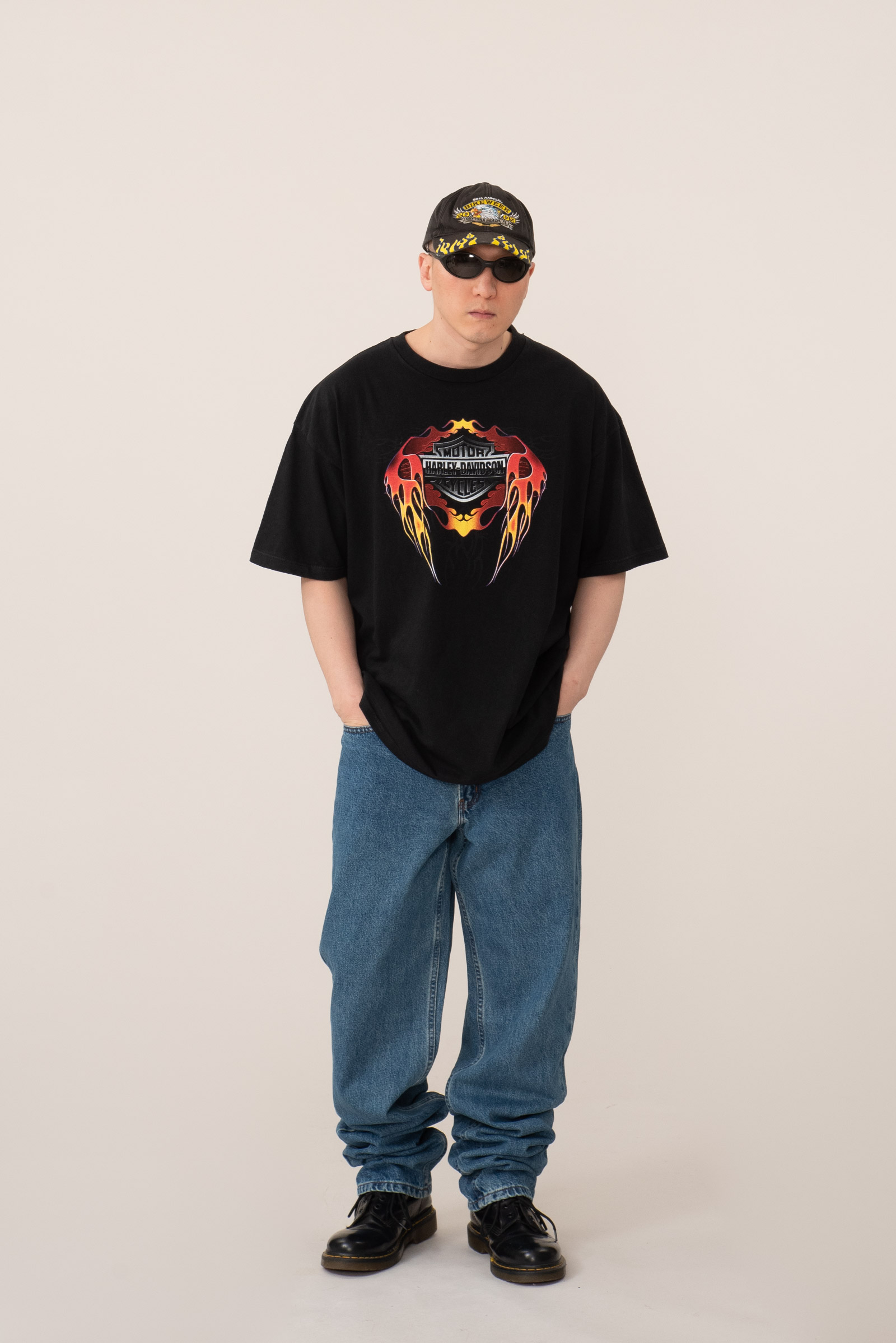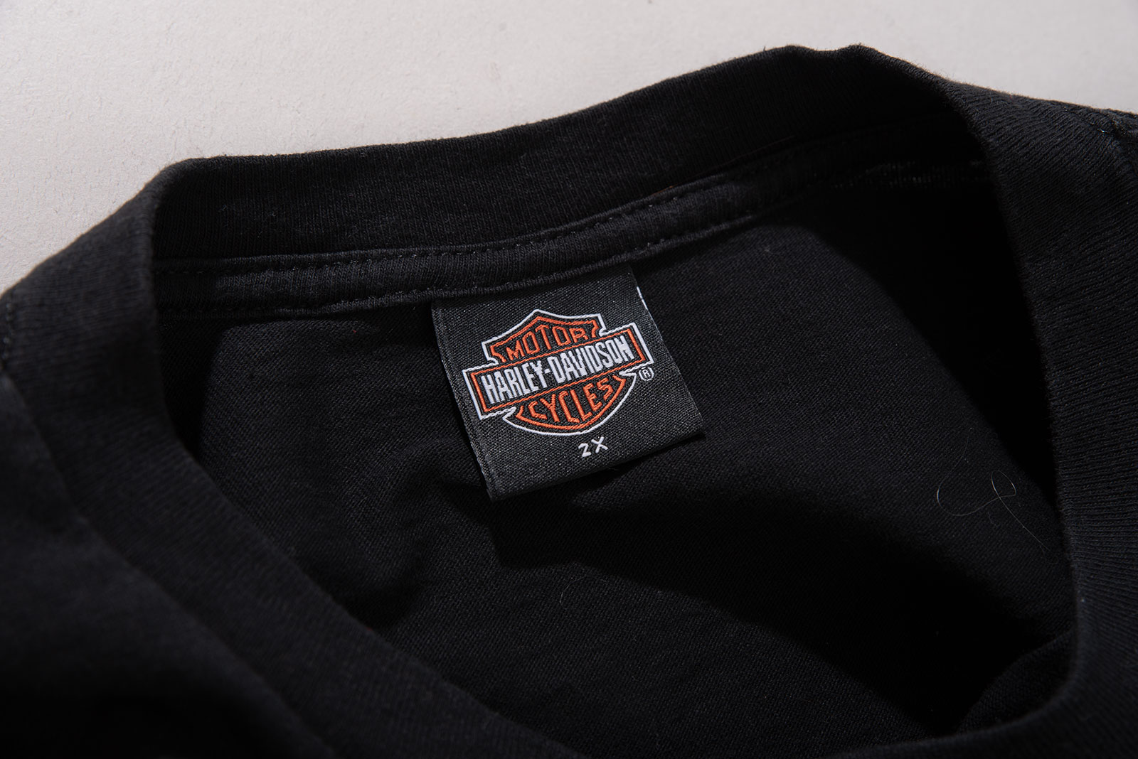 - 2001 년에 제작 된 할리 데이비슨의 반팔 티셔츠입니다. 2XL 사이즈로, 정 사이즈 착용 시 120 정도의 사이즈 감입니다만, 그러기엔 총장이 길지 않아요. 105-110 정도가 적당할 것 같고, 오버 사이징하실 분에게 추천드립니다.