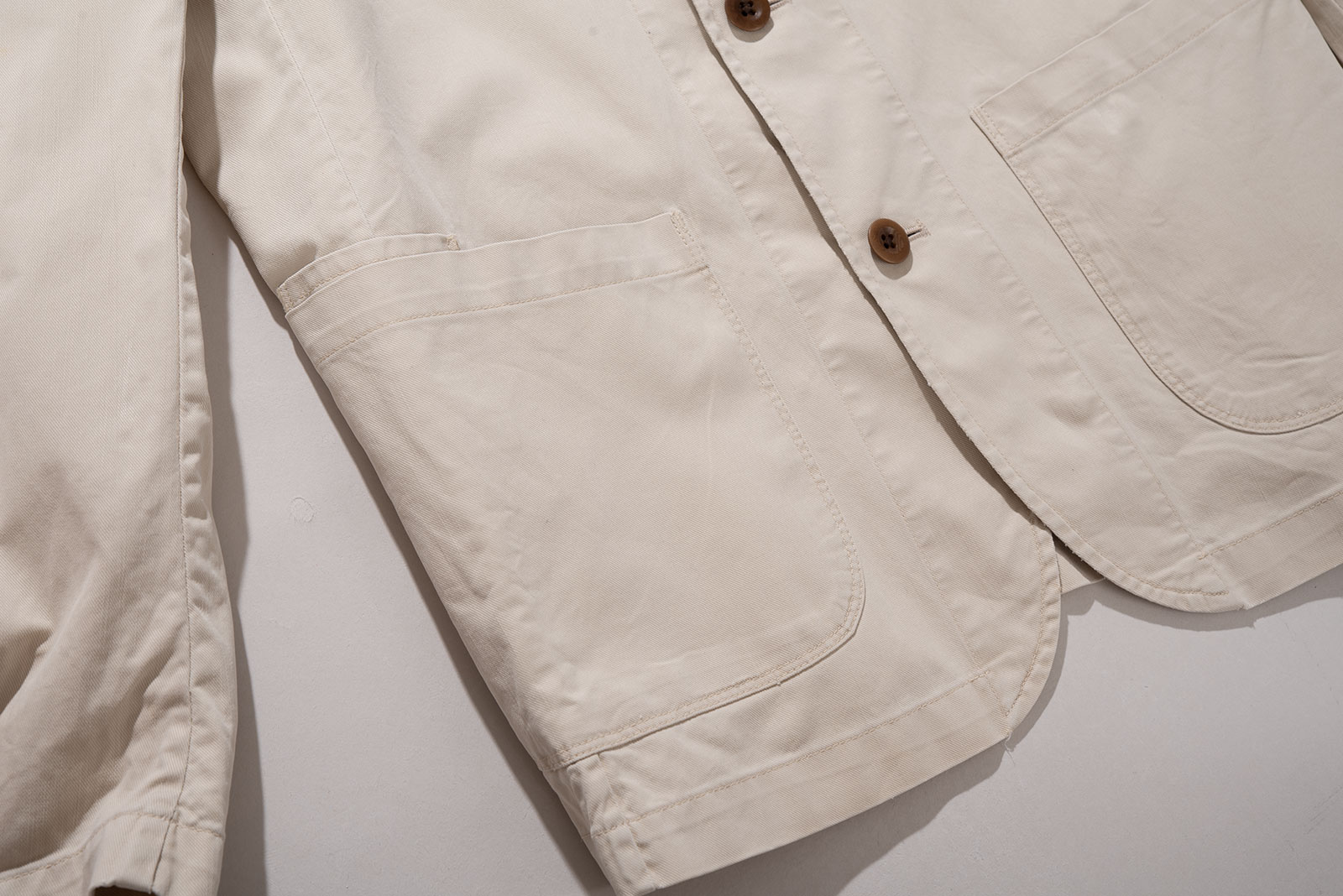 - 두산제 구형 폴로 랄프로렌의 3버튼 코튼 블레이져입니다. 전체적으로 사용감이 있고 가장자리는 닳았습니다. 이런 느낌이 좋아서 소개하는 제품입니다. 잘 정돈 시켜 깨끗한 느낌으로 입으실 분은 패스해주시면 좋겠고, 자연스럽고 편안하게 막(?) 느낌가는대로 입으실 분들에게 추천드립니다. 어릴 때 옷이 워낙 귀했던 터라 새 옷은 부담스러워서 못 입겠더라고요. 막 입을 수가 없으니, 결국은 매일 입던 편안한 옷에 손이 훨씬 더 많이 갔던 기억이 납니다. 새로 산 옷들은 아까우니까 모셔놓고 그랬네요.