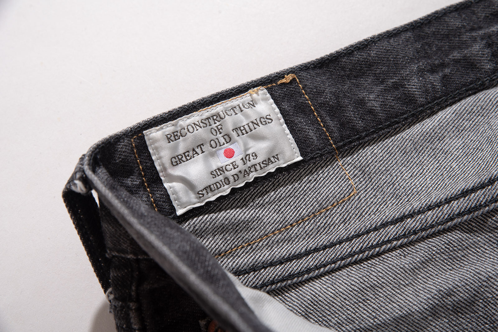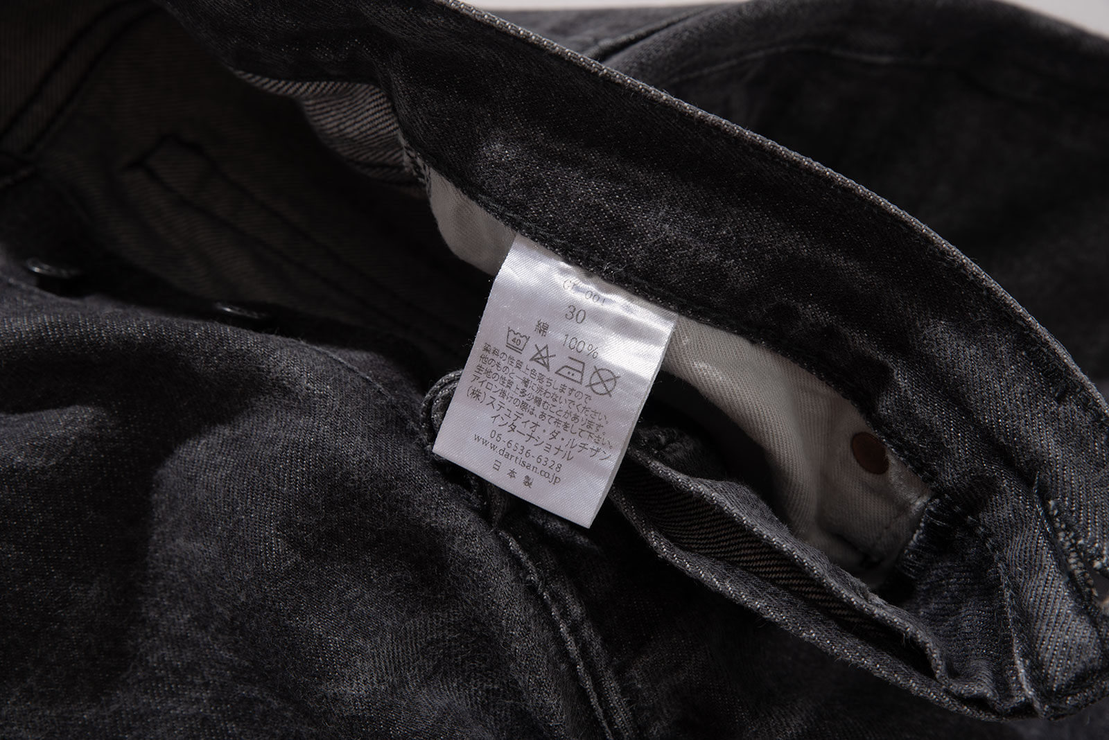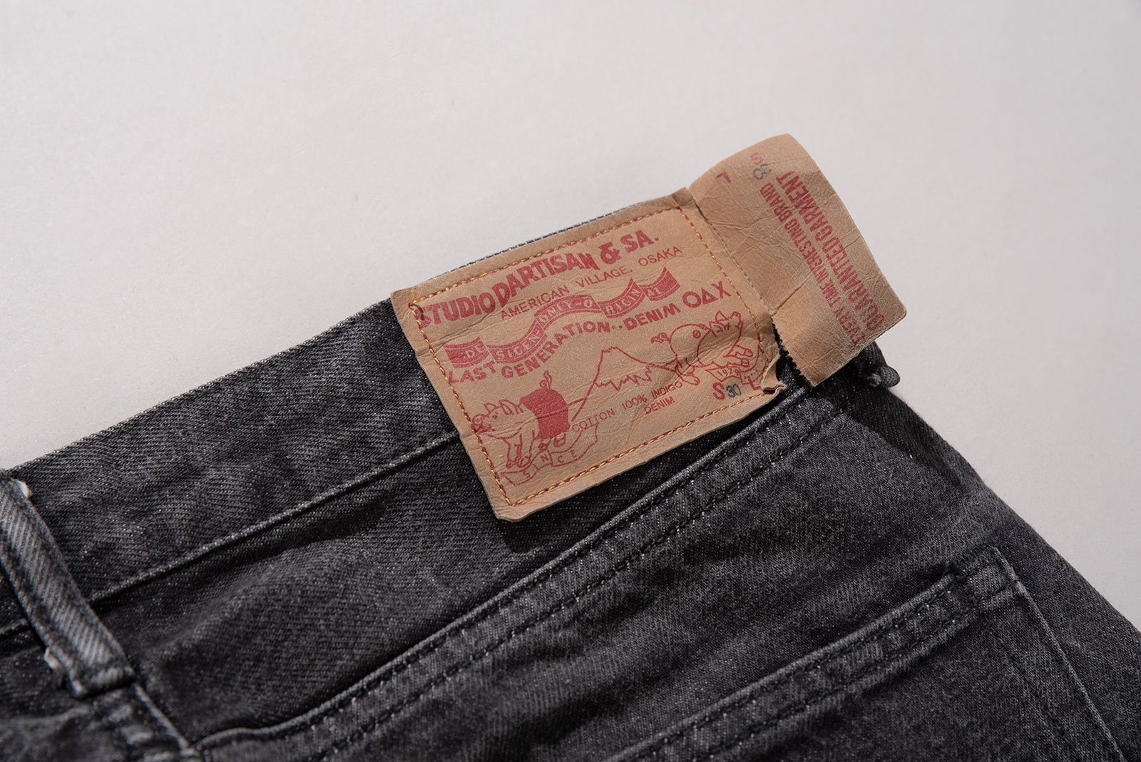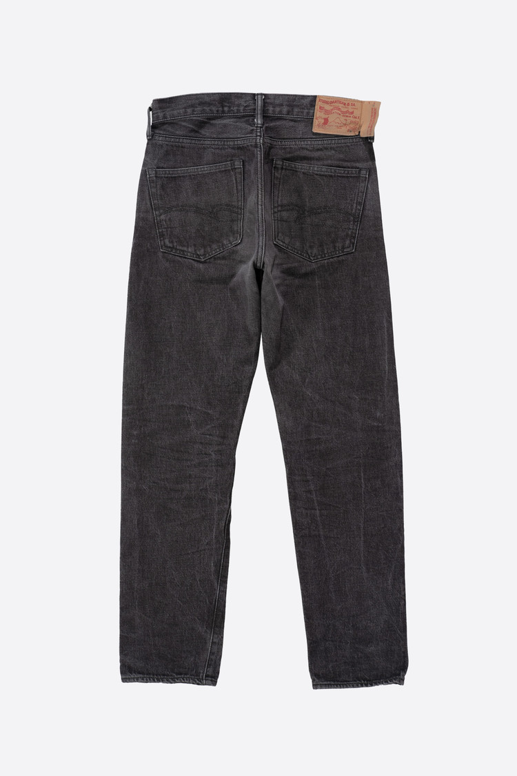 - 스튜디오 다치산의 GL-001 모델입니다. 아이비 테이퍼드 핏으로, 깔끔하게 떨어지는 밑단이 특징입니다. 수축이 되어서 27 인치 정도 된 것 같은데, 아무튼 워싱도 많이 진행되고 그렇습니다.