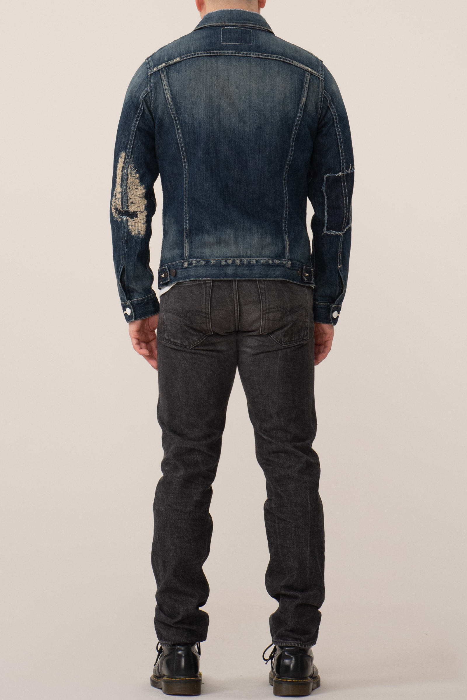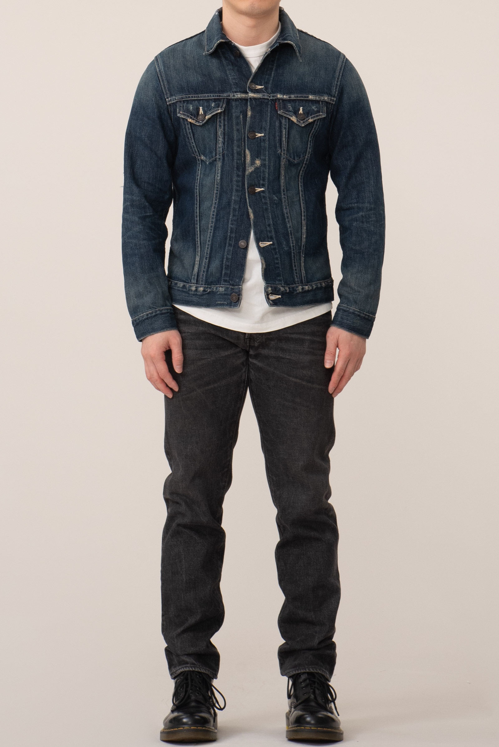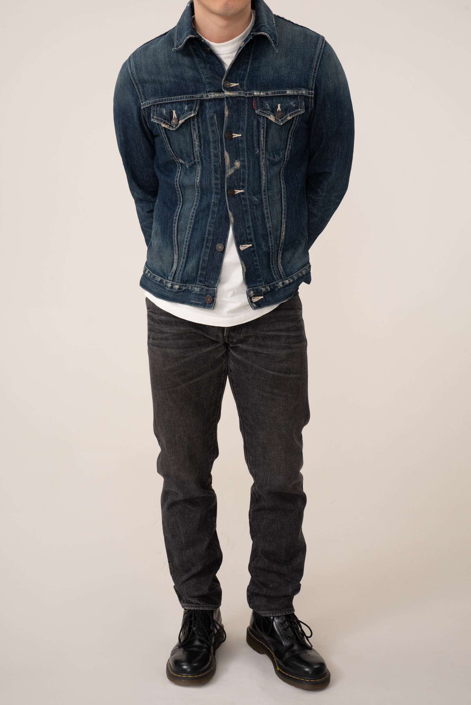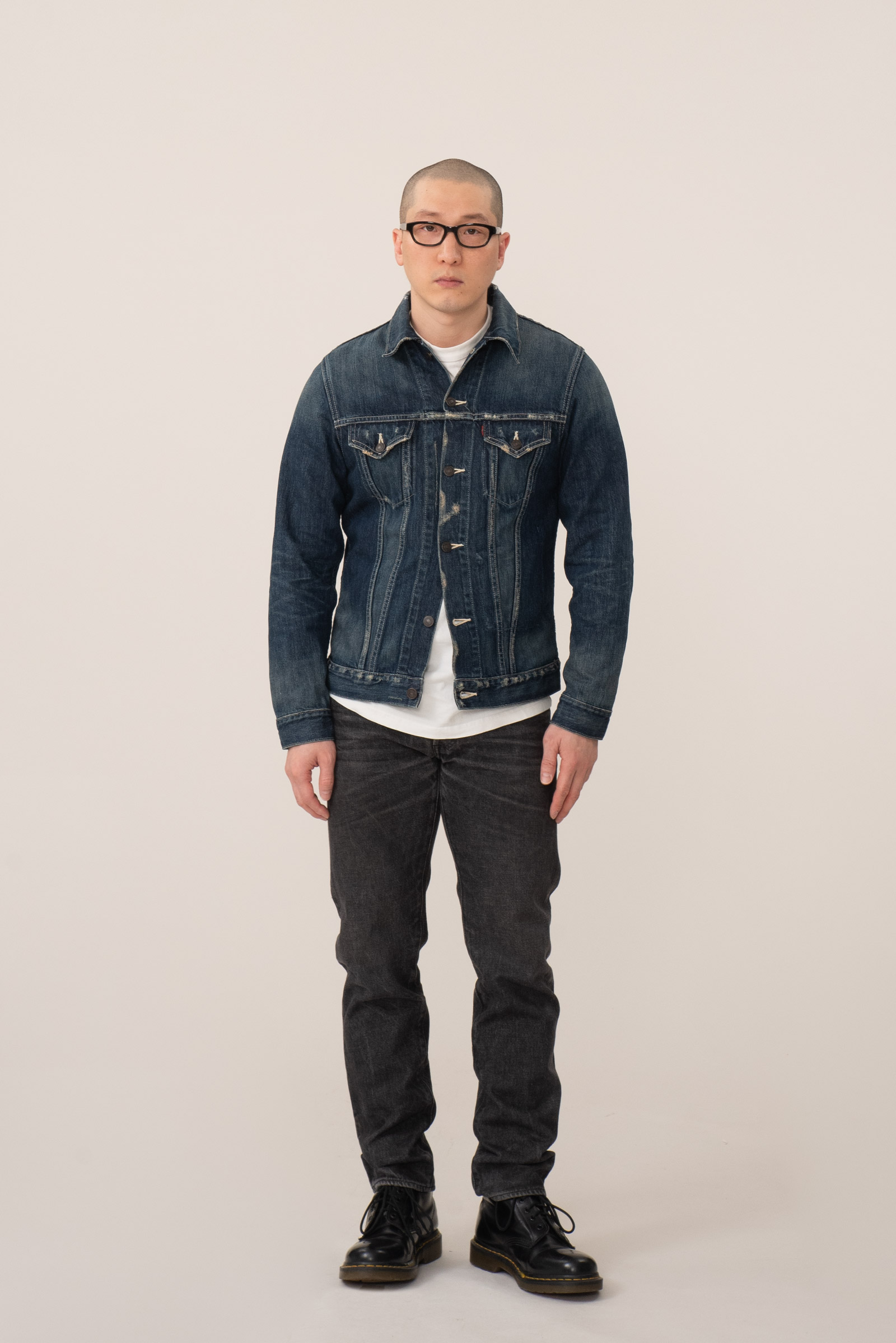 - 스튜디오 다치산의 GL-001 모델입니다. 아이비 테이퍼드 핏으로, 깔끔하게 떨어지는 밑단이 특징입니다. 수축이 되어서 27 인치 정도 된 것 같은데, 아무튼 워싱도 많이 진행되고 그렇습니다.