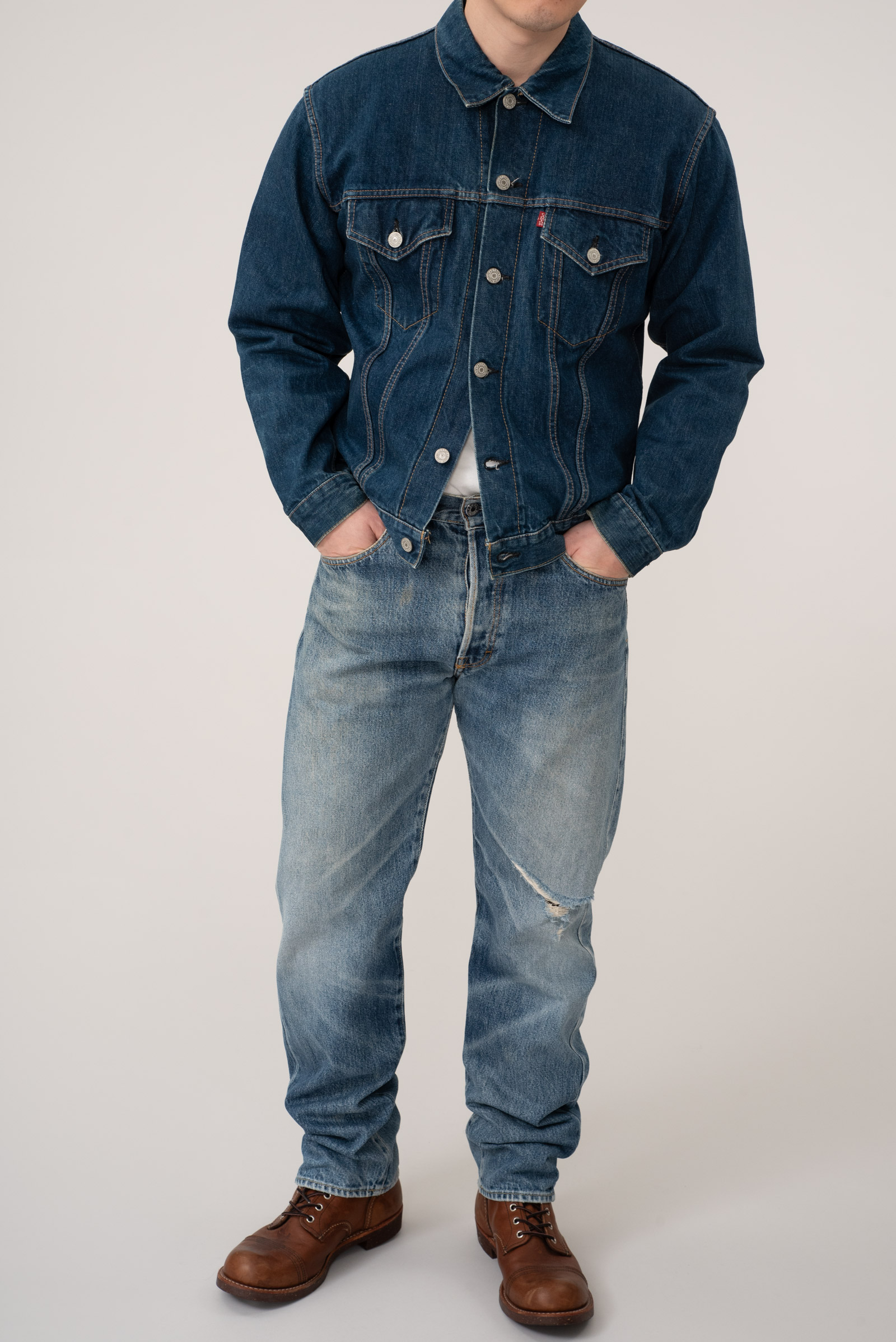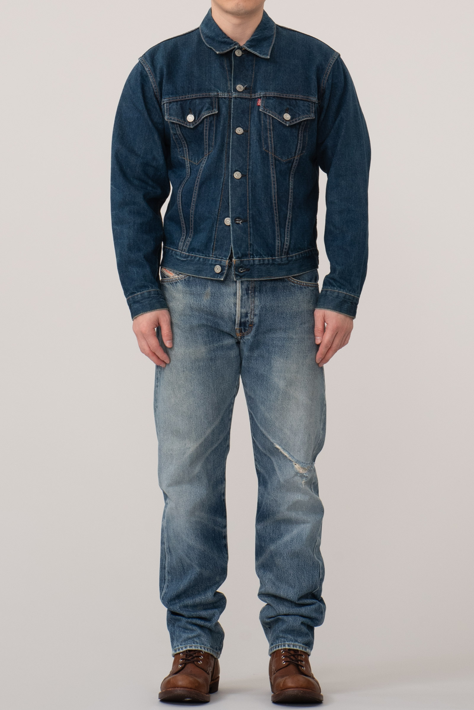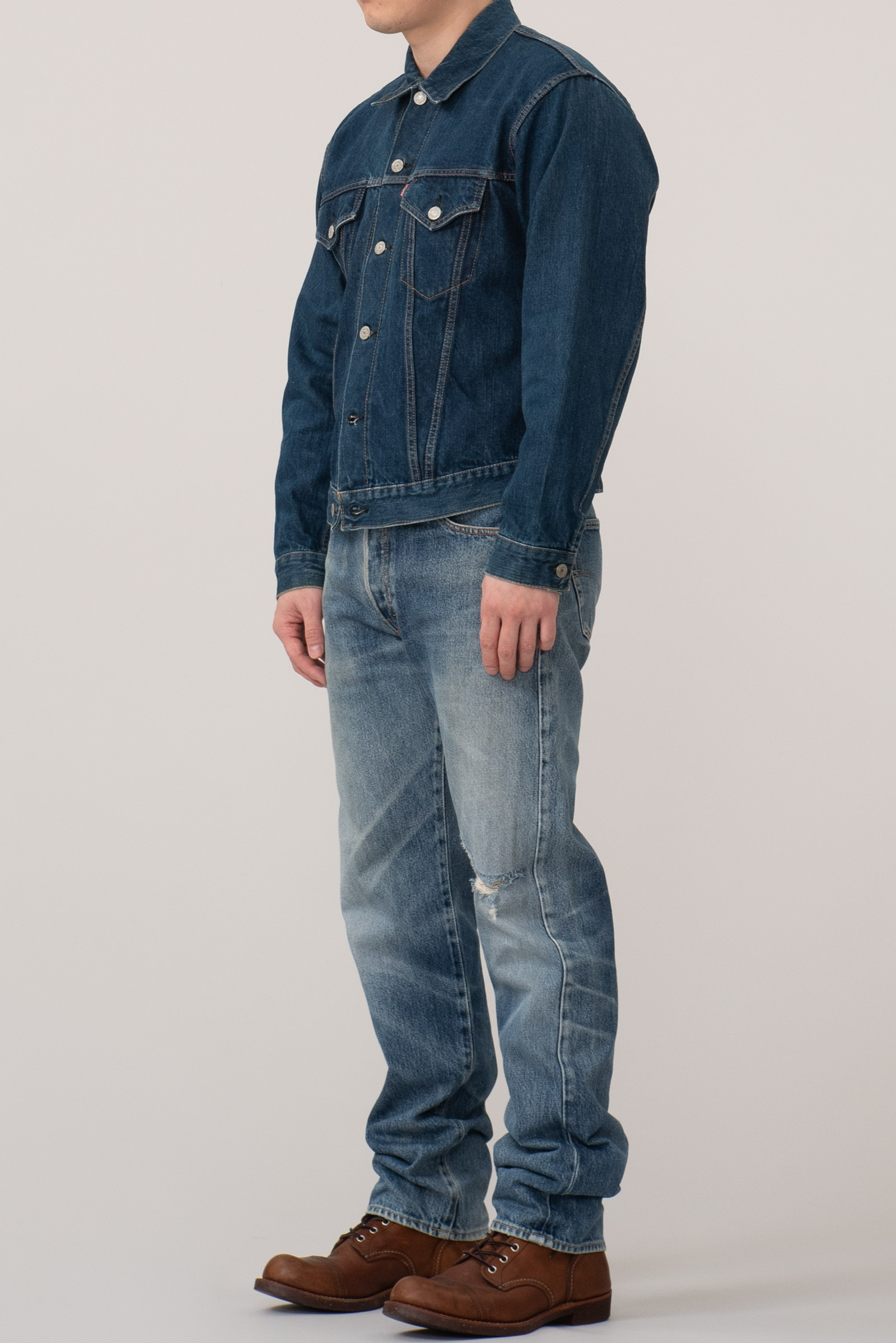 - 일본의 데님 역사의 시작이라 할 수 있는 캔톤의 90 년대에 제작 된 셀비지 3rd type 트러커입니다. 현행 글로벌 LVC에서는 찾아 볼 수 없는 단단하고 부드러운 풍미와 박력있는 어깨와 가슴 쉐입이 일품인 제품이지요. 분위기도 좋지만, 서구의 완력을 경외했던 60 년대부터의 긴 역사를 가진 재킷으로, 미국발 세계화의 신자유주의가 전세계로 뻗어나가던 90 년대 일본이 데님의 선진화를 일궈 낸 역설적인 사조의 흐름을 볼 수 있는 재미있는 히스토리를 담고 있기도 한 제품입니다. 전반적으로 사용감이 있긴 합니다만 즐기기엔 문제없는 수준입니다. 100 입는 분이라면 잘 맞겠어요.