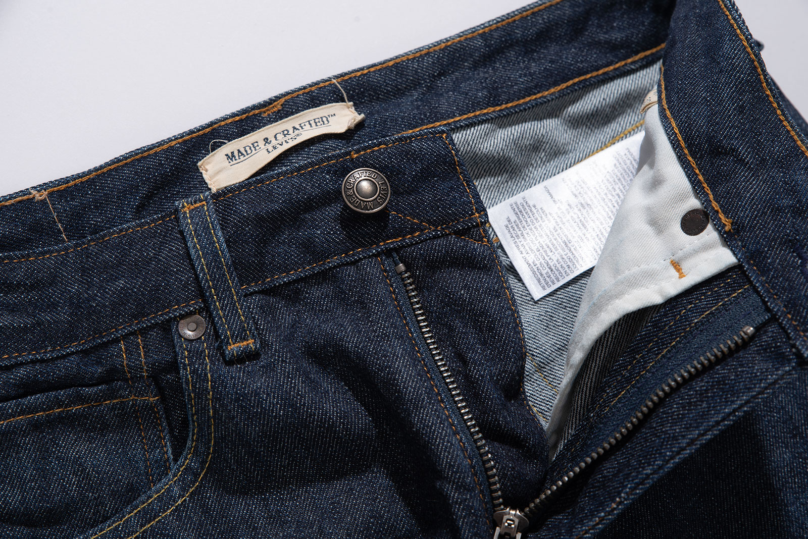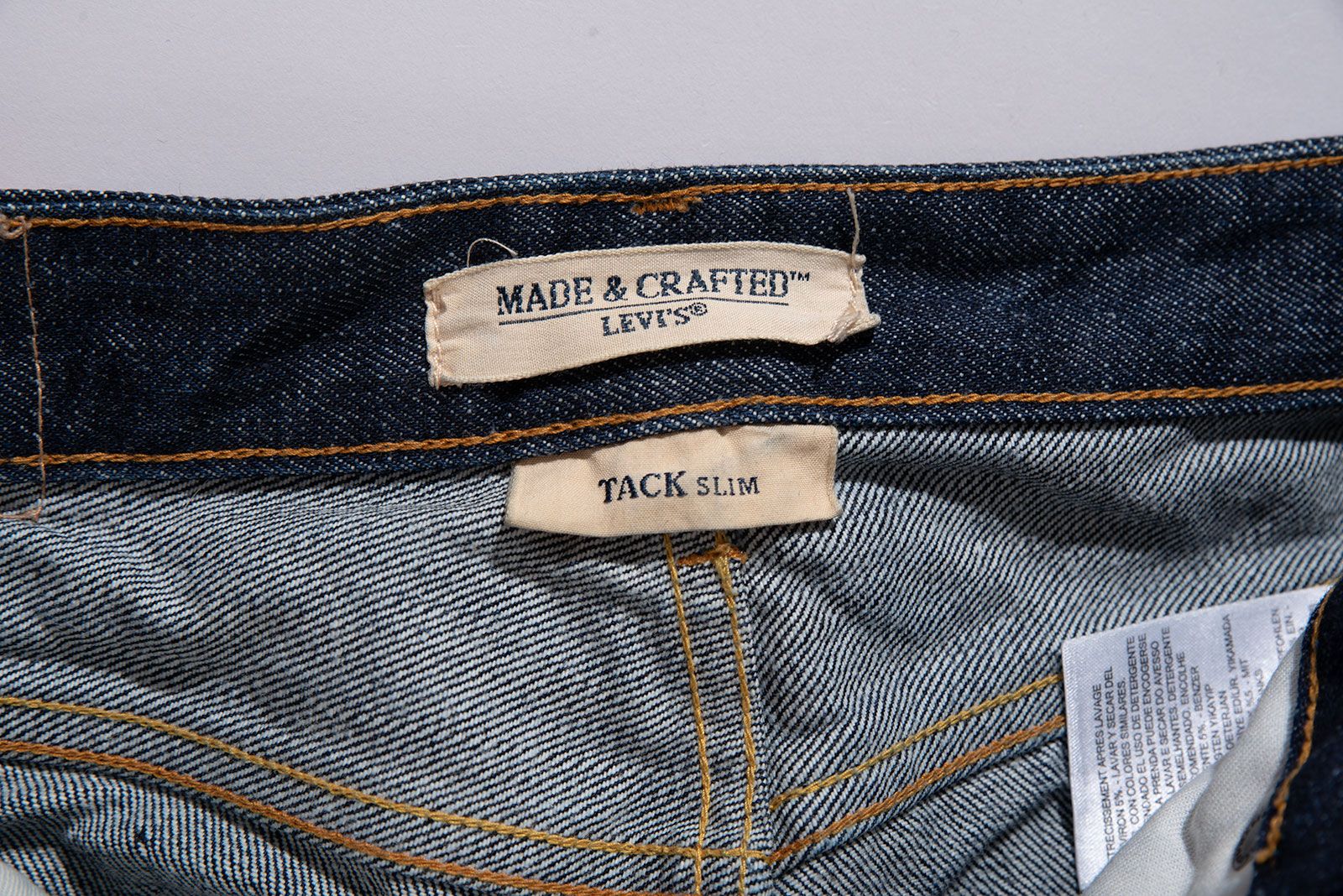 - 리바이스 LMC의 슬림핏 모델인 TACK Slim 입니다. 진청 상태를 잘 유지하고 있으나 밑단 살려 기장이 수선되었습니다. 셀비지를 표방하는 질감의 원단을 사용하여 신축성없이 딱딱하고 뻣뻣합니다. 표기 30인치이나 실측 상 27-슬림 28 정도의 사이즈 감이네요.
