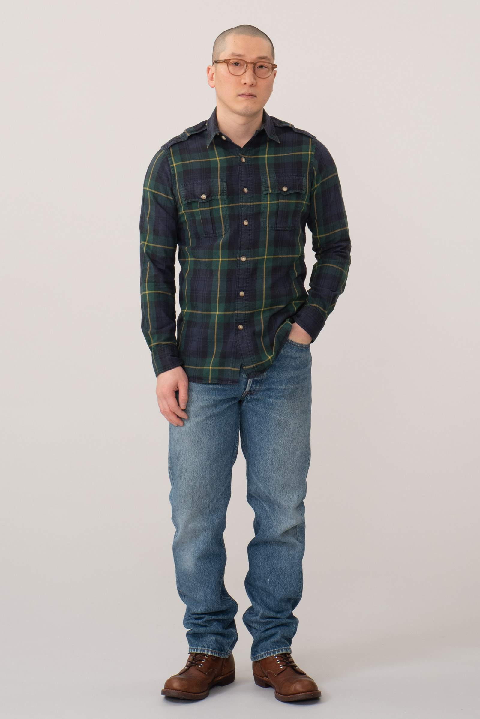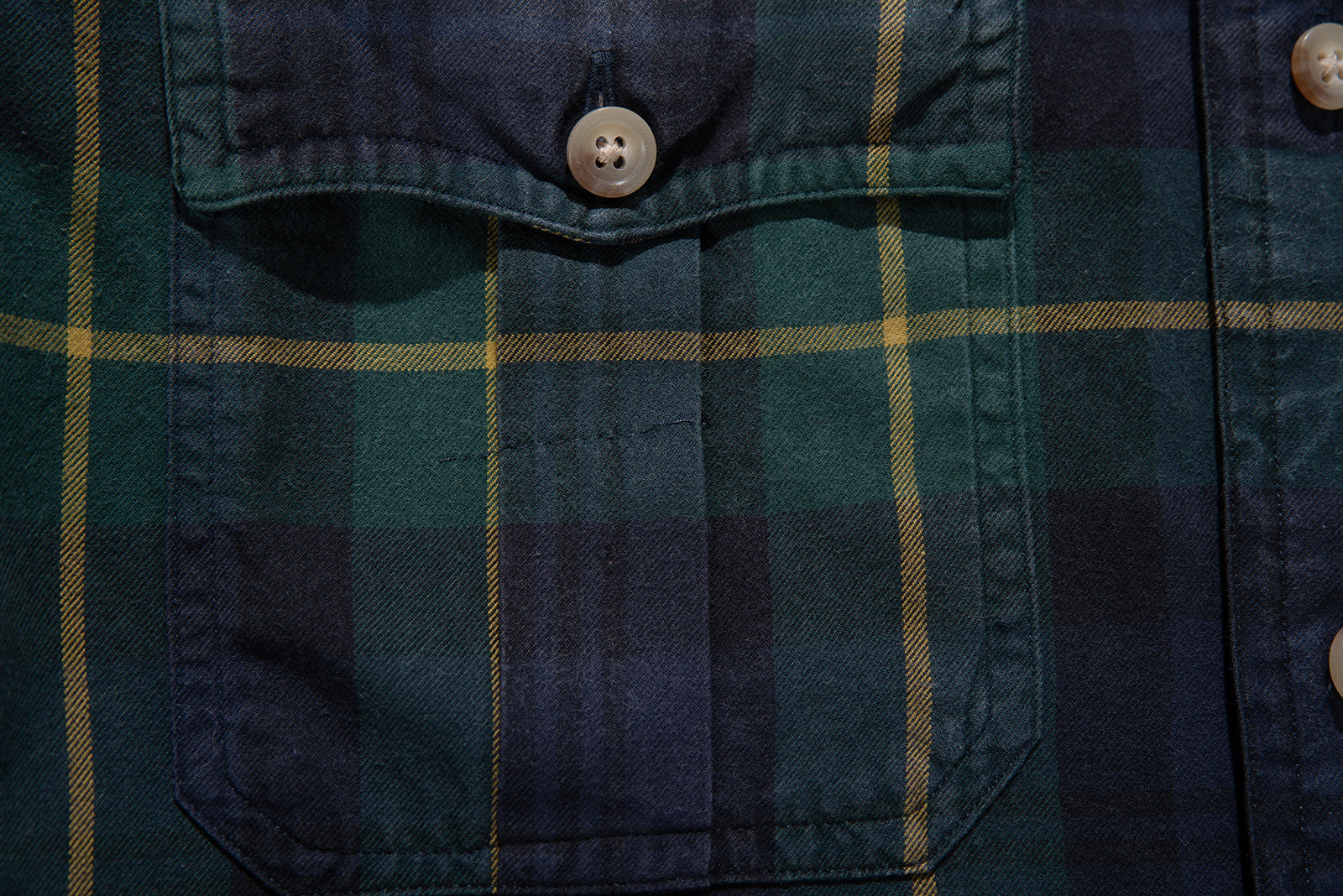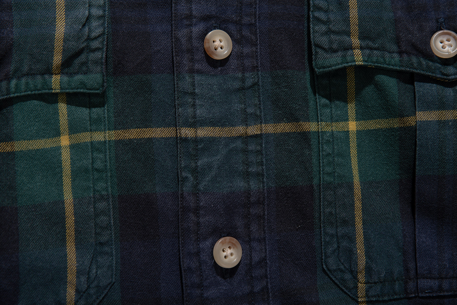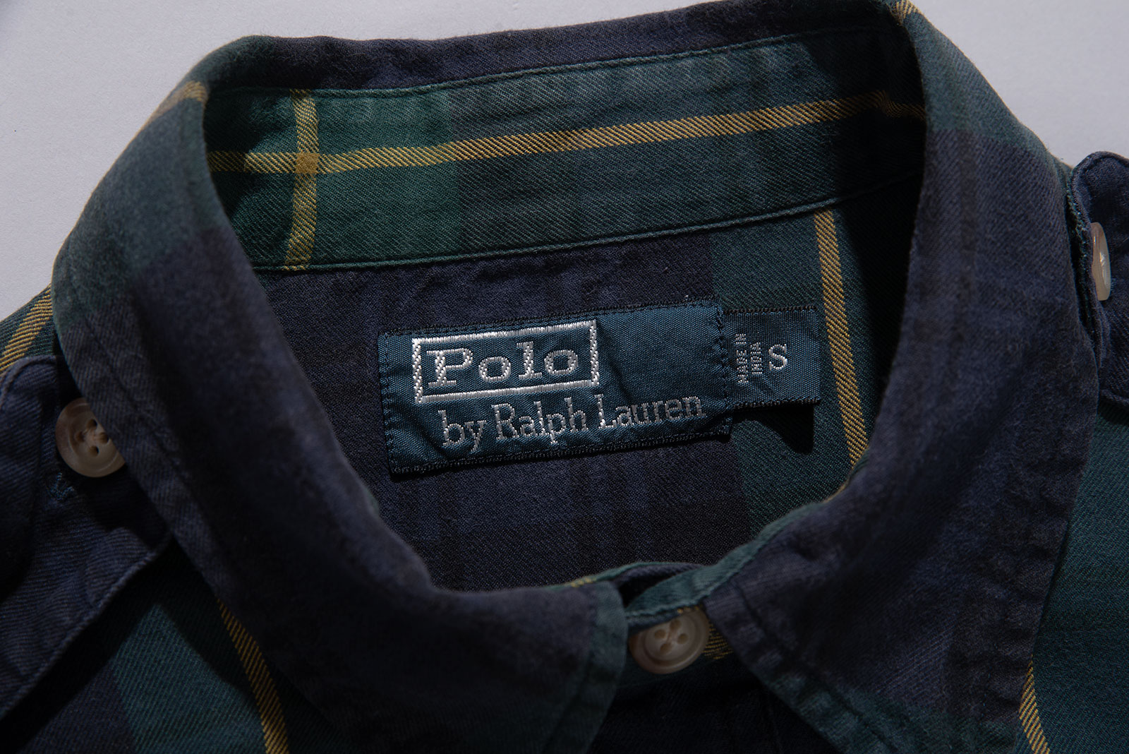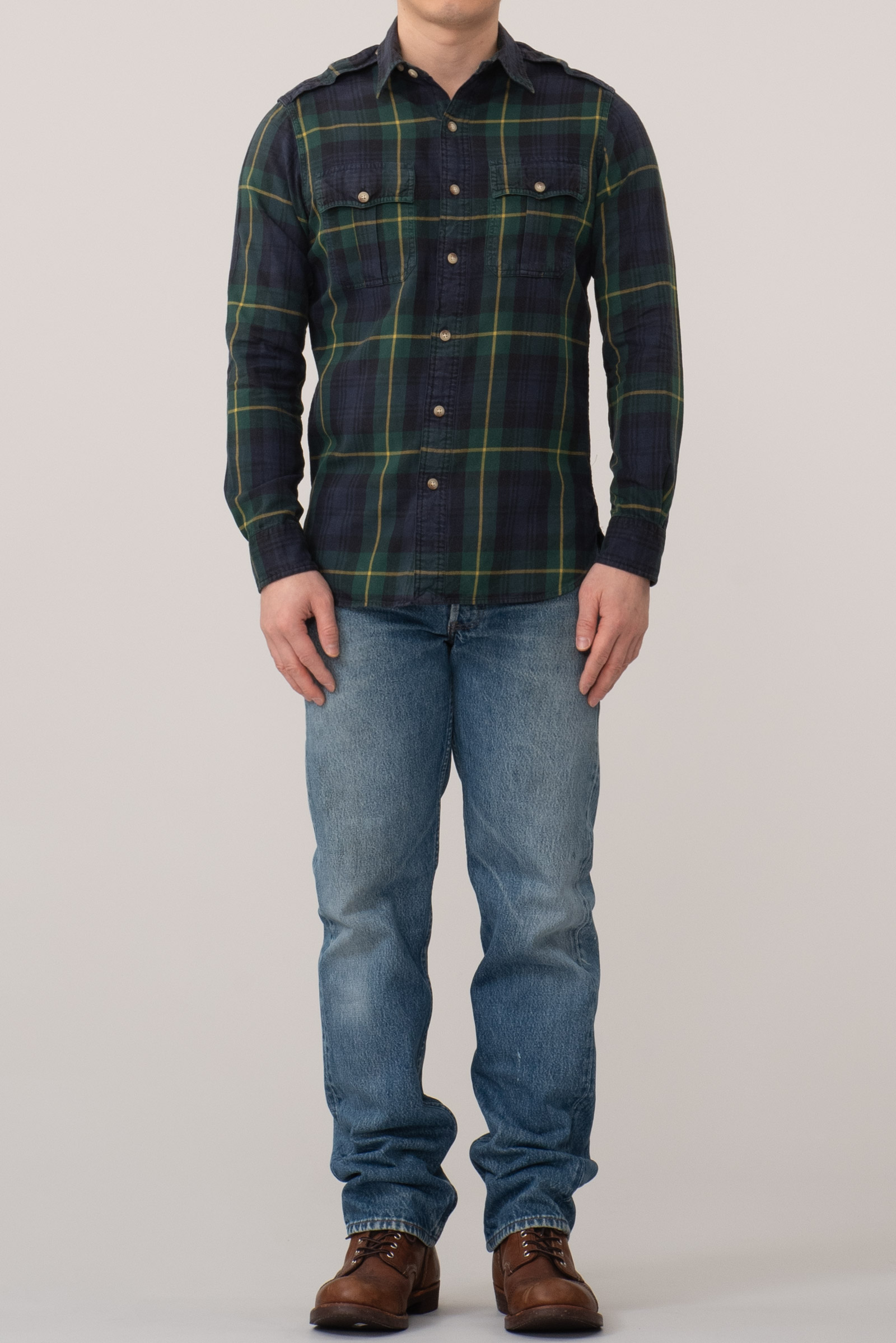 - 폴로 랄프로렌의 블랙 와치 오피서 셔츠입니다. 올드 모델로, 도톰하고 질 좋은 원단 두께감이 특징입니다. 전반적으로 물빠짐이 있고 사용감이 충분히 있어요. 95 정도의 사이즈 감이네요.