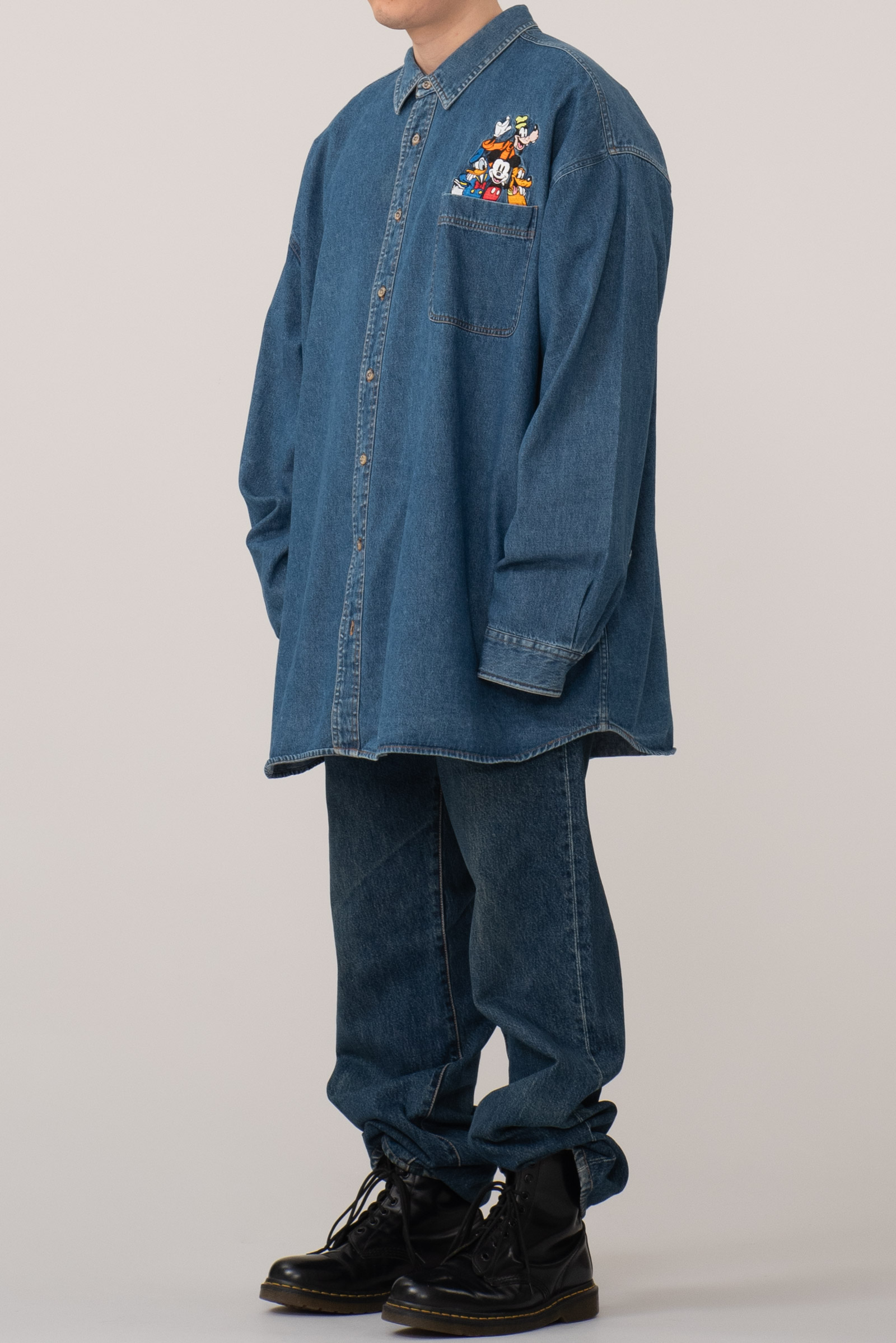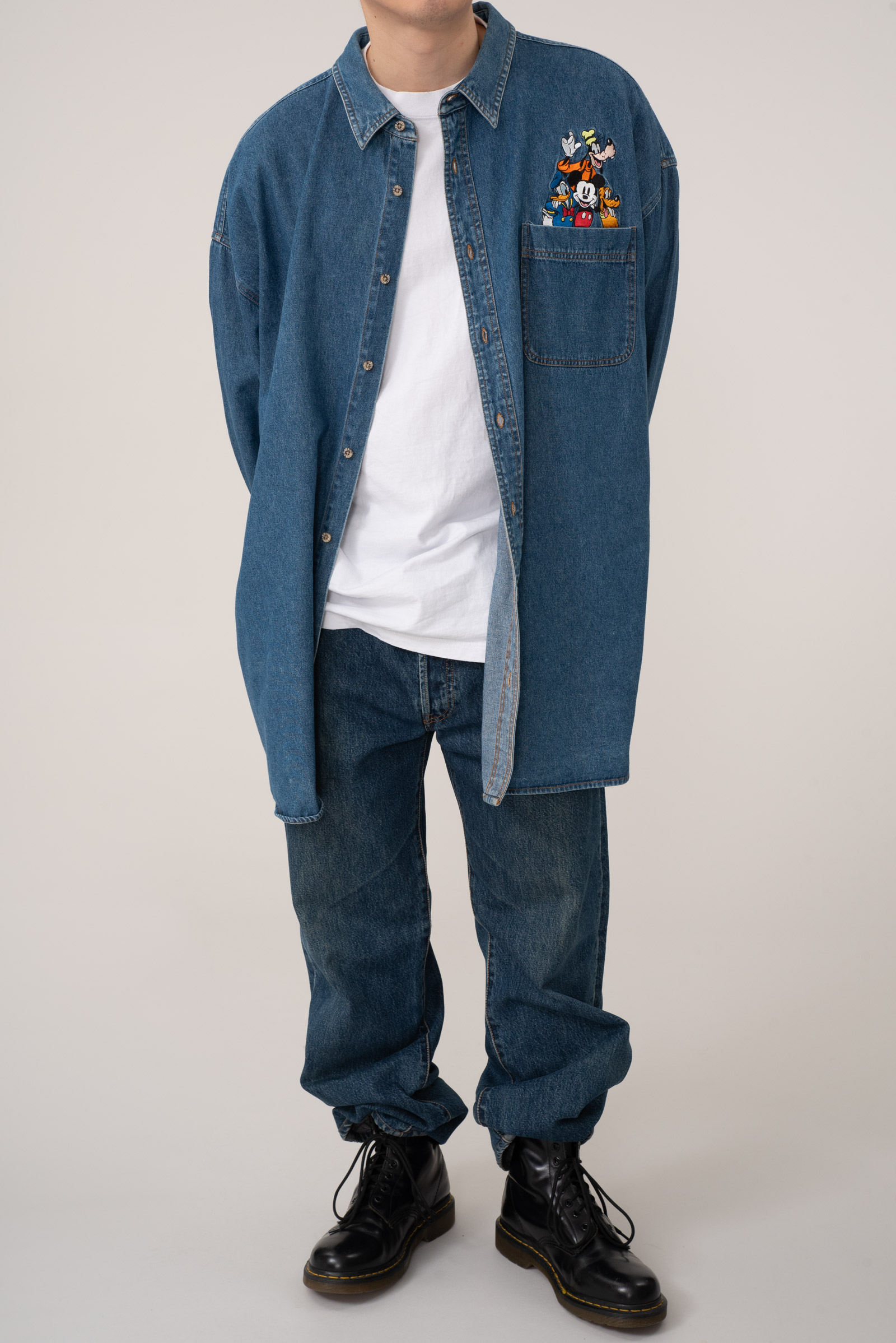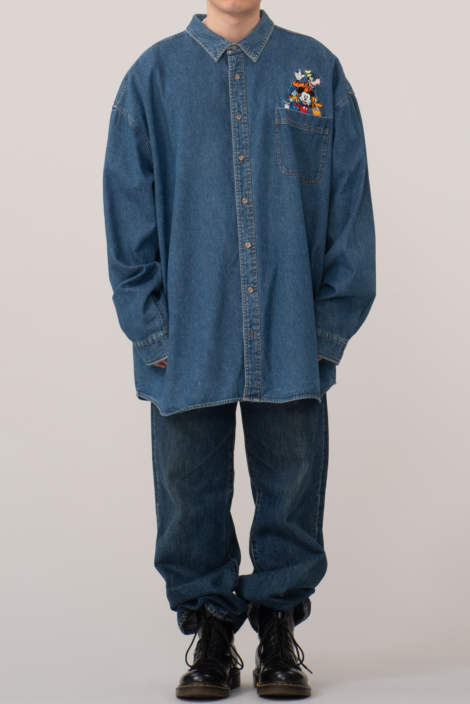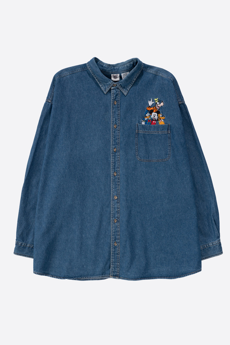 - 2000 년대 초반 쯤 제작 된 디즈니 스토어 미키마우스 데님 셔츠입니다. 표기 4X 로, 국내 120-130 정도의 사이즈 감입니다. 여유있는 사이즈라, 아우터 개념으로 오버핏 스타일링해도 괜찮겠어요. 정 사이즈로 입으실 분은 실측 꼭 비교 후 구매부탁드립니다. 전반적으로 깔끔한 편이에요.