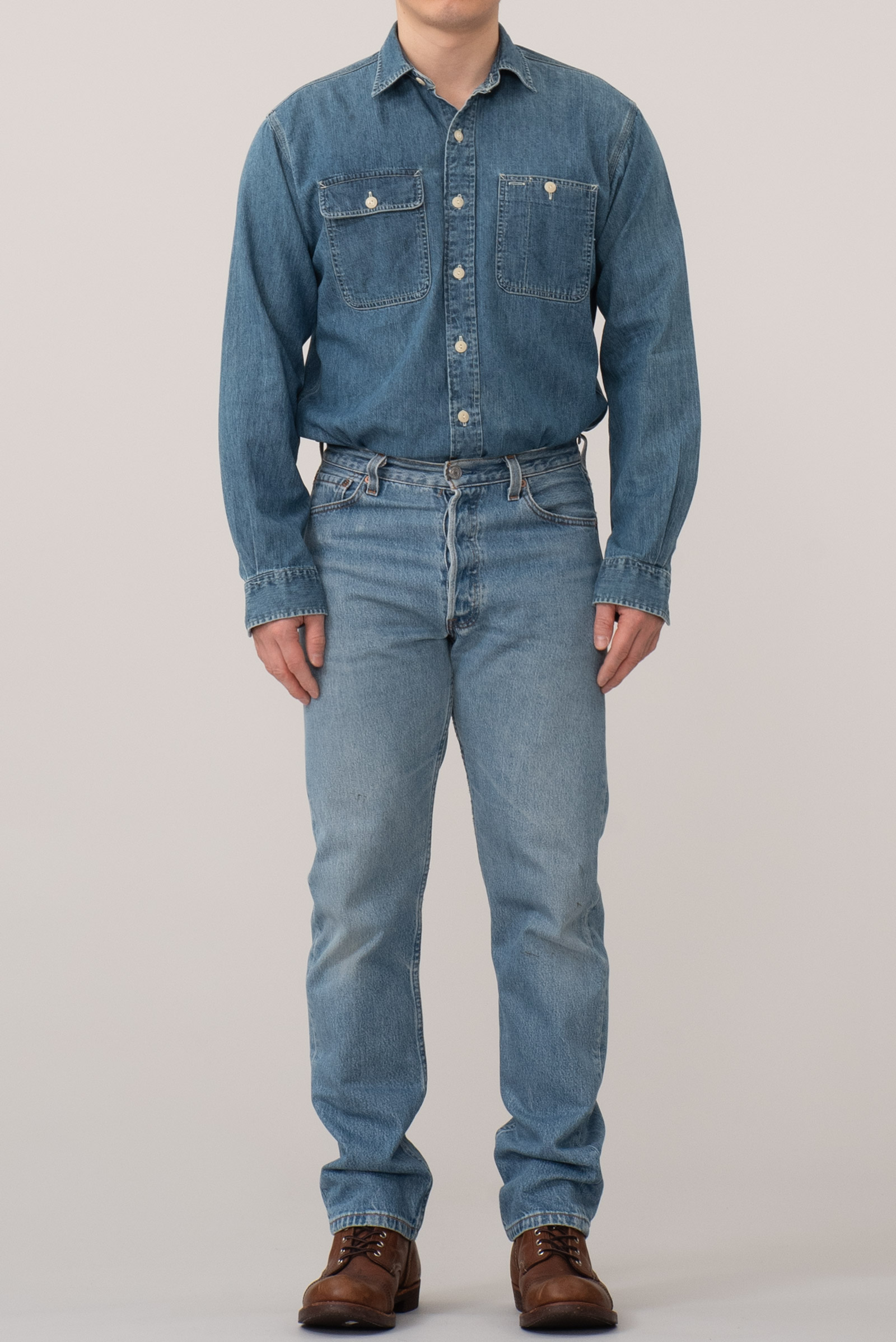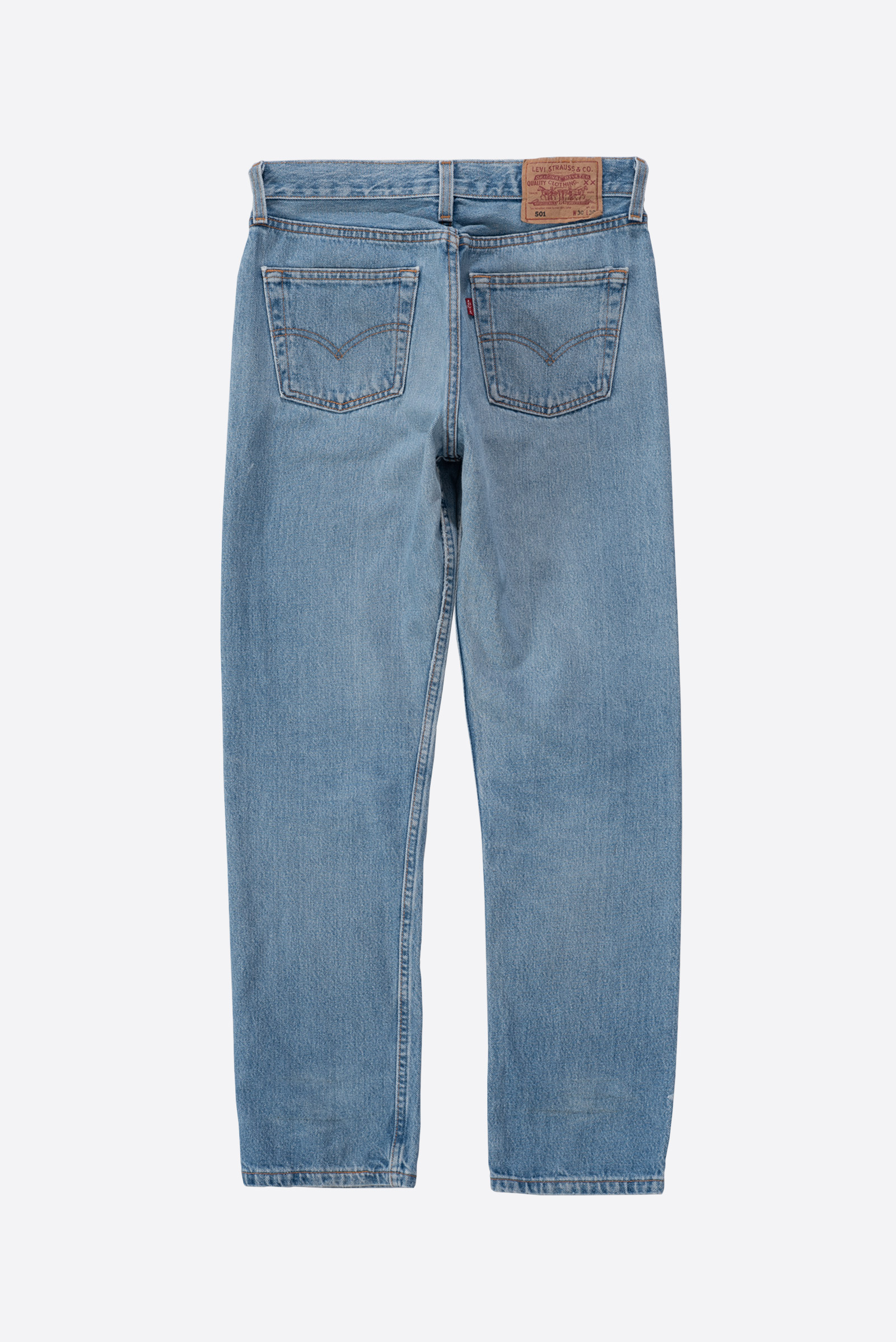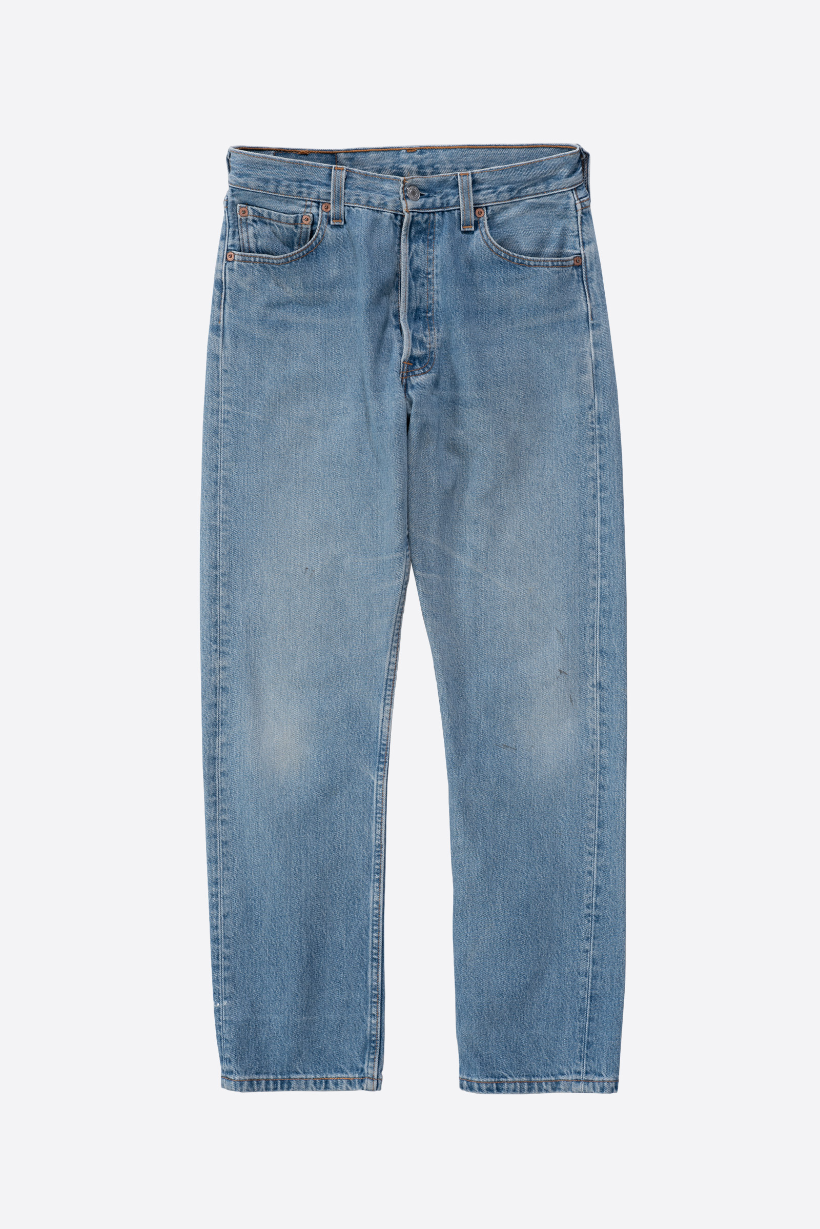 - 90 년대 제작 된 빈티지 501 입니다. 적당한 사용감이 있는 연청 컬러로, 정 사이즈로 멋 부리기 좋은 제품이에요.