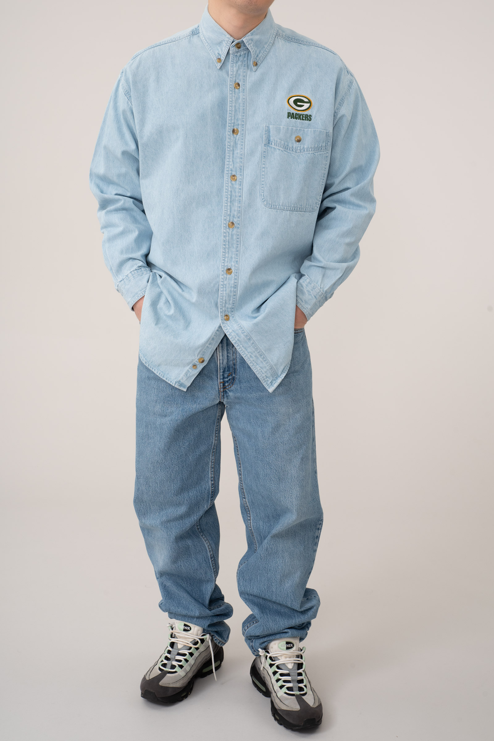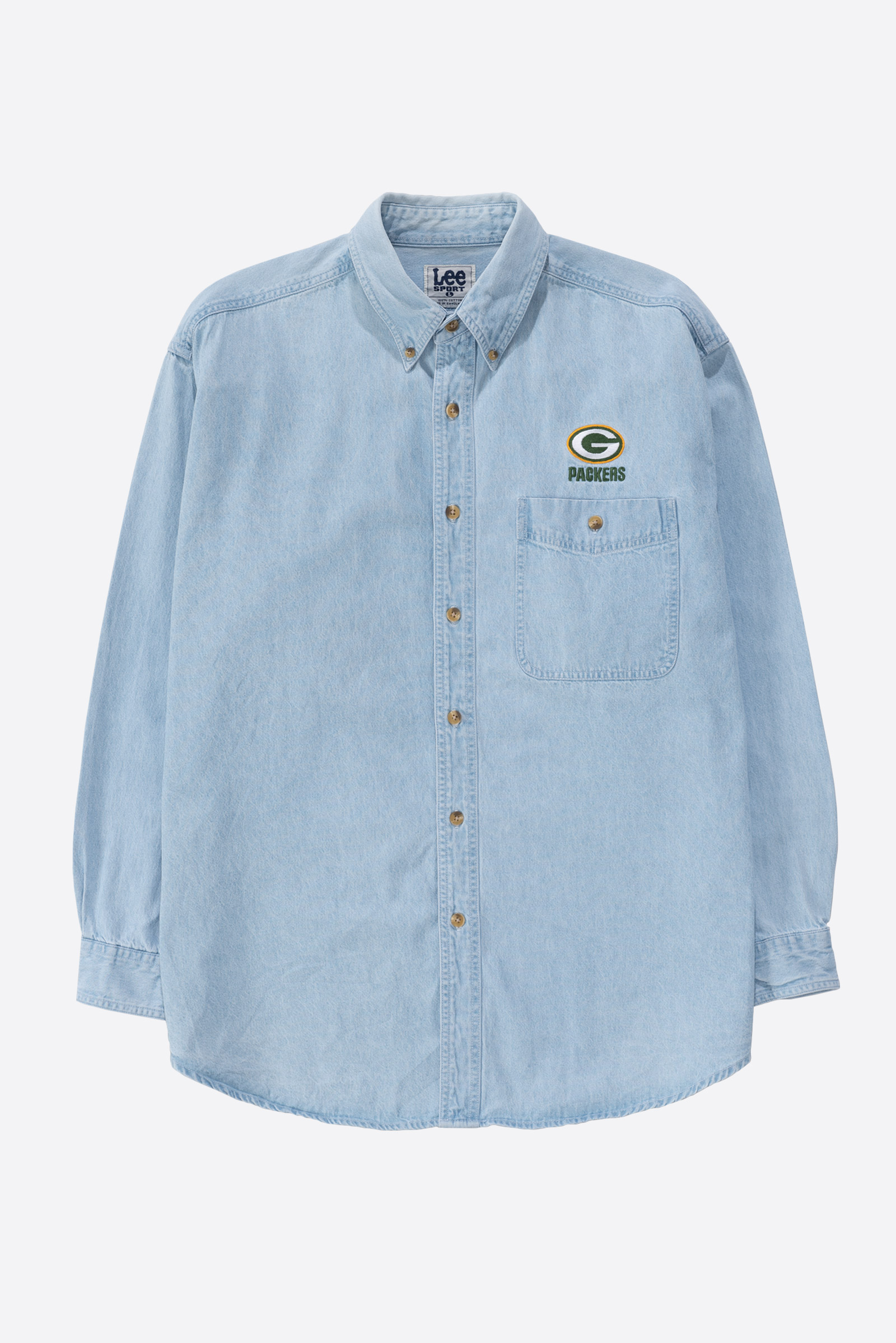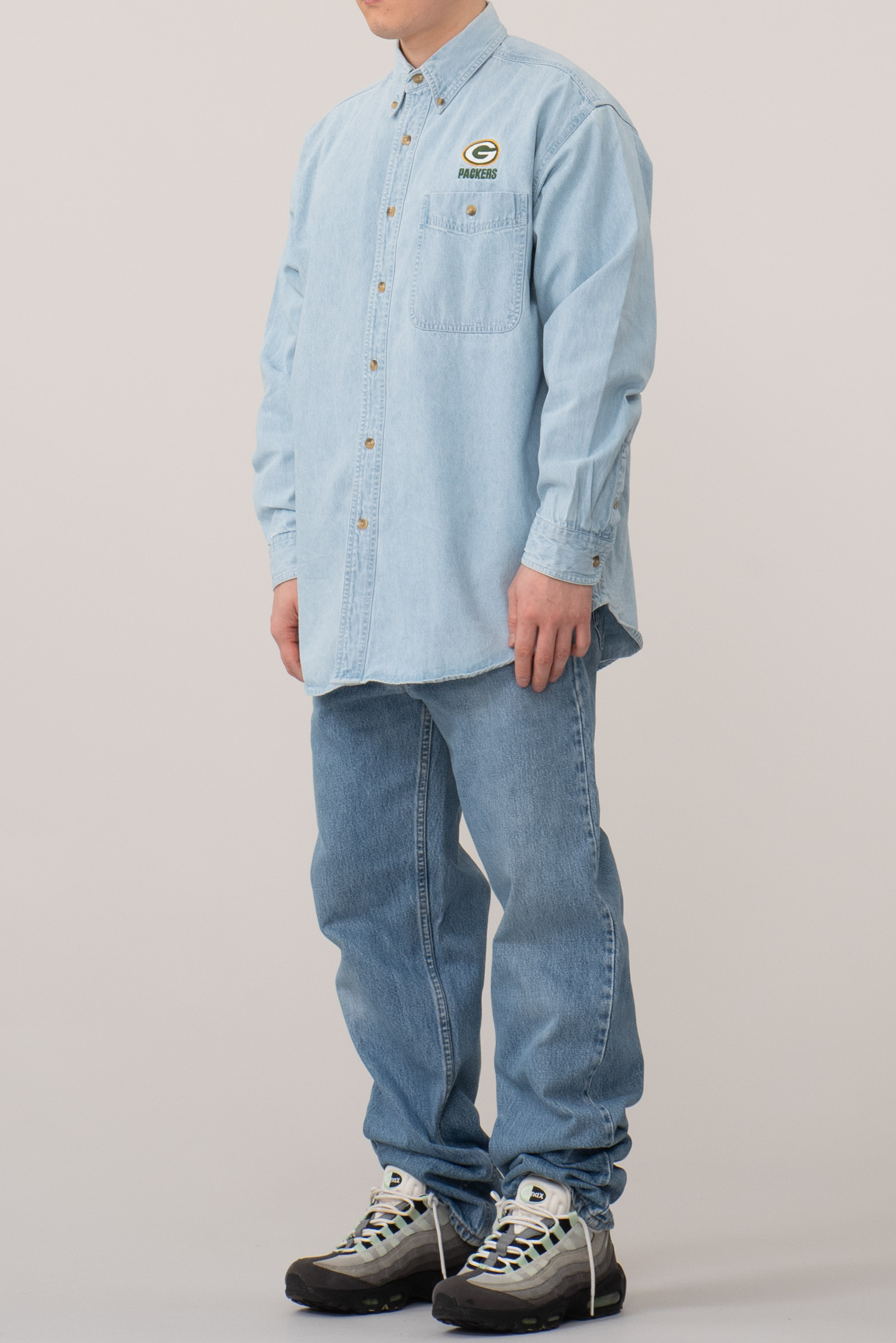 - 90s 리 스포츠의 데님 셔츠입니다. NFL Green Bay Packers 자수 로고가 있는 독특한 조합의 셔츠이죠. 어벙하게 나온 실루엣이라, 몸에 꼭 맞게 입으면 짧퉁해보이는 스타일입니다. 그러니 좀 여유있게 입으시면 좋을 것 같아요. 요런 셔츠는 가볍게 입어도 포인트 주기가 참 좋죠. 활용성이 상당히 높은 제품입니다. 자잘한 오염이 있으나 전반적으로 깔끔한 편입니다.