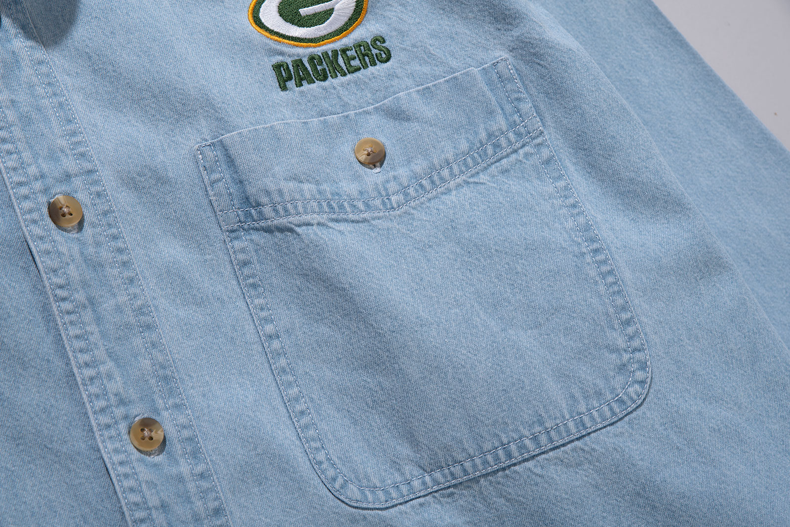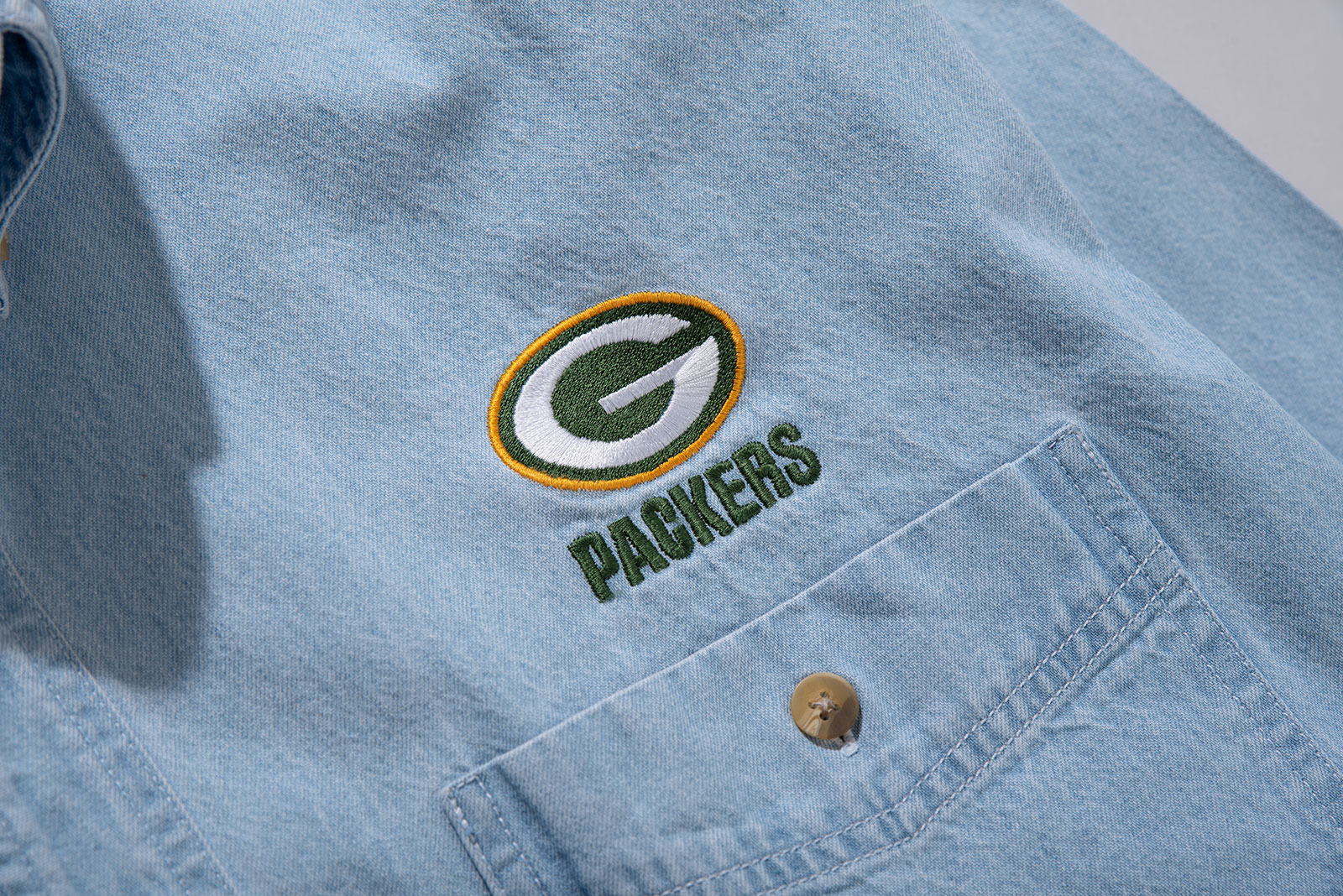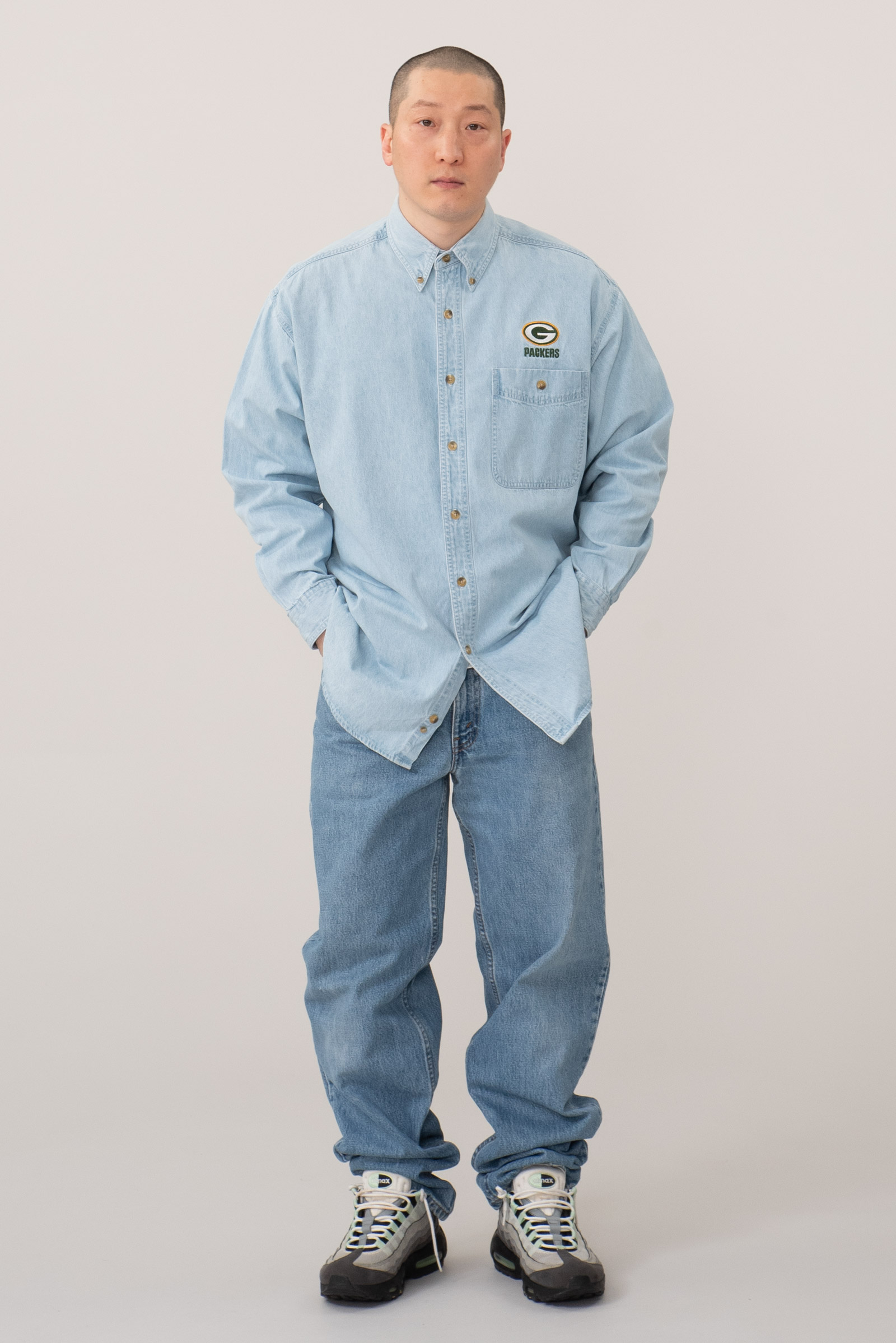 - 90s 리 스포츠의 데님 셔츠입니다. NFL Green Bay Packers 자수 로고가 있는 독특한 조합의 셔츠이죠. 어벙하게 나온 실루엣이라, 몸에 꼭 맞게 입으면 짧퉁해보이는 스타일입니다. 그러니 좀 여유있게 입으시면 좋을 것 같아요. 요런 셔츠는 가볍게 입어도 포인트 주기가 참 좋죠. 활용성이 상당히 높은 제품입니다. 자잘한 오염이 있으나 전반적으로 깔끔한 편입니다.