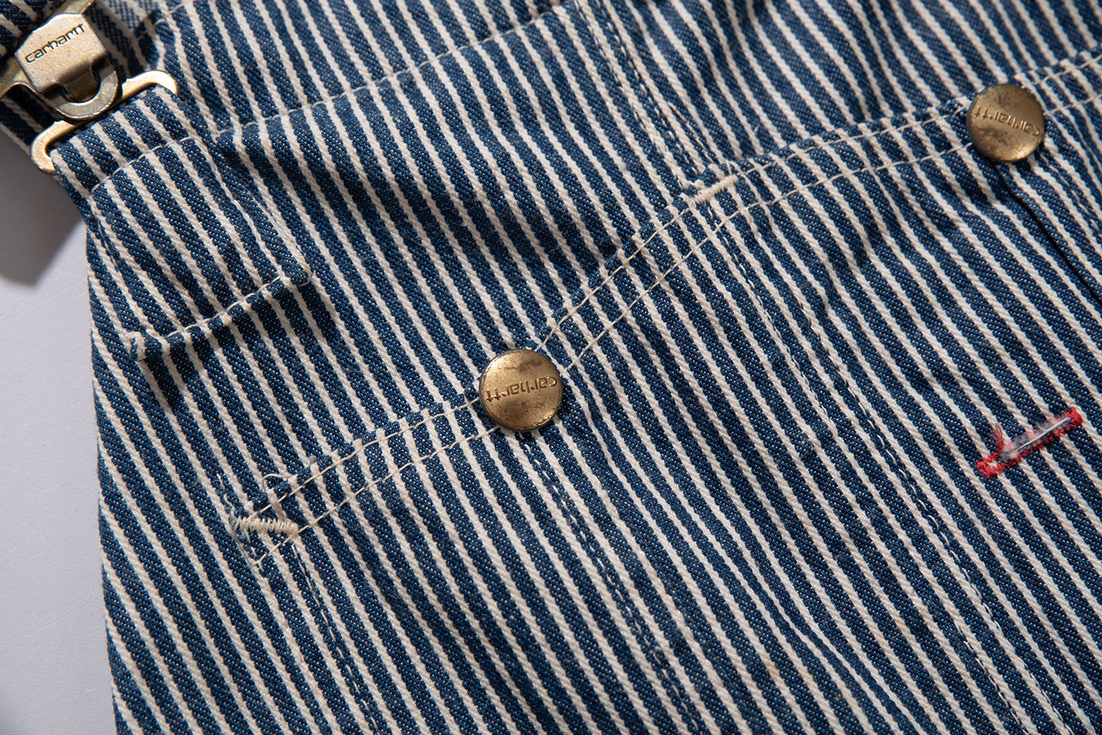 묵직한 황동 버튼, 클래식한 비브 포켓 디테일도 전성기 칼하트의 무드를 그대로 담고 있습니다.