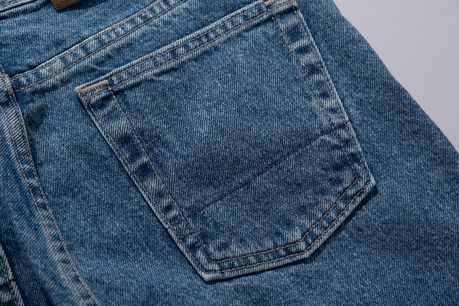 허벅지와 무릎 부분에 자연스러운 페이딩이 있고, 워싱이 균형감 있게 잘 퍼져 있습니다.