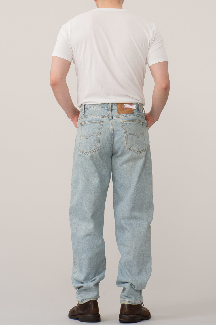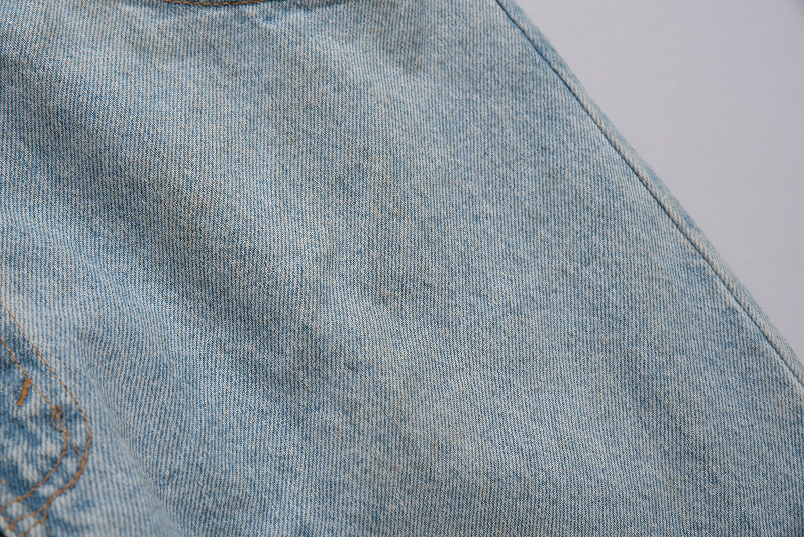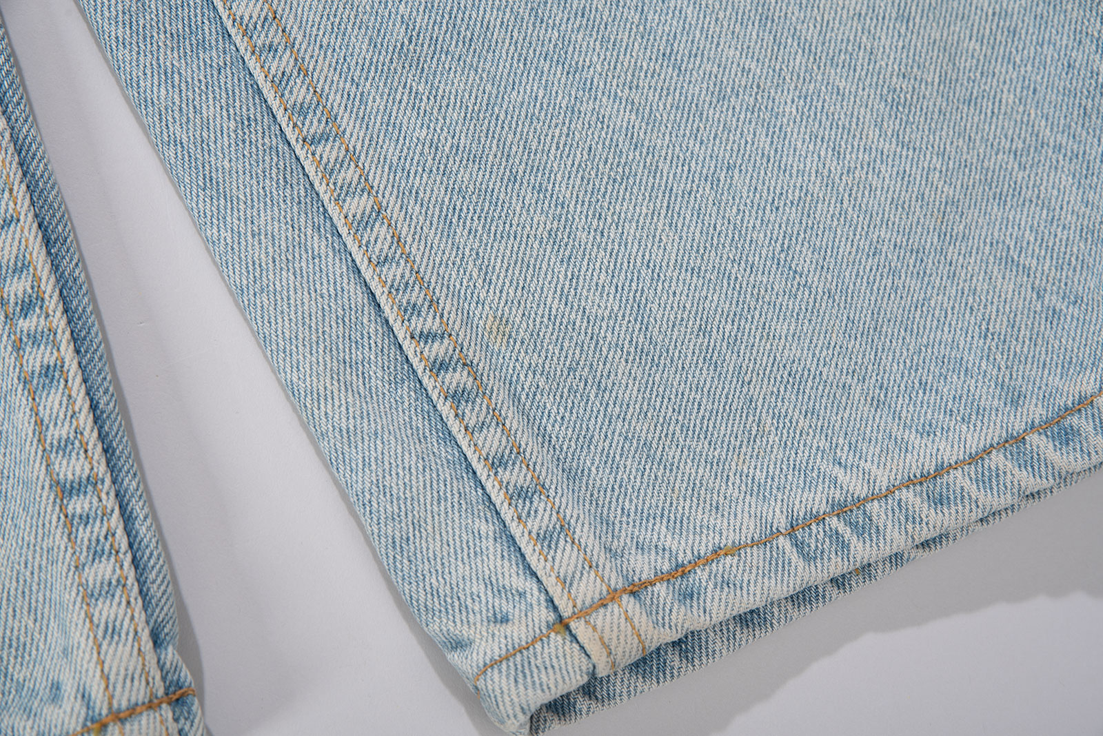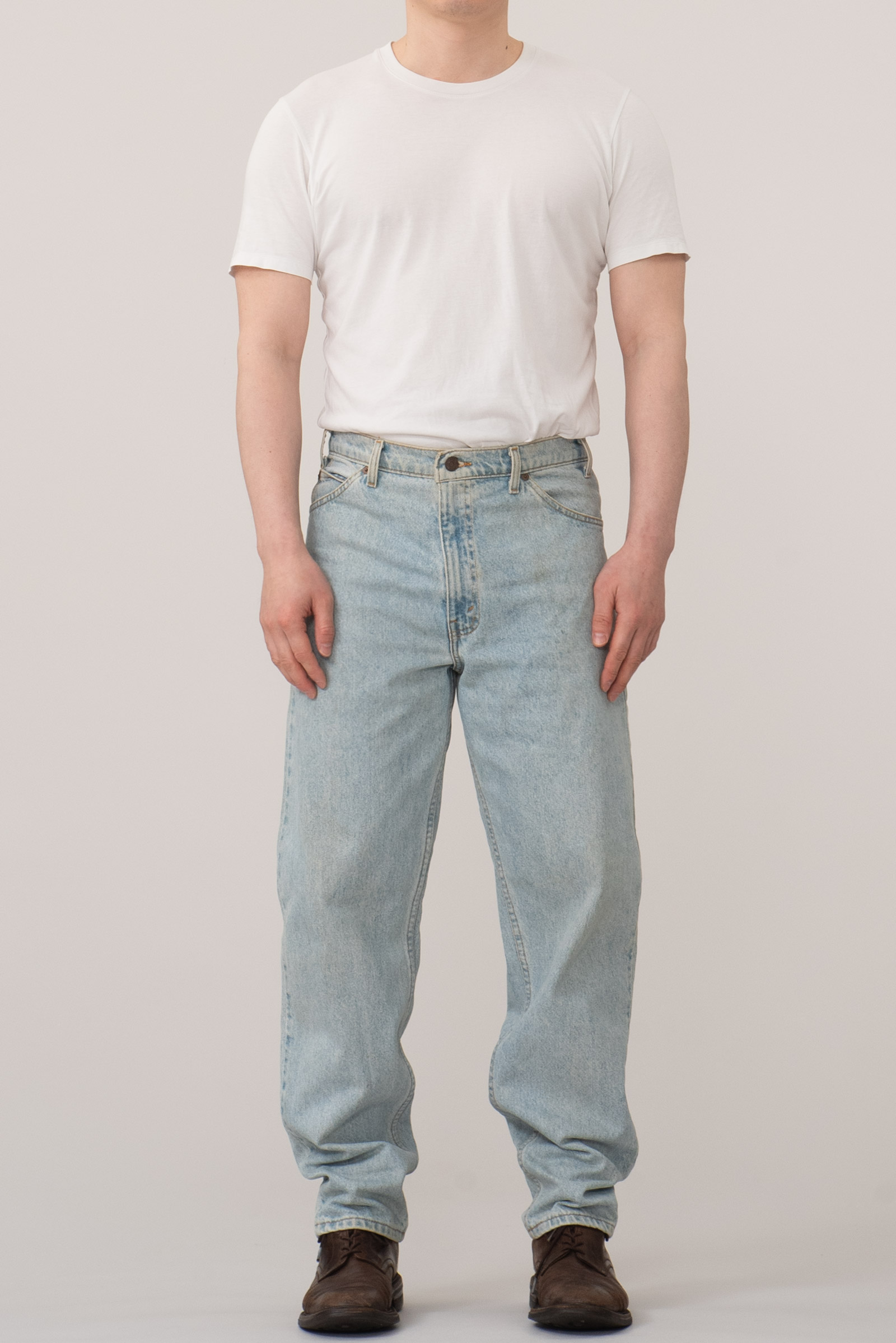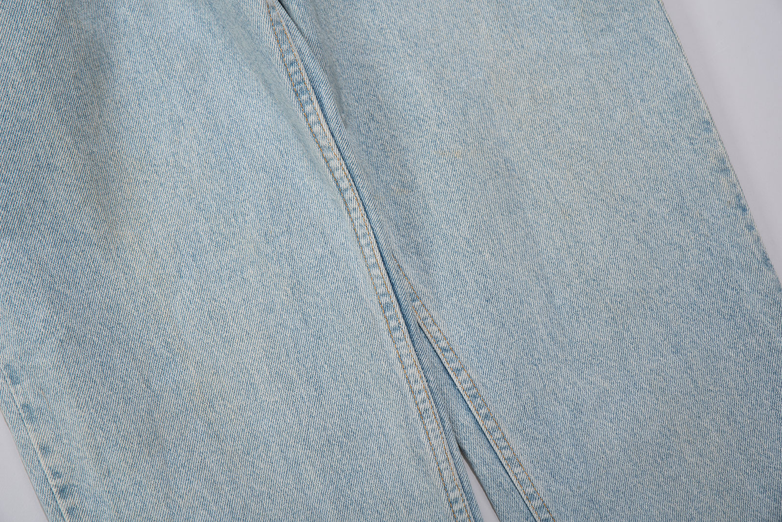 허벅지부터 종아리까지 이어지는 실루엣과 독특한 워싱 톤, 그리고 90s 원단 특유의 거칠고 매트한 촉감이 매력 포인트입니다.