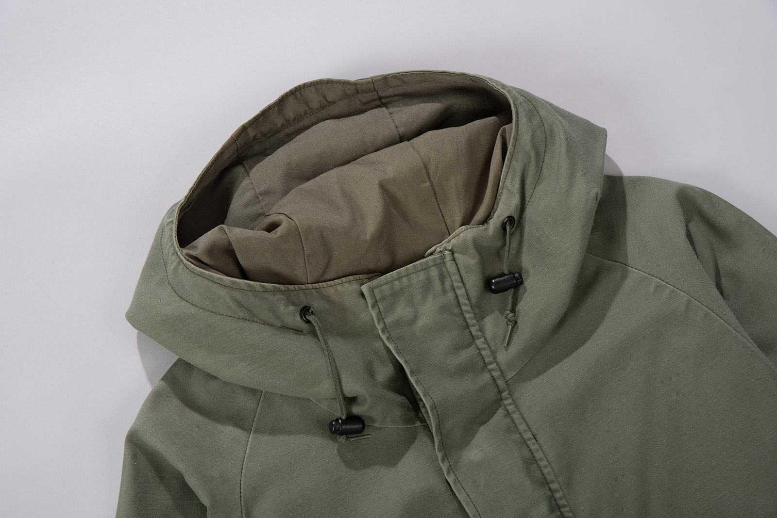 지퍼 플라이에 더블 스톰 플랩 구조, 드로우 코드로 조절 가능한 후드,
