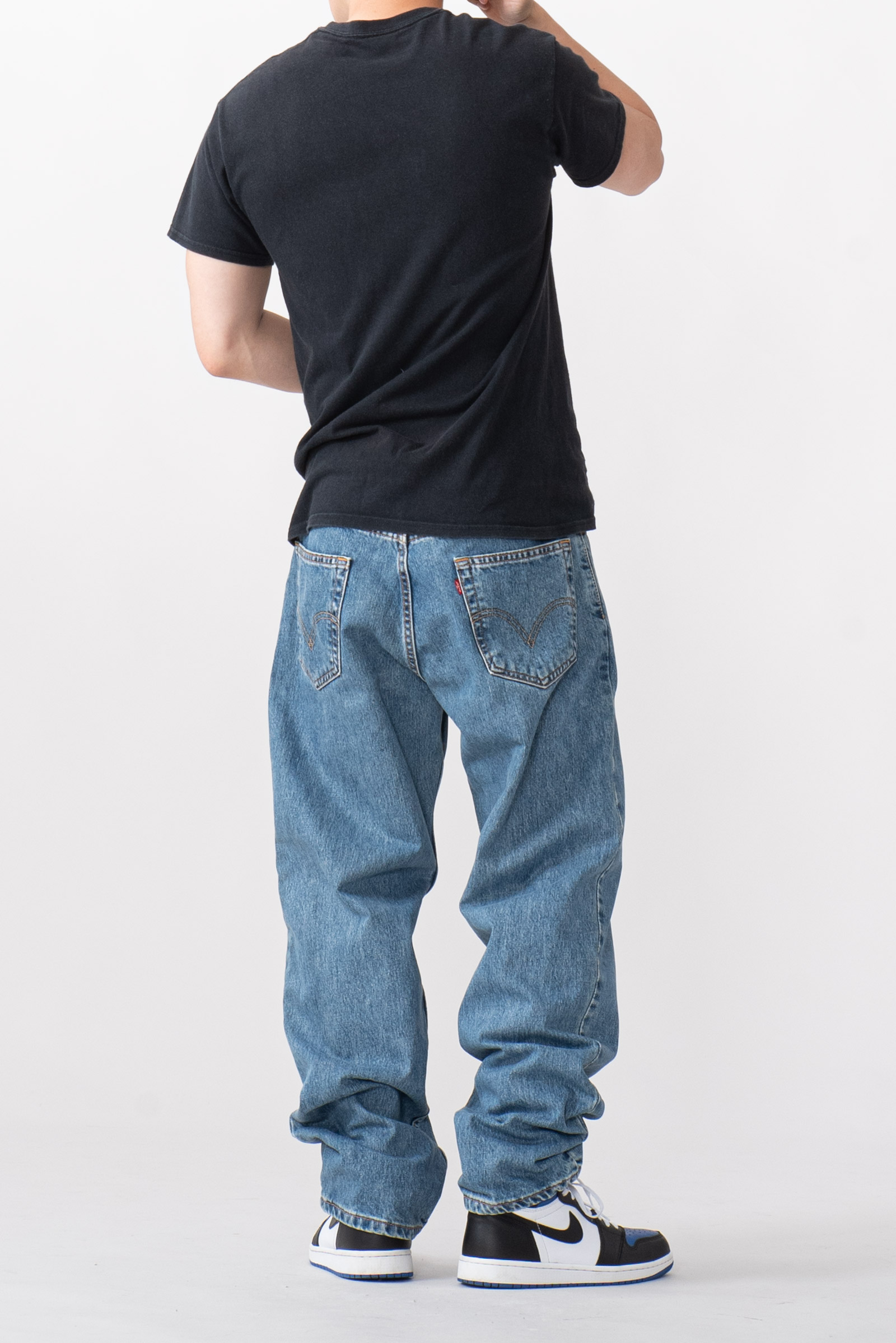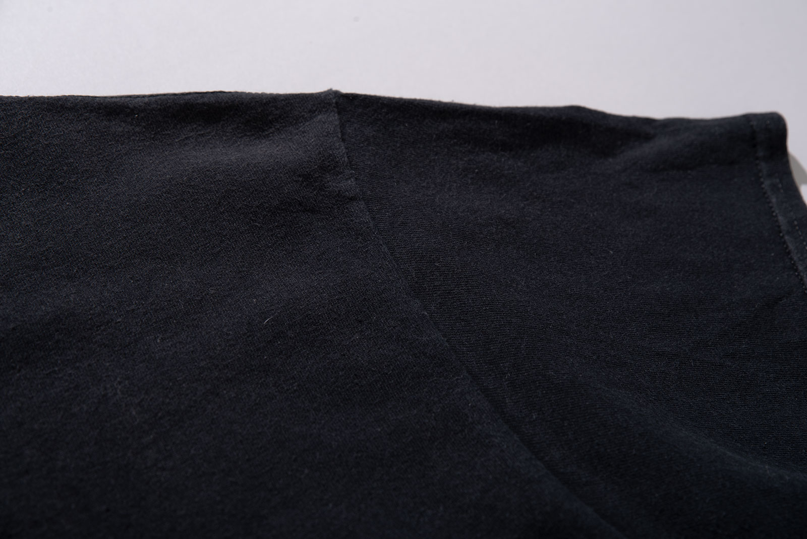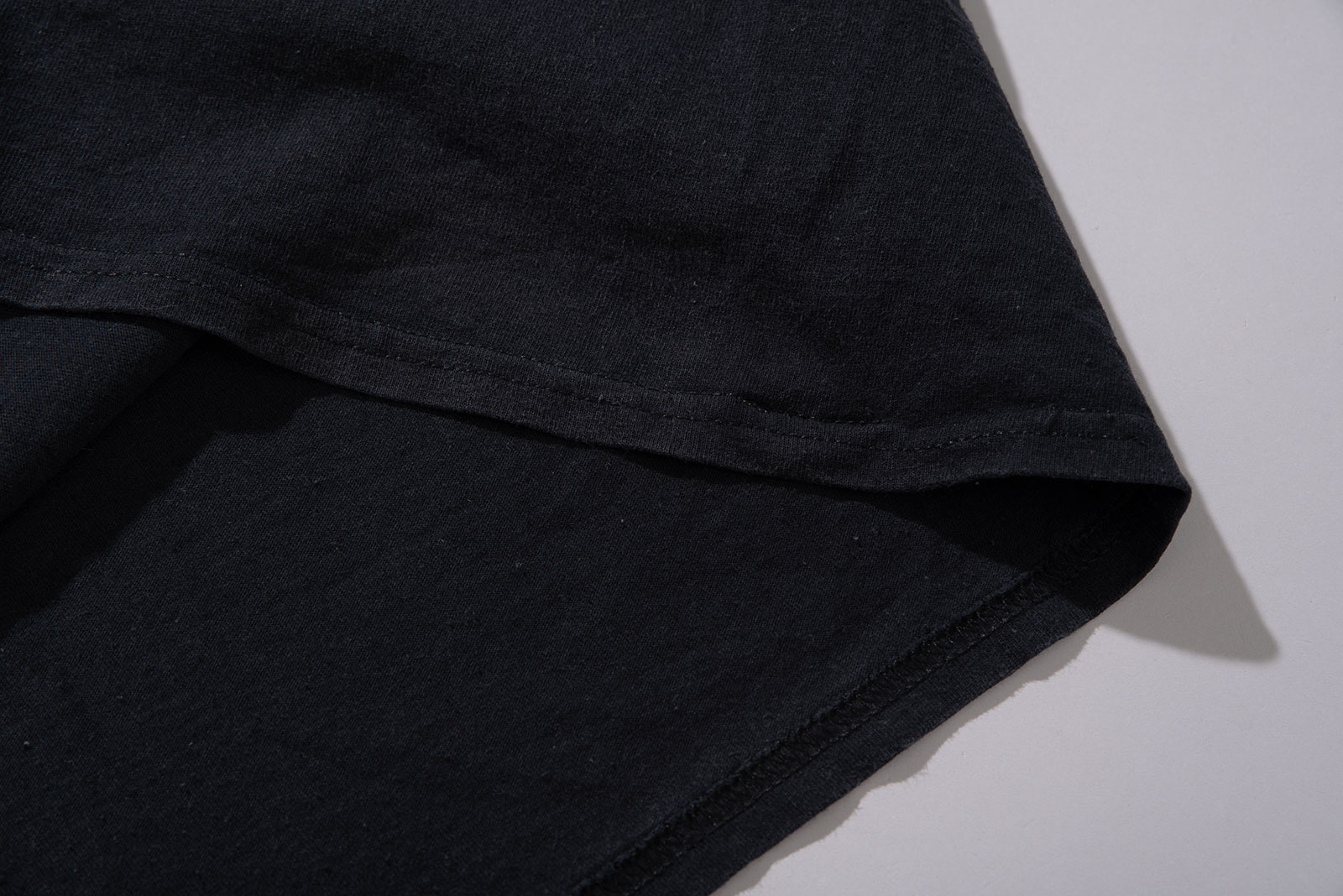 탄탄한 코튼 100% 원단으로 제작되었으며, 목 시보리와 전체적인 봉제 상태도 견고하게 잘 유지되어 있어 오래도록 착용 가능한 제품입니다. 블랙 컬러 바디에 대비되는 블루·화이트 프린트가 인상적이며, 적당히 워싱된 느낌이 있어 자연스러운 낡음과 함께 깊이 있는 분위기를 만들어줍니다.