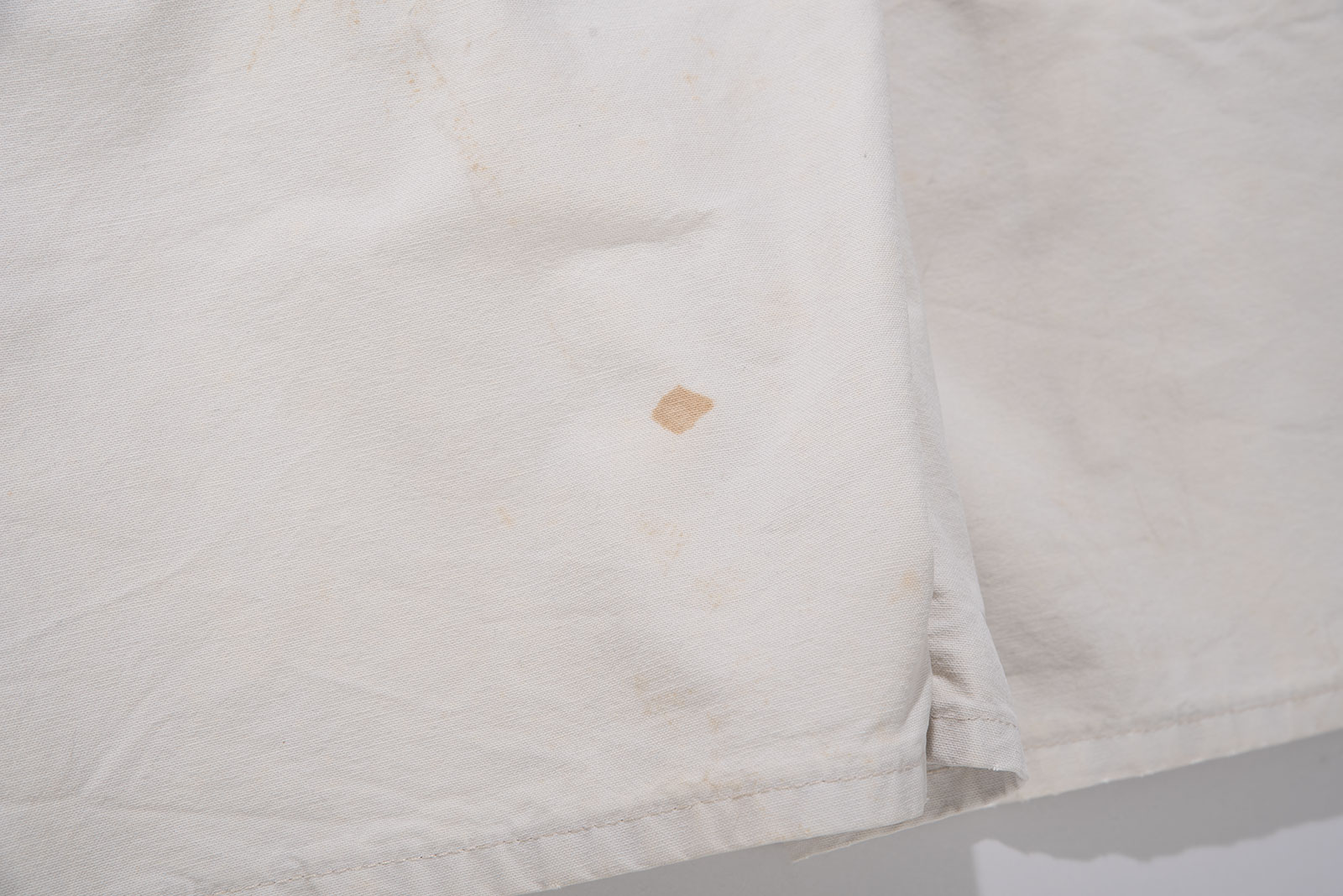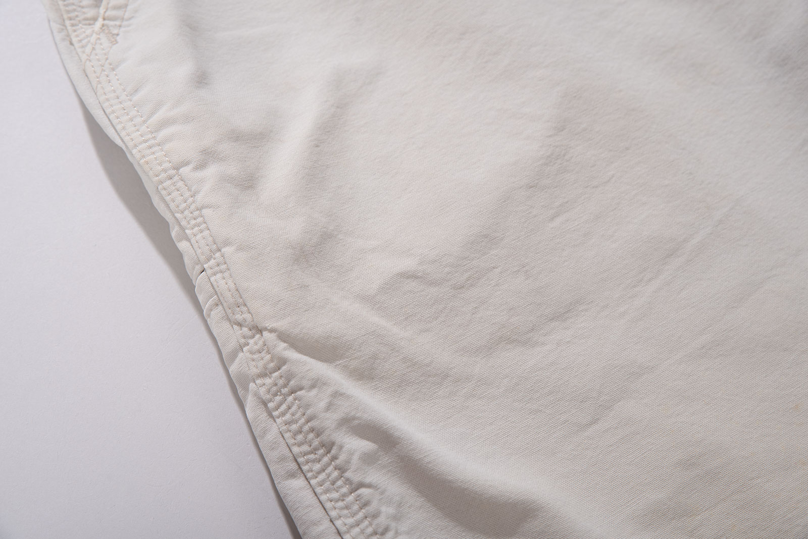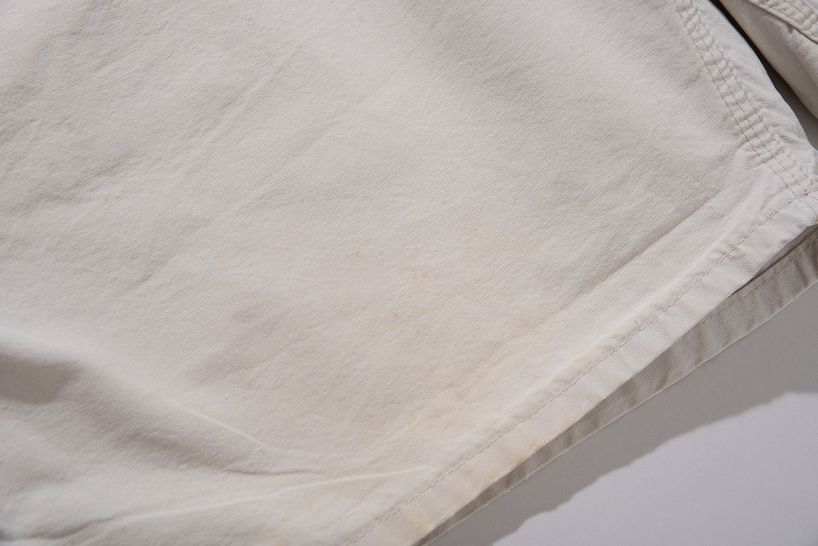 컬러는 순백보다는 약간 바랜 듯한 내추럴한 톤으로, 세탁과 사용에 의해 자연스럽게 물빠짐이 생긴 빈티지 특유의 분위기를 가지고 있습니다. 전반적으로 착용감이 느껴지며 곳곳에 생활 오염이 자리를 잡았습니다. 이러한 사용감은 제품의 빈티지한 무드를 더욱 강화해주는 요소로 작용합니다만, 이런 멋에 대한 이해가 있는 분께 권해드립니다. 여유있는 사이즈로 입고 되었어요. 실측 비교 후 구매부탁드립니다.