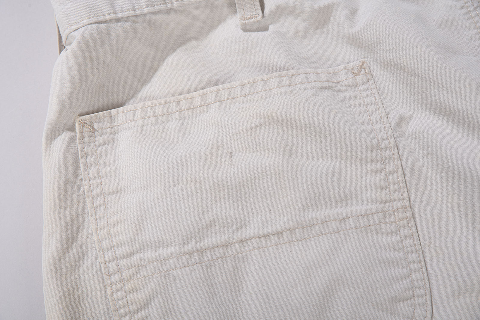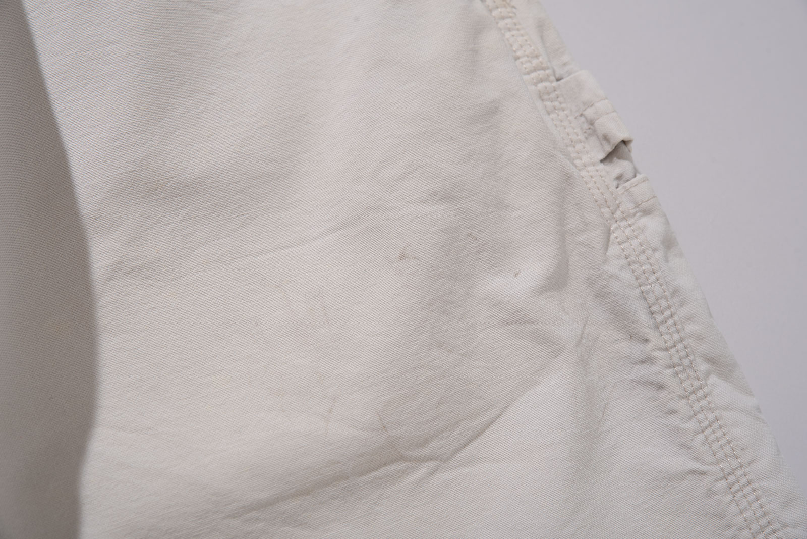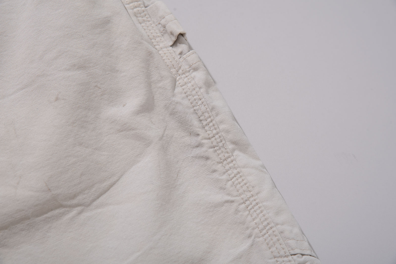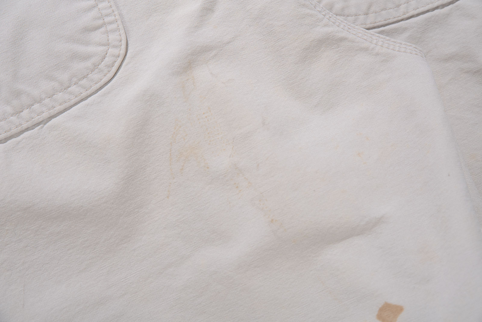 컬러는 순백보다는 약간 바랜 듯한 내추럴한 톤으로, 세탁과 사용에 의해 자연스럽게 물빠짐이 생긴 빈티지 특유의 분위기를 가지고 있습니다. 전반적으로 착용감이 느껴지며 곳곳에 생활 오염이 자리를 잡았습니다. 이러한 사용감은 제품의 빈티지한 무드를 더욱 강화해주는 요소로 작용합니다만, 이런 멋에 대한 이해가 있는 분께 권해드립니다. 여유있는 사이즈로 입고 되었어요. 실측 비교 후 구매부탁드립니다.
