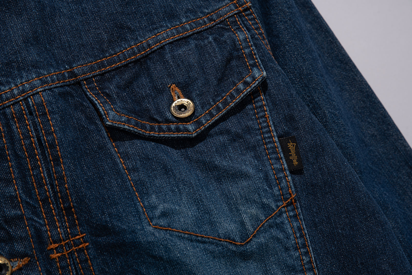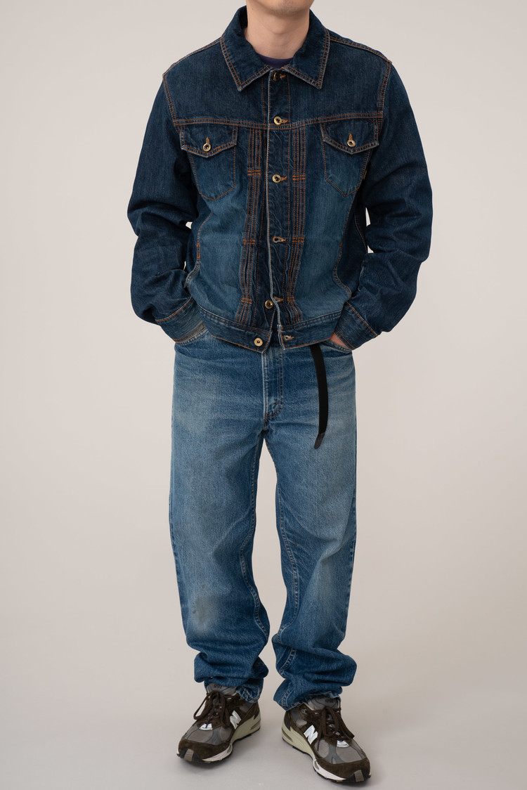 진청 계열의 다크 워시 컬러는 과하지 않게 자연스럽게 바랜 느낌이 특징이며, 전면과 후면의 바디 중심부에 비교적 밝게 워싱이 들어가 있어 은은한 그라데이션 효과를 줍니다. 전체적으로 오렌지 스티치로 포인트를 주었으며, 왼쪽 후면엔 빌라봉 시그니처 자수 로고가 더해져 브랜드의 존재감을 강조합니다.
