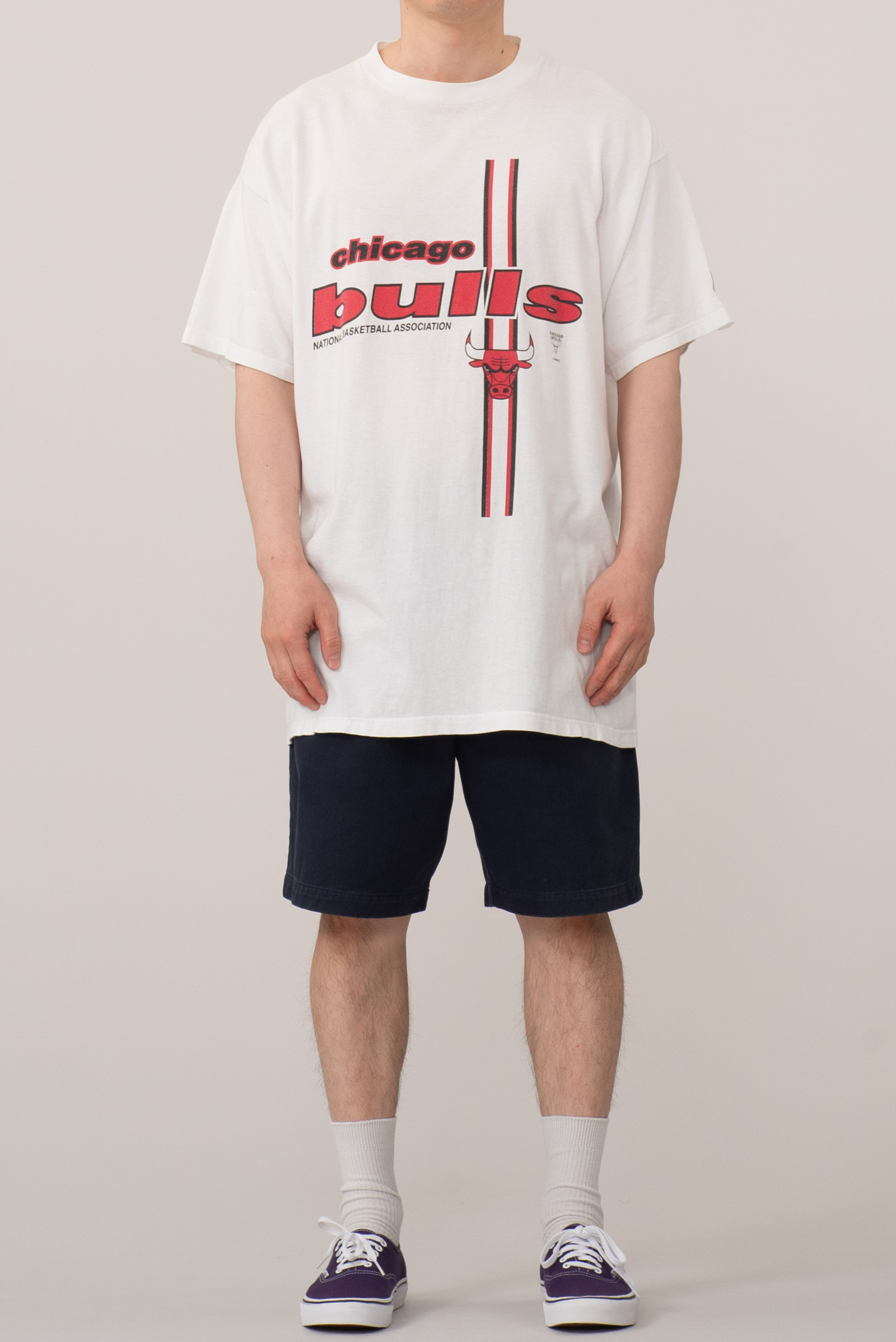 이 티셔츠는 당시 유행했던 중앙 정렬된 세로 스트라이프와 팀 로고를 조합한 전형적인 올드스쿨 스포츠 프린팅을 따르고 있습니다. ‘Chicago Bulls’ 팀명과 상징적인 붉은 황소 엠블럼이 전면에 큼직하게 배치되어 있으며, 팀 컬러인 레드 & 블랙이 대비감 있게 활용된 디자인이 특징이에요.