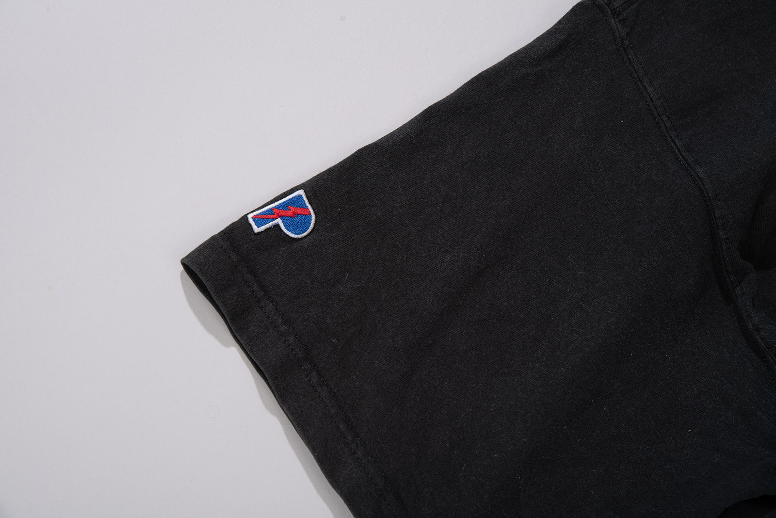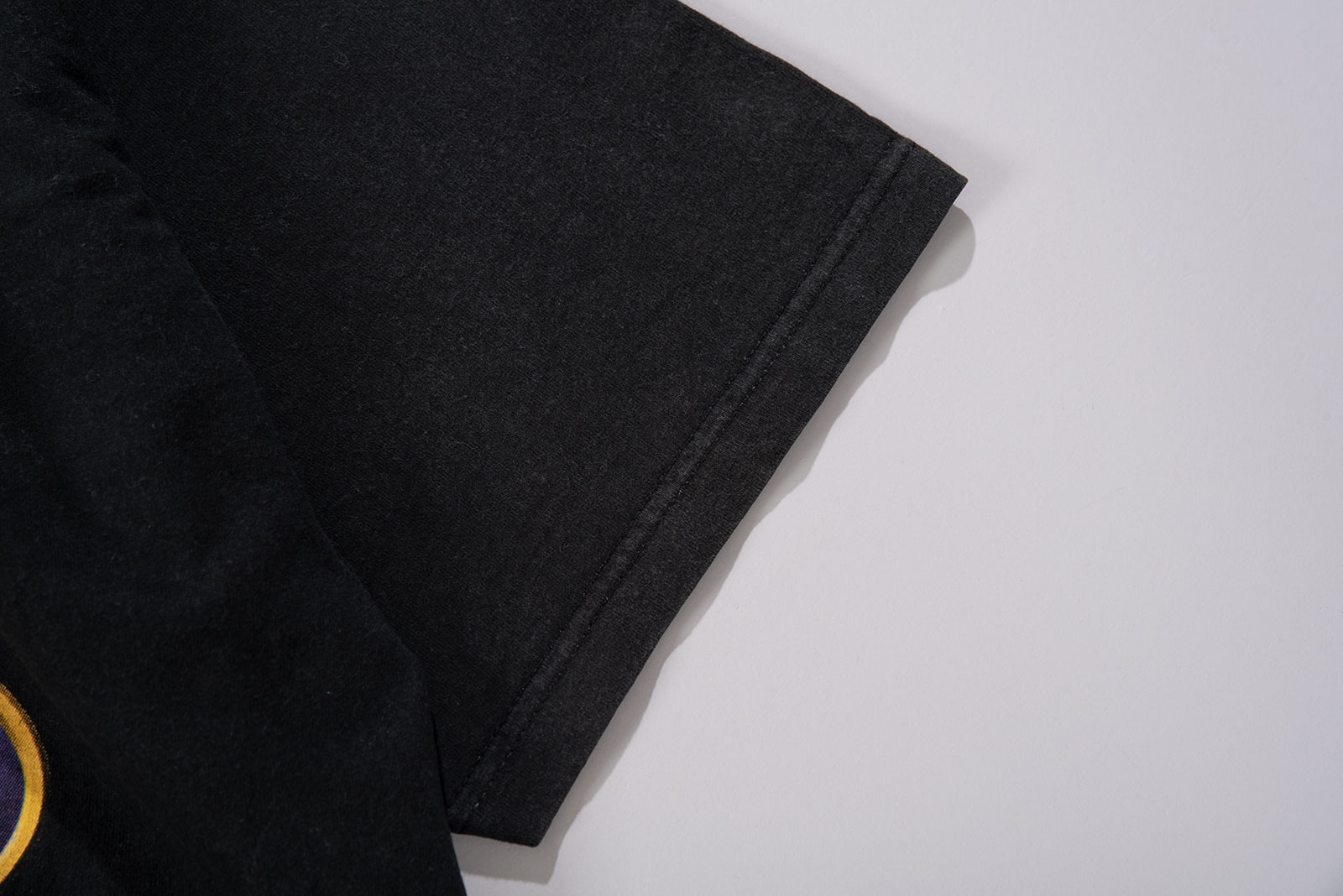 그래픽은 선명한 보라-노랑 컬러의 레이커스 로고와 함께 코비의 드라이브 장면을 큼직하게 프린팅했고, 당시 특유의 투박하고 거친 일러스트 감성이 오히려 요즘 트렌디한 빈티지 스타일과 잘 맞아떨어집니다. 바디는 굵직한 코튼으로, 원단감이 단단하고 넥라인 립도 잘 살아있습니다. 소매 끝에는 브랜드 특유의 번개 로고 자수가 들어가 있어서, 프로플레이어 특유의 오리지널리티를 더해줍니다.