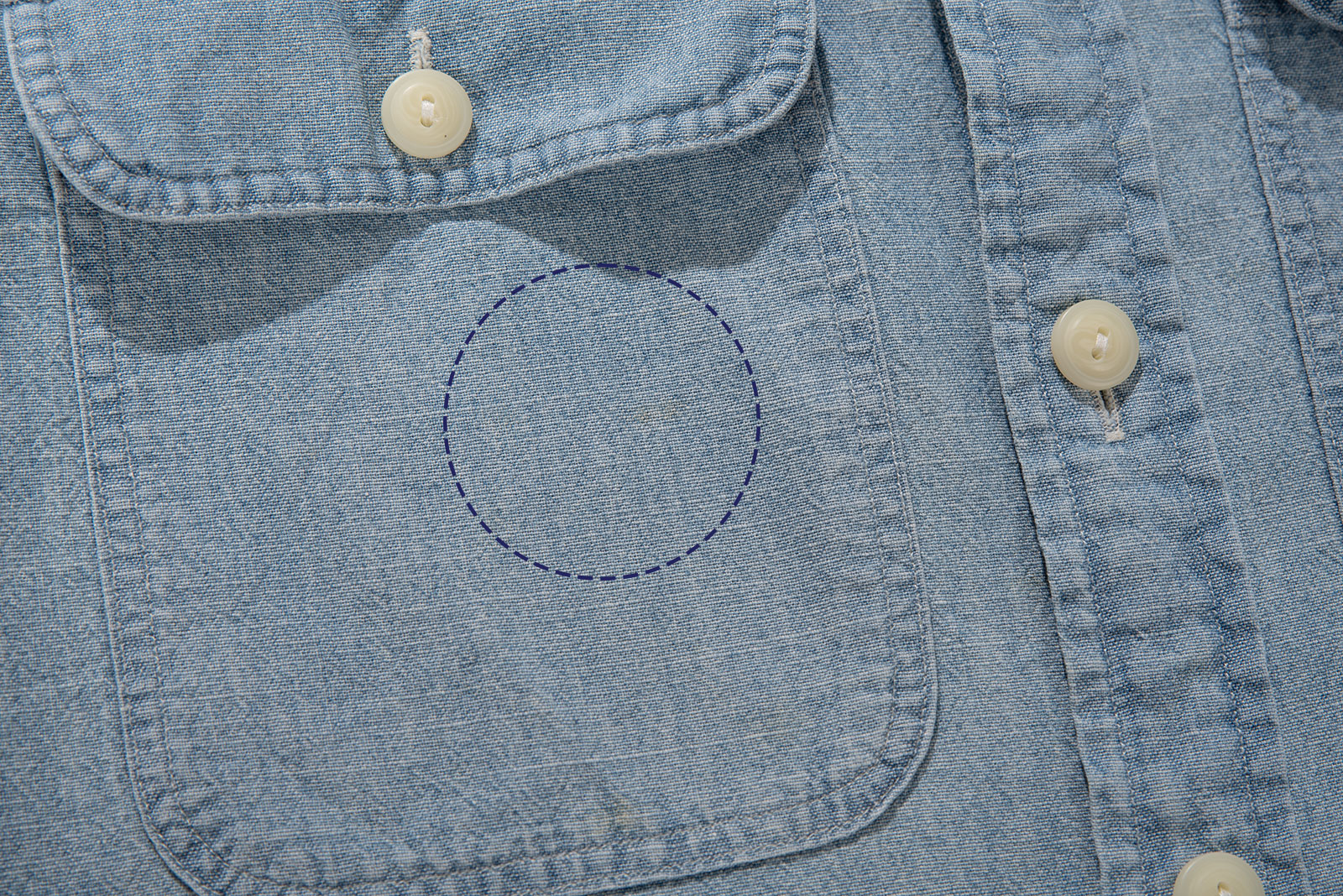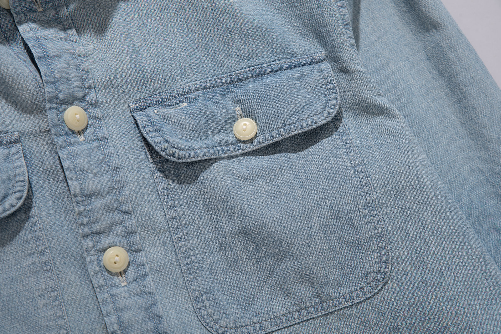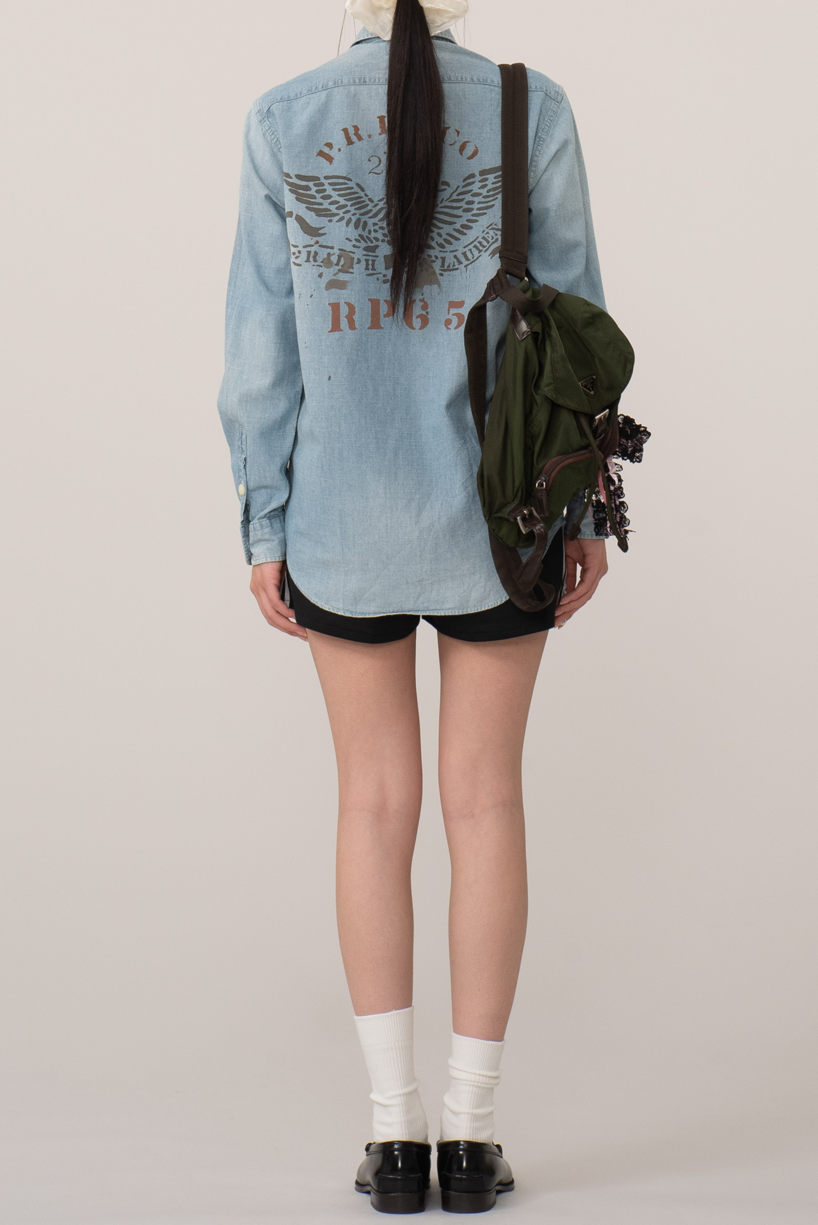 폴로 랄프로렌은 항상 ‘미국’을 옷으로 번역해온 브랜드입니다. 그 미국은 단지 현대적이고 도시적인 모습만이 아닌, 전후 시대의 산업노동자, 고속도로를 달리는 장거리 트럭커, 베트남전을 겪고 돌아온 베테랑, 그리고 작은 도시의 소년소녀들이 입던 옷까지 포괄하죠. 이 데님 셔츠는 그러한 문화적 이미지의 집합체로 보여집니다. 워크웨어와 밀리터리웨어, 웨스턴 무드가 겹쳐진 그 중간 지점이랄까요. 특히 등판의 독수리 스텐실은 미군 창고나 탄약 박스, 비행 부대의 식별 마크에서 따온 듯한 그래픽으로, 폴로가 자주 사용하는 ‘가공 된 군용 아이덴티티’를 다시 한번 직조해냈습니다.