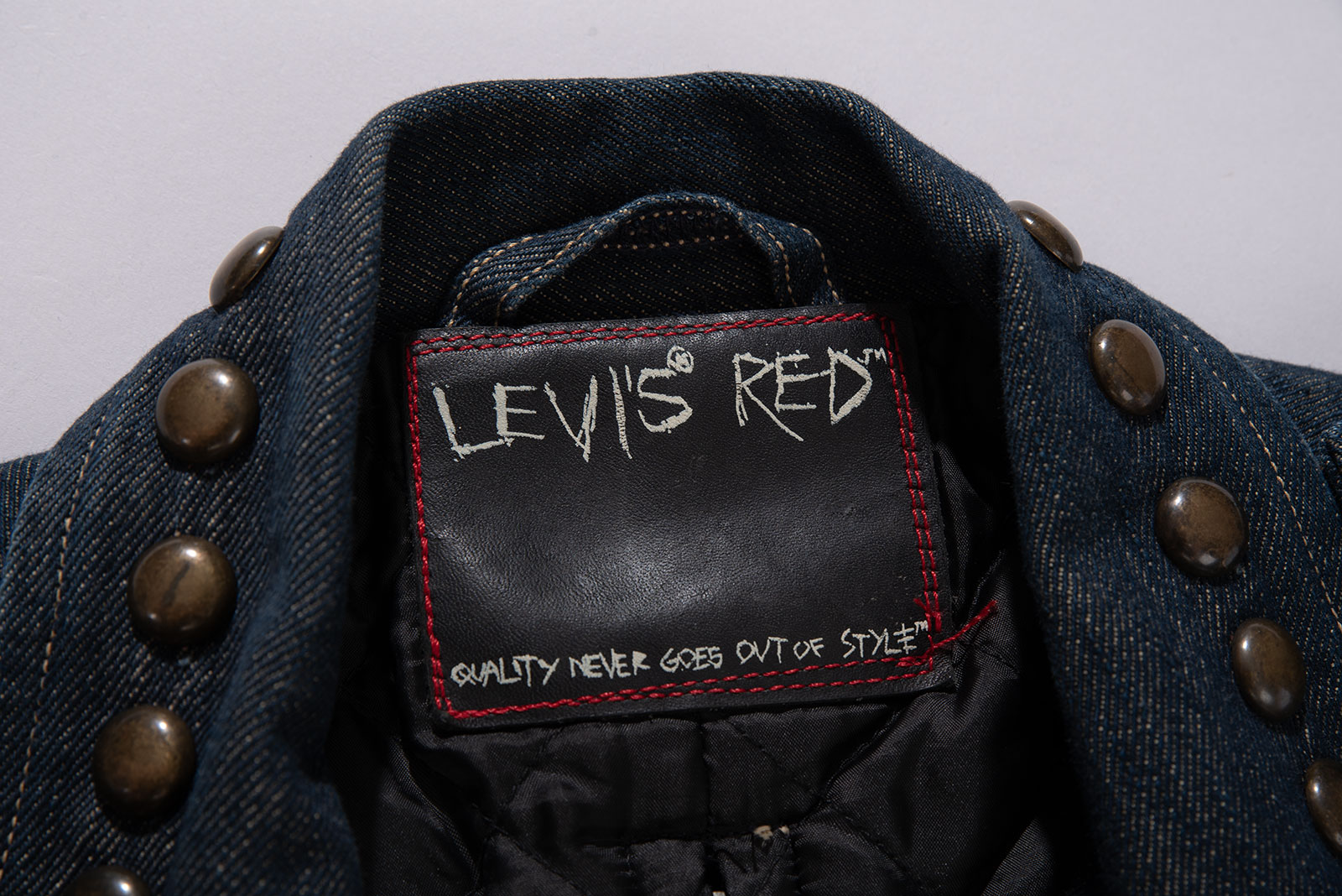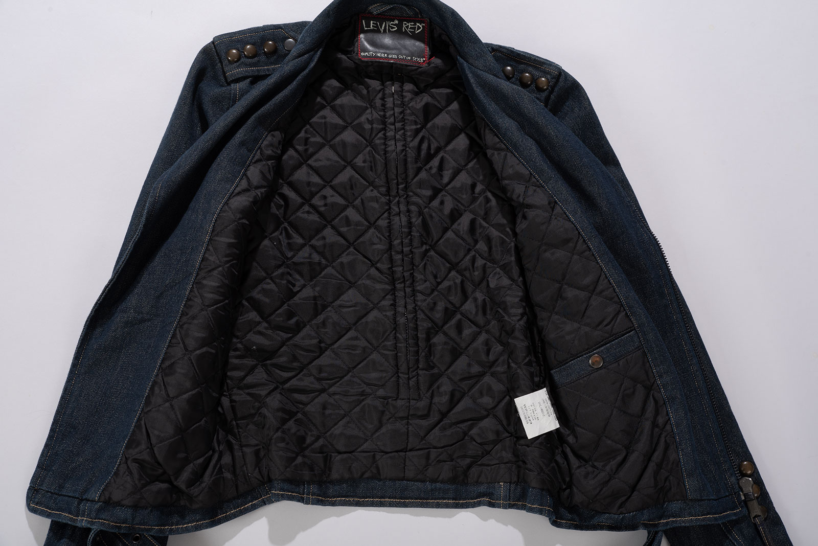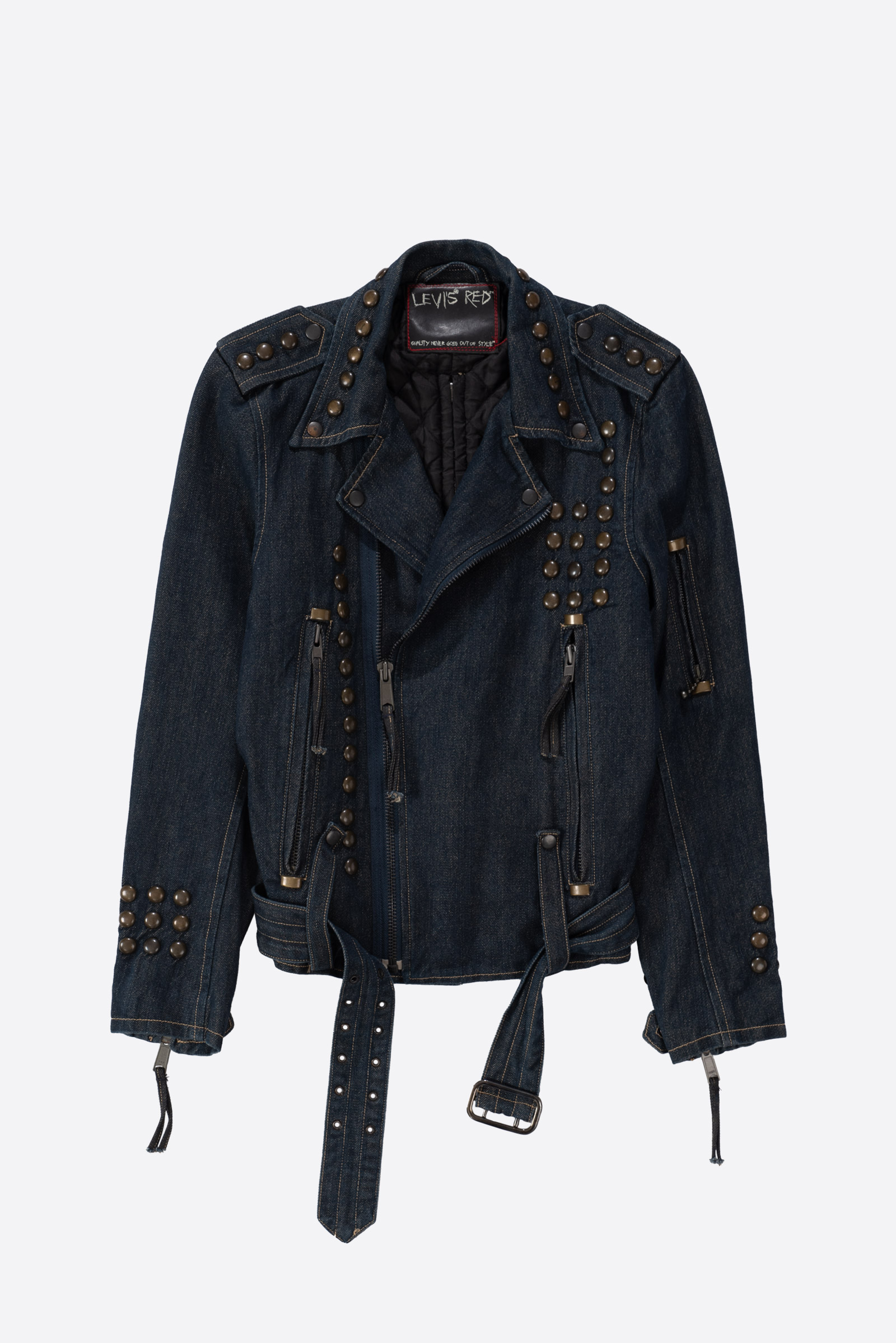 리바이스가 본격적으로 실험적인 디자인을 시도하던 시기, 리바이스 유럽에서 독립적인 실험실처럼 운영되던 컬렉션이 바로 Levi’s RED 였습니다.. 1999년 런칭 이후, RED는 단순한 의류 라인을 넘어 리바이스의 과거 유산을 비틀고 재해석하는 실험적 시리즈로 자리 잡았고, 이 제품은 그 RED의 초창기 플래그십 모델 중 하나로, 당시 리테일가도 상당했던 고급 라인업에 속하지요. 데님 소재로 제작된 바이커 자켓 형태인데, 같은 실루엣의 가죽 버전도 병행 출시됐습니다.