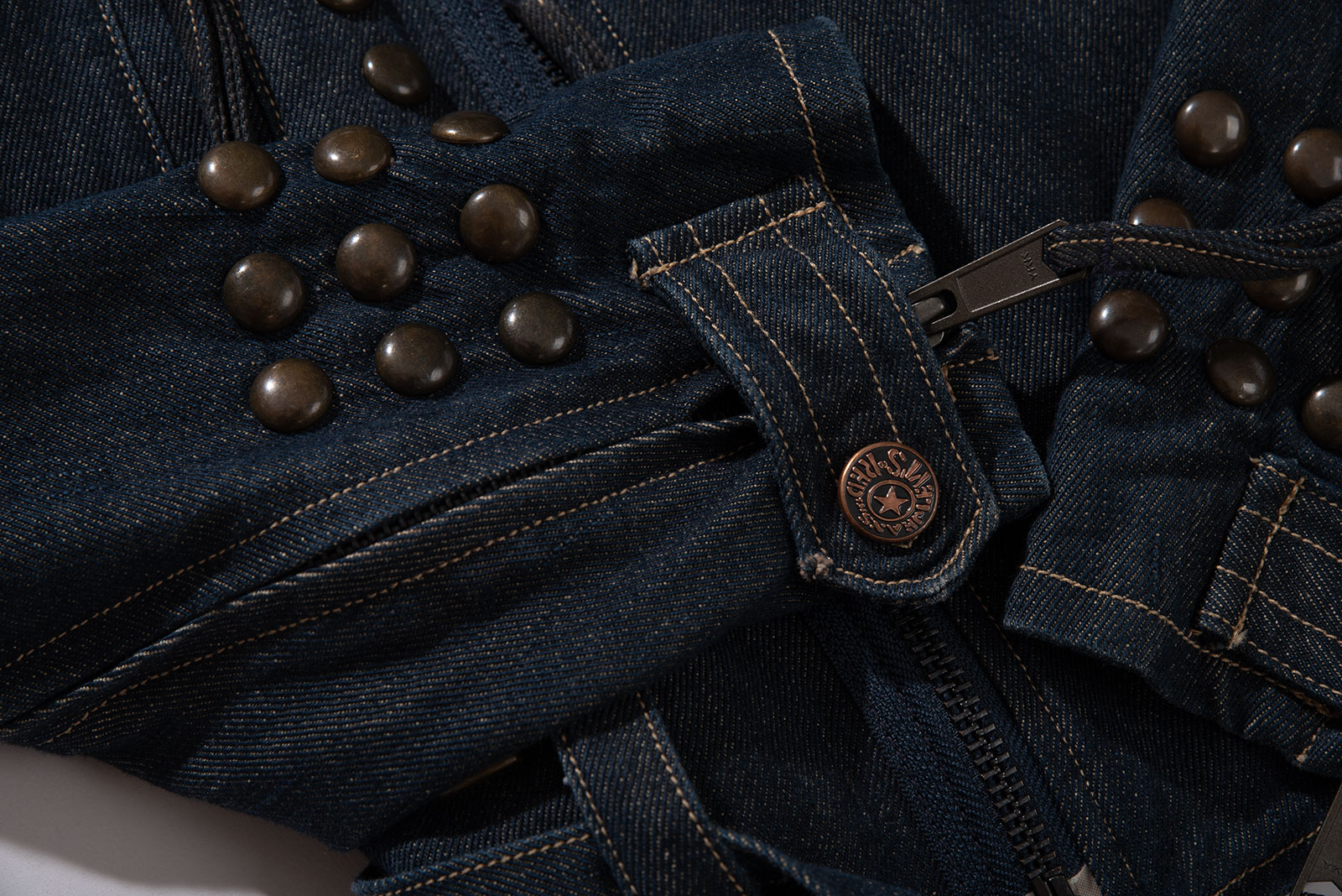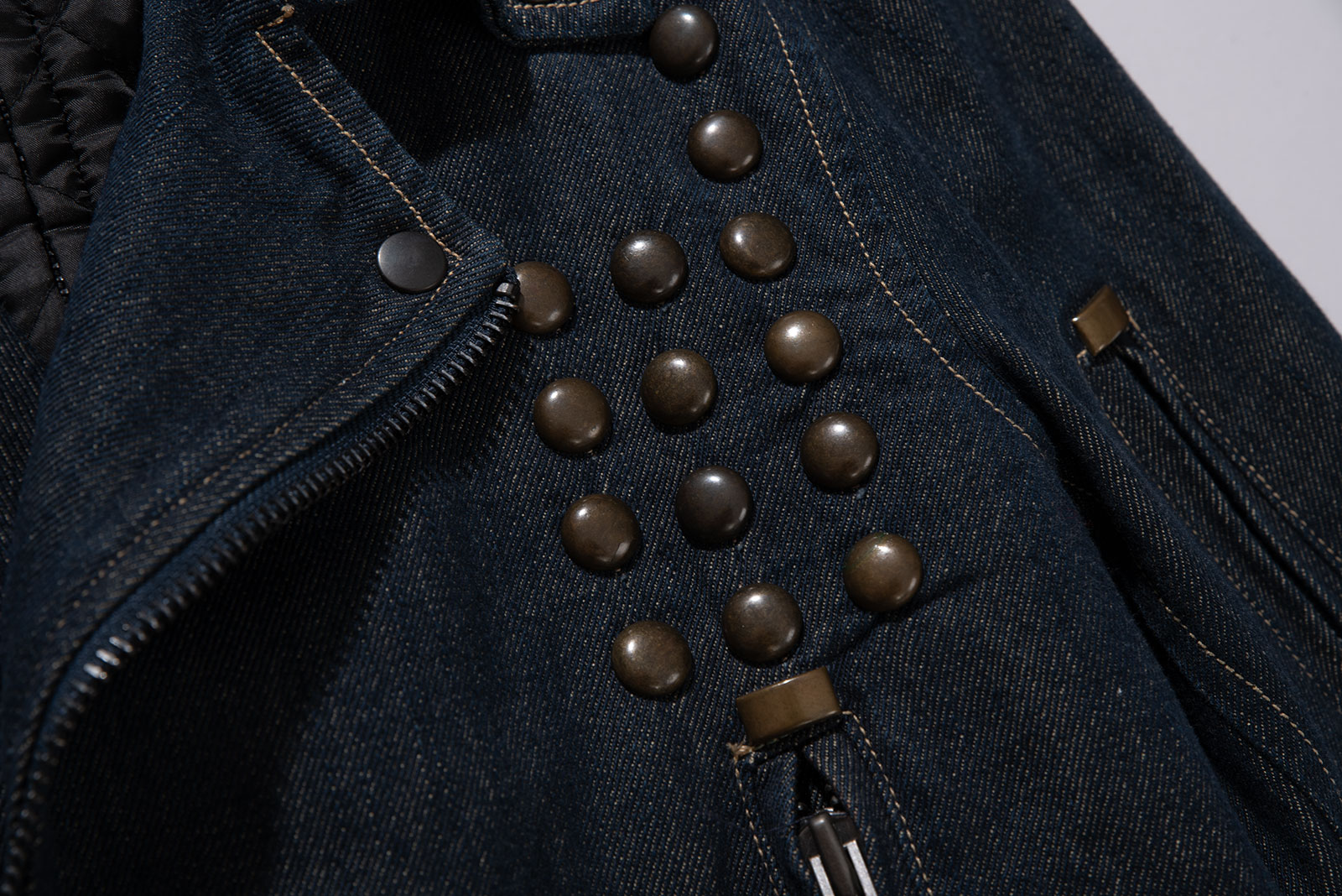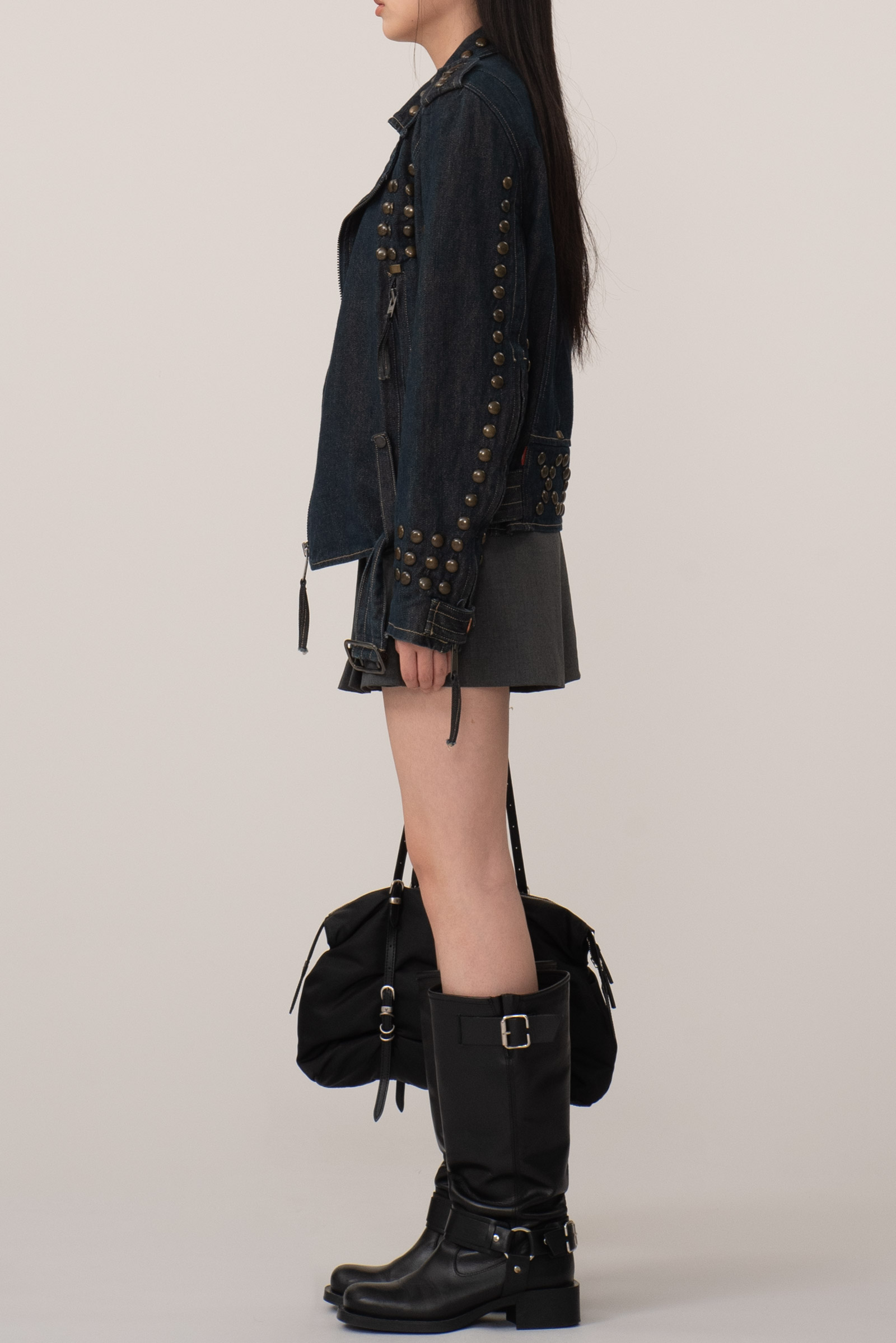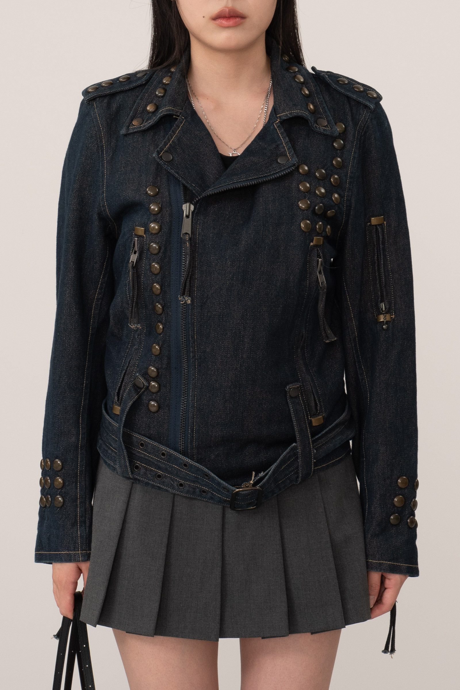 당시 유럽 내 고급 봉제라인으로 운영되던 크로아티아에서 생산된 피스입니다. 안감 전체에 다이아몬드 퀼팅 처리가 되어 있으며 묵직한 스터드와 큼지막한 지퍼로 강인한 외형을 완성하였습니다. 전통적인 모터사이클 재킷을 닮았지만, 디테일은 완전히 새롭게 변형됐어요. 전면을 따라 흐르는 굵직한 리벳 디테일과 벨트, 이중 지퍼, 소매 지퍼, 그리고 어깨 견장까지, 강한 아이덴티티를 갖춘 스타일입니다. 데님 자켓이지만, 구조와 감성은 오히려 밀리터리와 펑크의 경계를 오가고 있다고 할까요?