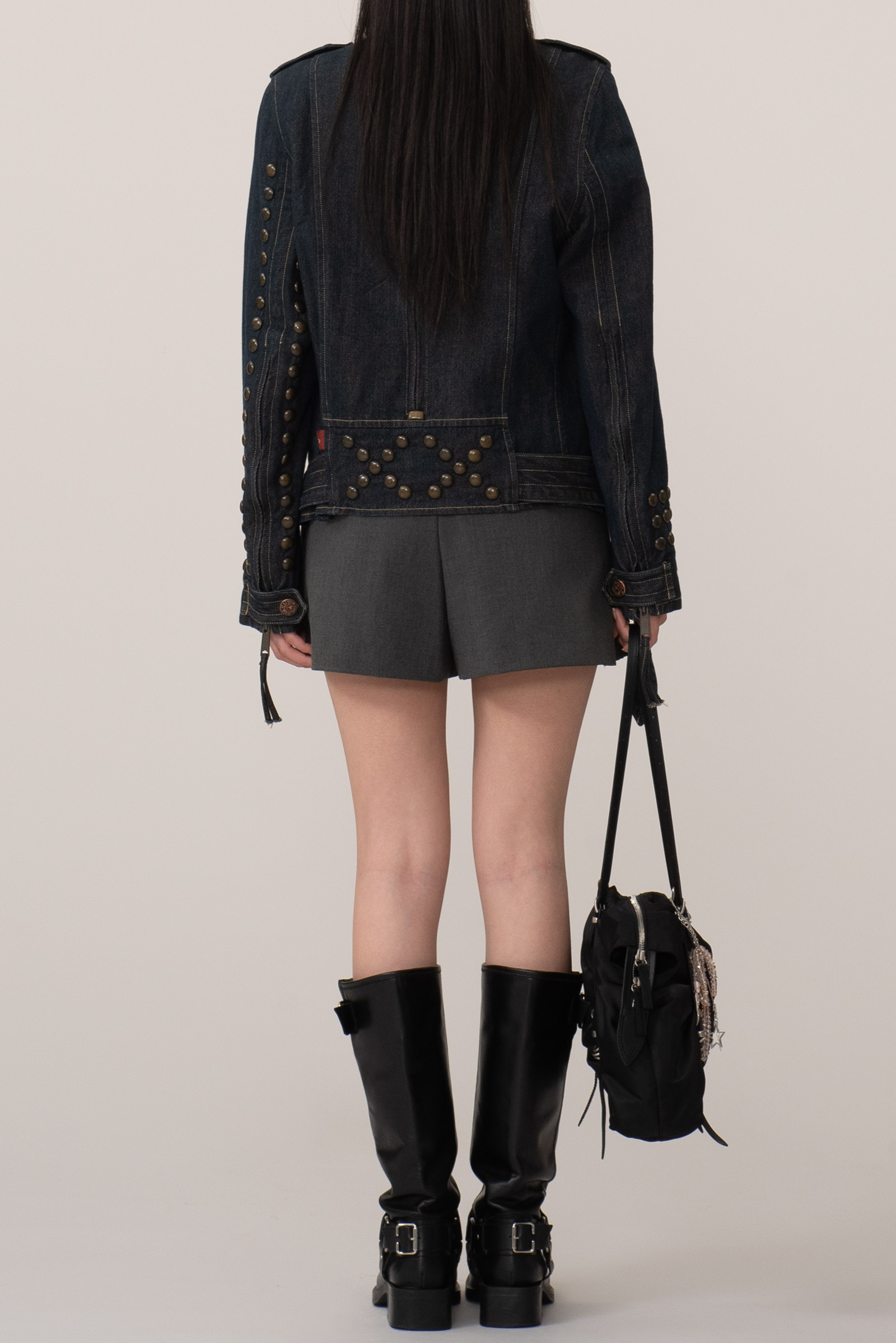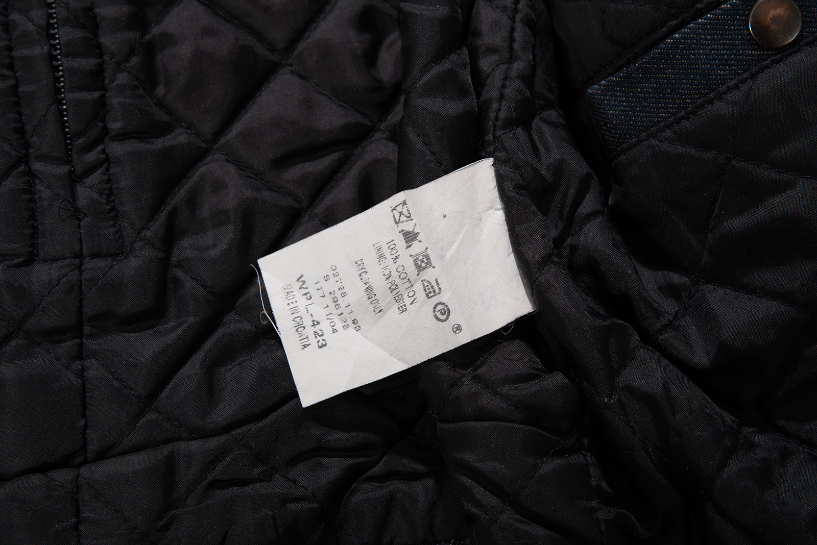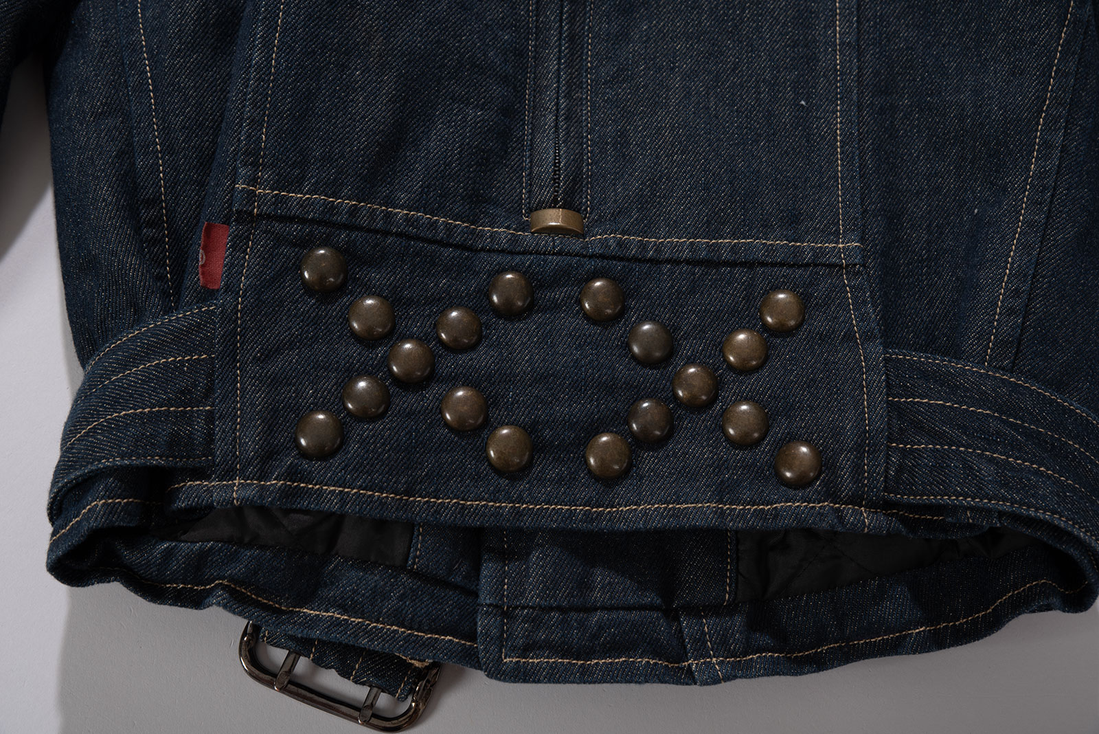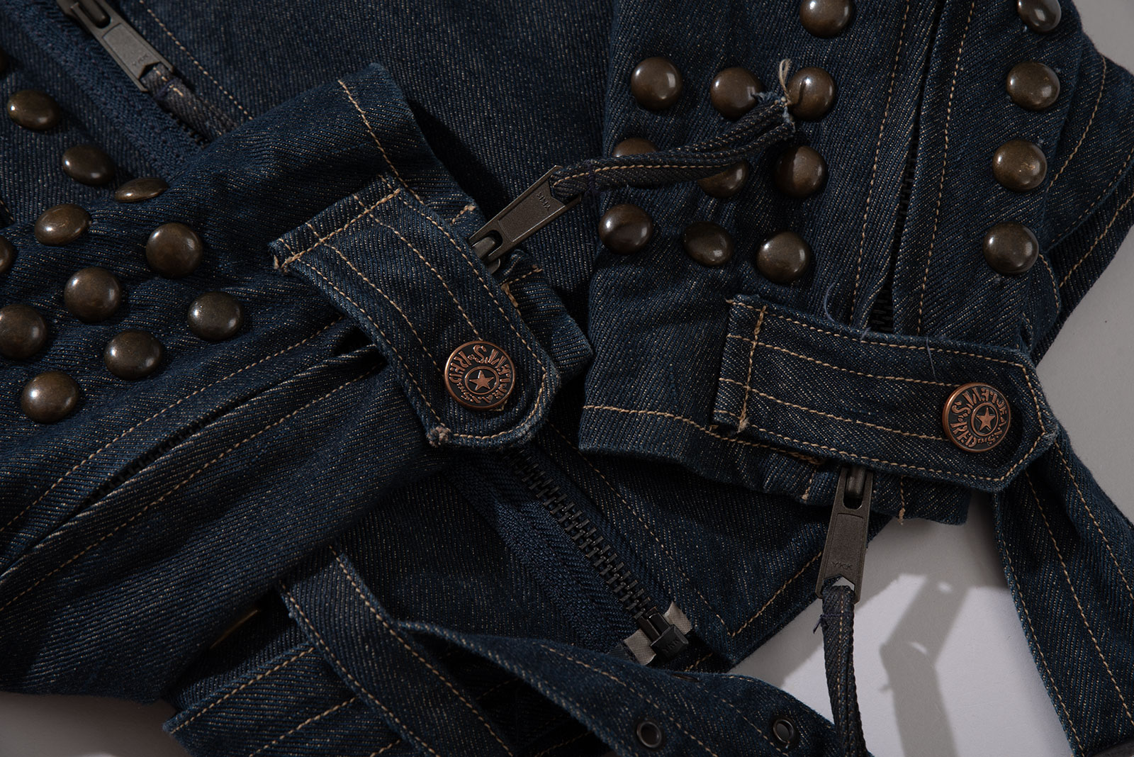 당시 유럽 내 고급 봉제라인으로 운영되던 크로아티아에서 생산된 피스입니다. 안감 전체에 다이아몬드 퀼팅 처리가 되어 있으며 묵직한 스터드와 큼지막한 지퍼로 강인한 외형을 완성하였습니다. 전통적인 모터사이클 재킷을 닮았지만, 디테일은 완전히 새롭게 변형됐어요. 전면을 따라 흐르는 굵직한 리벳 디테일과 벨트, 이중 지퍼, 소매 지퍼, 그리고 어깨 견장까지, 강한 아이덴티티를 갖춘 스타일입니다. 데님 자켓이지만, 구조와 감성은 오히려 밀리터리와 펑크의 경계를 오가고 있다고 할까요?