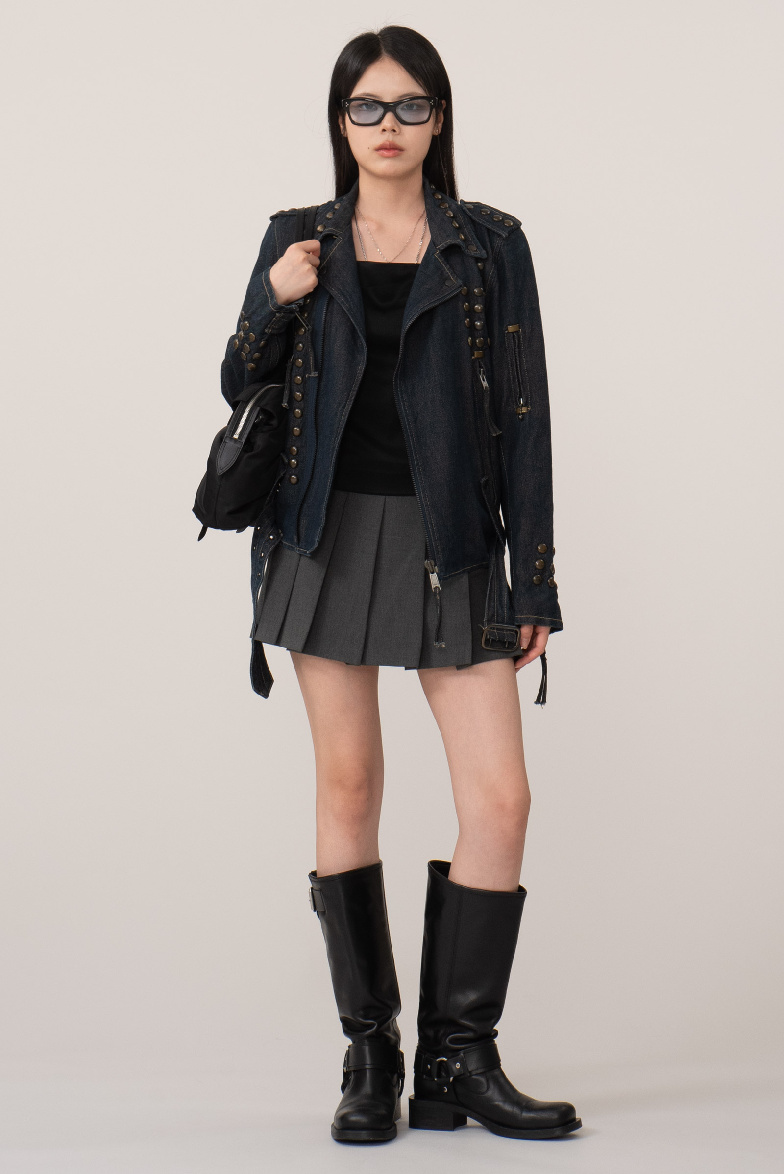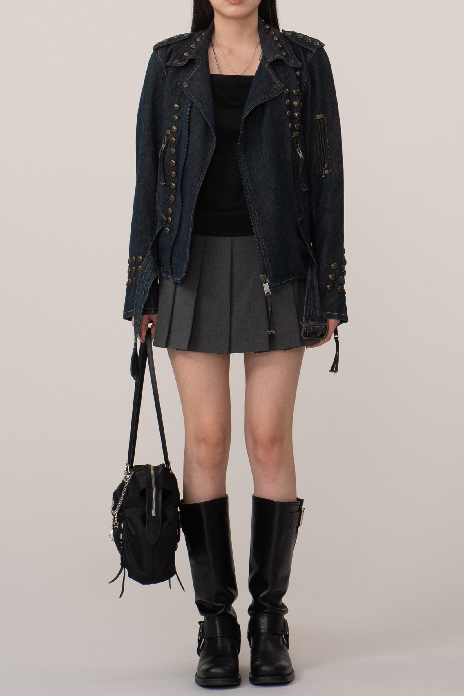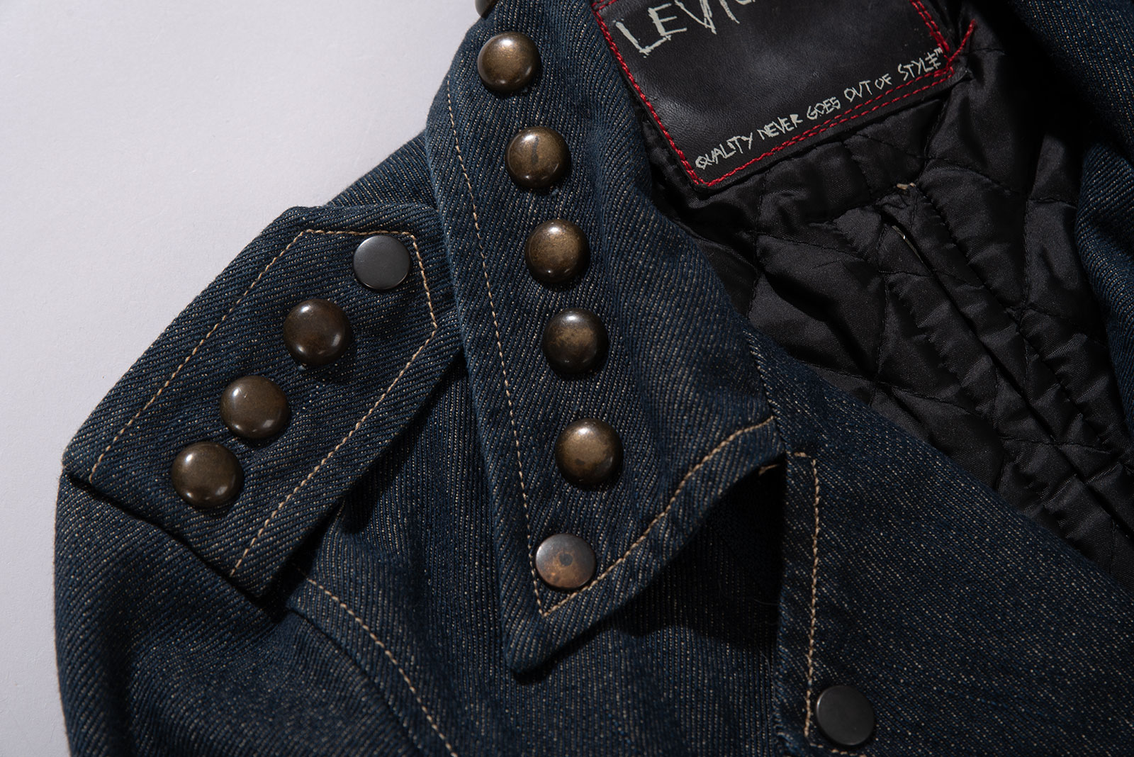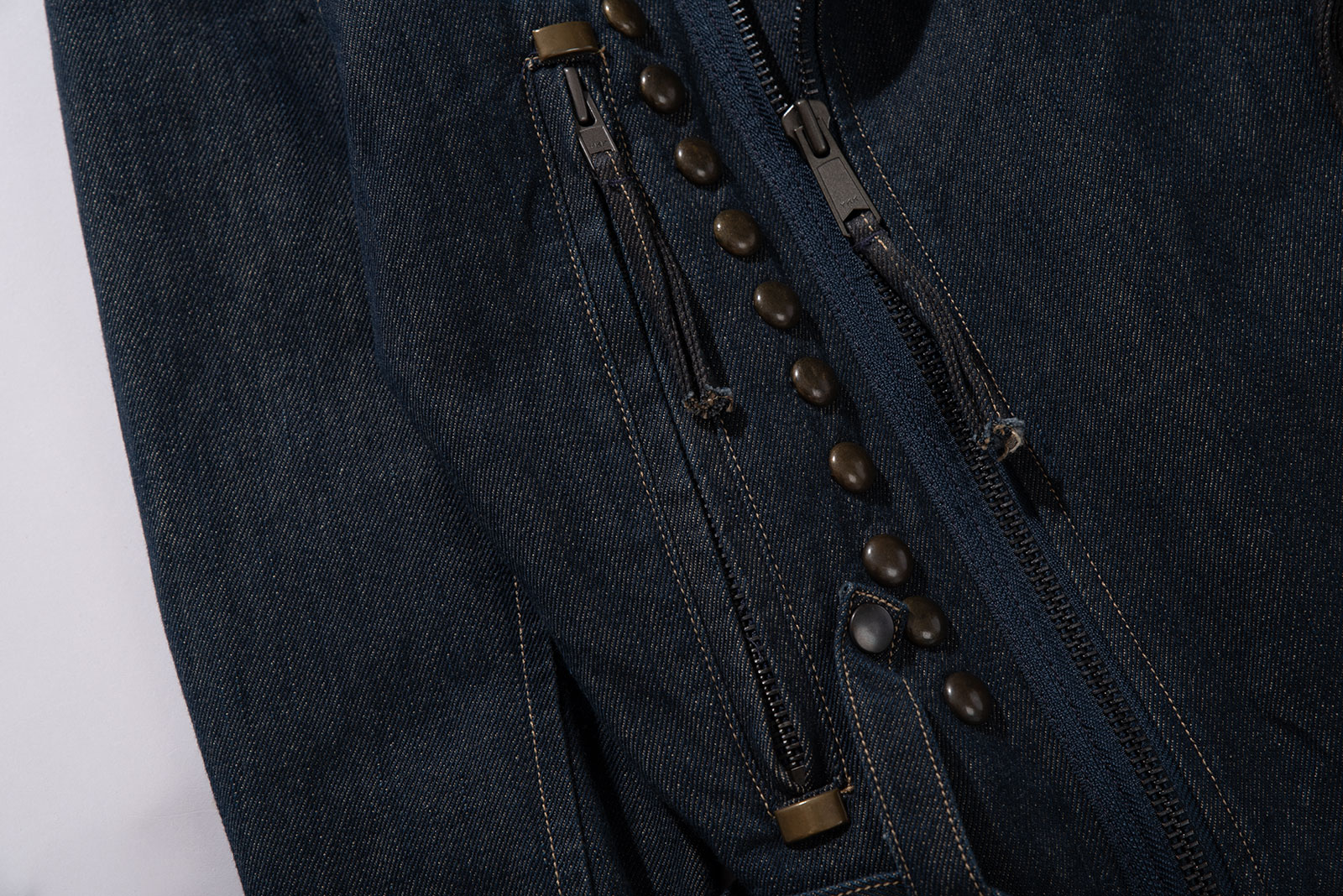 당시 유럽 내 고급 봉제라인으로 운영되던 크로아티아에서 생산된 피스입니다. 안감 전체에 다이아몬드 퀼팅 처리가 되어 있으며 묵직한 스터드와 큼지막한 지퍼로 강인한 외형을 완성하였습니다. 전통적인 모터사이클 재킷을 닮았지만, 디테일은 완전히 새롭게 변형됐어요. 전면을 따라 흐르는 굵직한 리벳 디테일과 벨트, 이중 지퍼, 소매 지퍼, 그리고 어깨 견장까지, 강한 아이덴티티를 갖춘 스타일입니다. 데님 자켓이지만, 구조와 감성은 오히려 밀리터리와 펑크의 경계를 오가고 있다고 할까요?